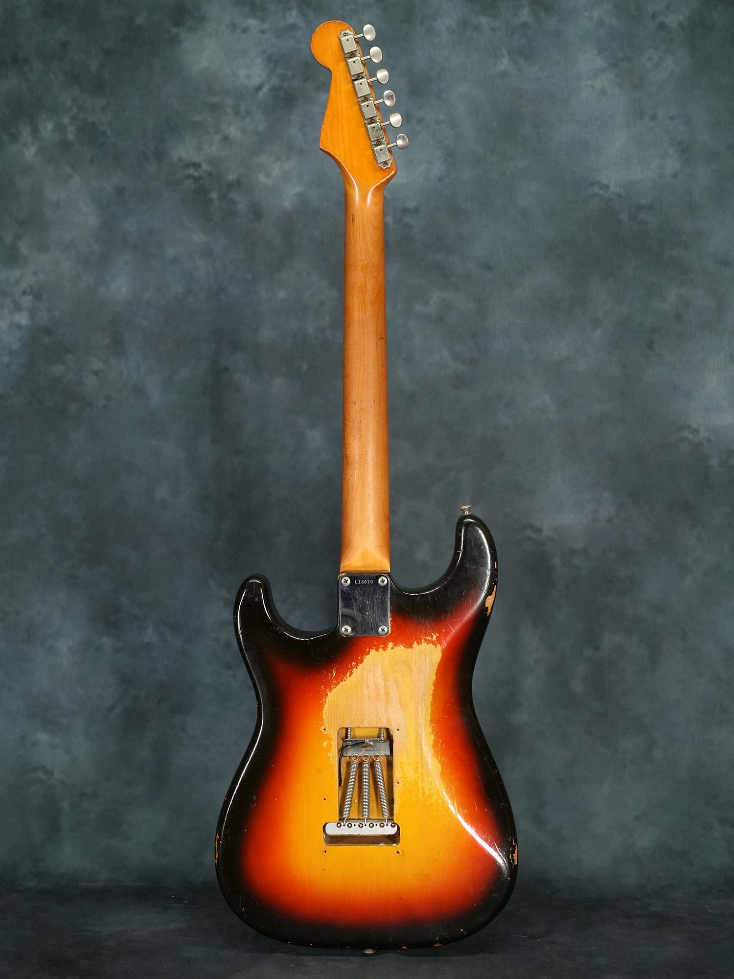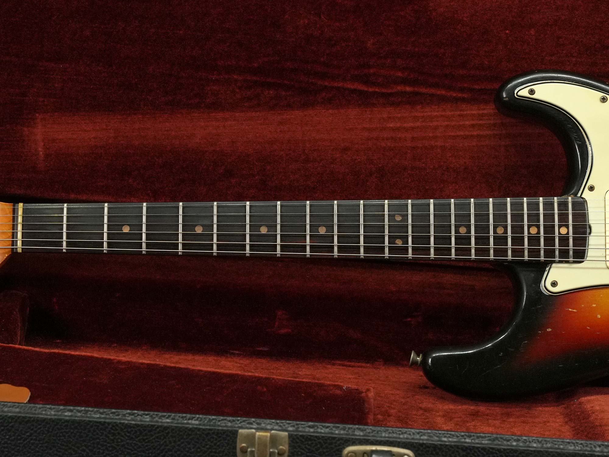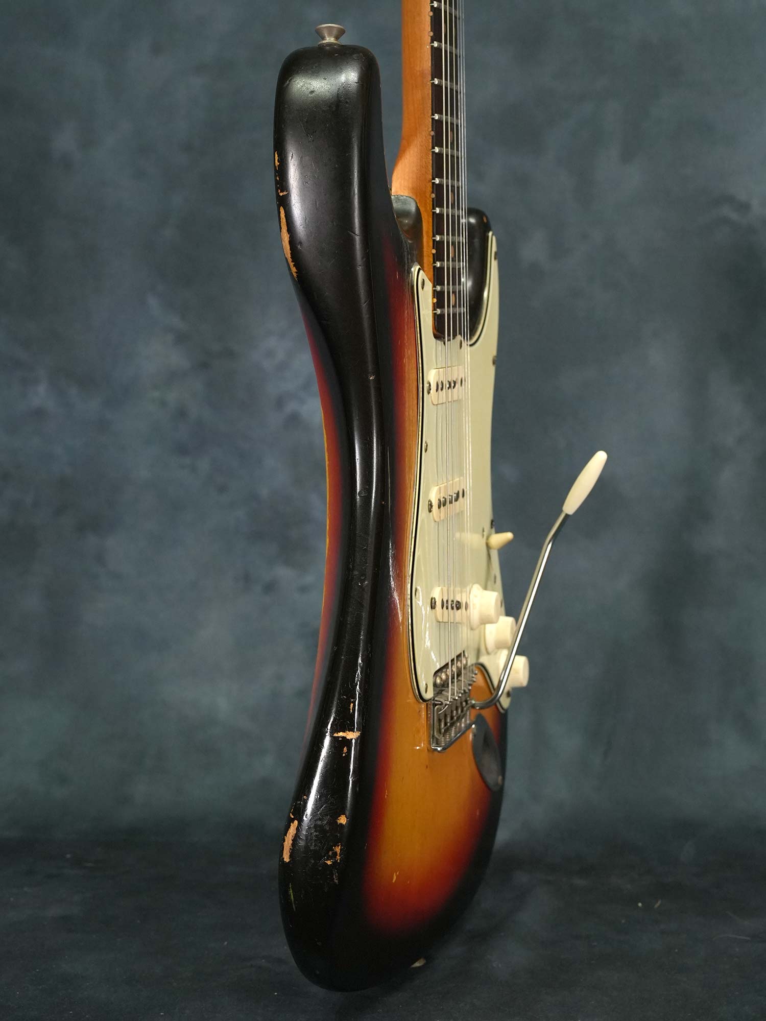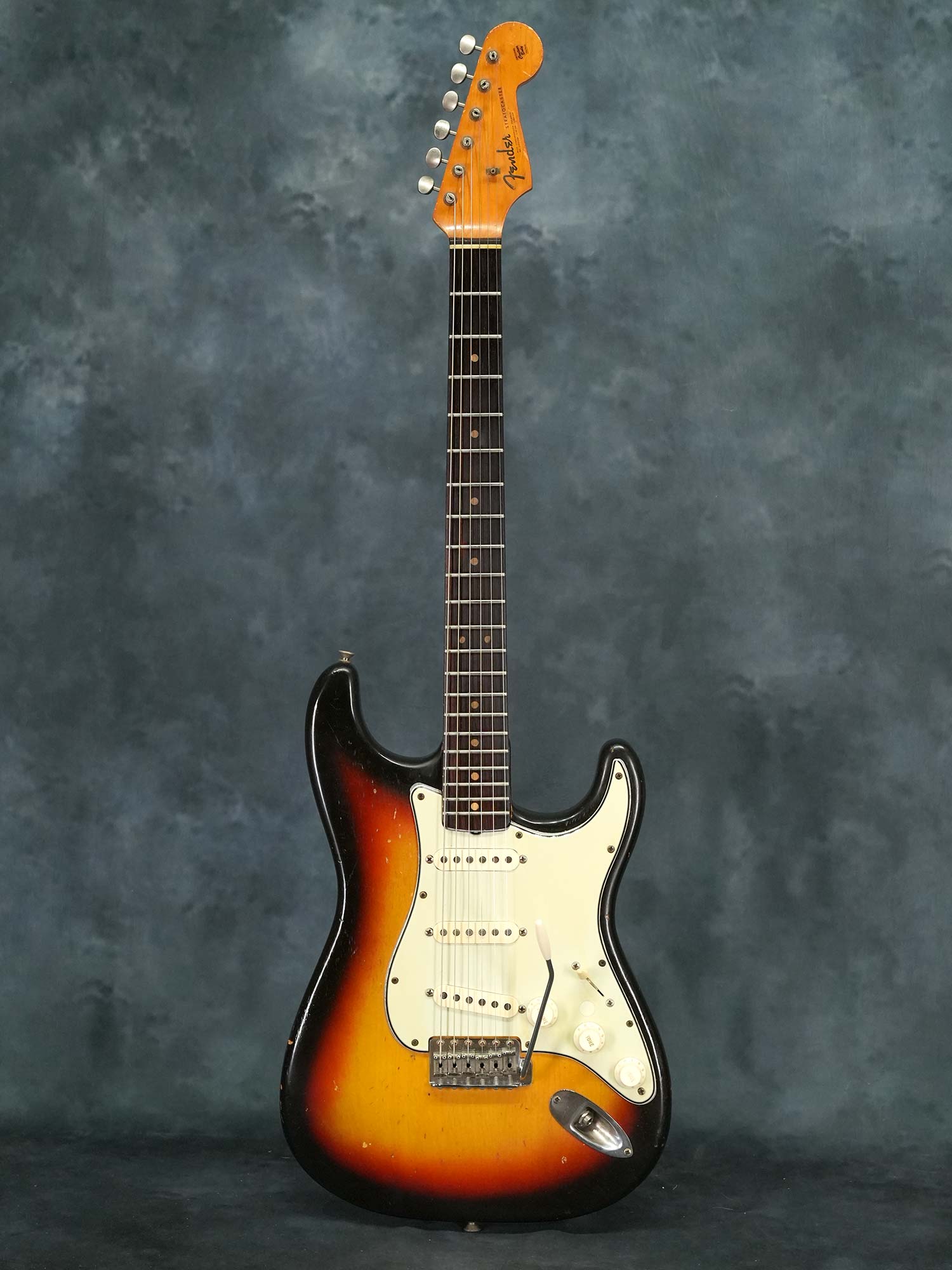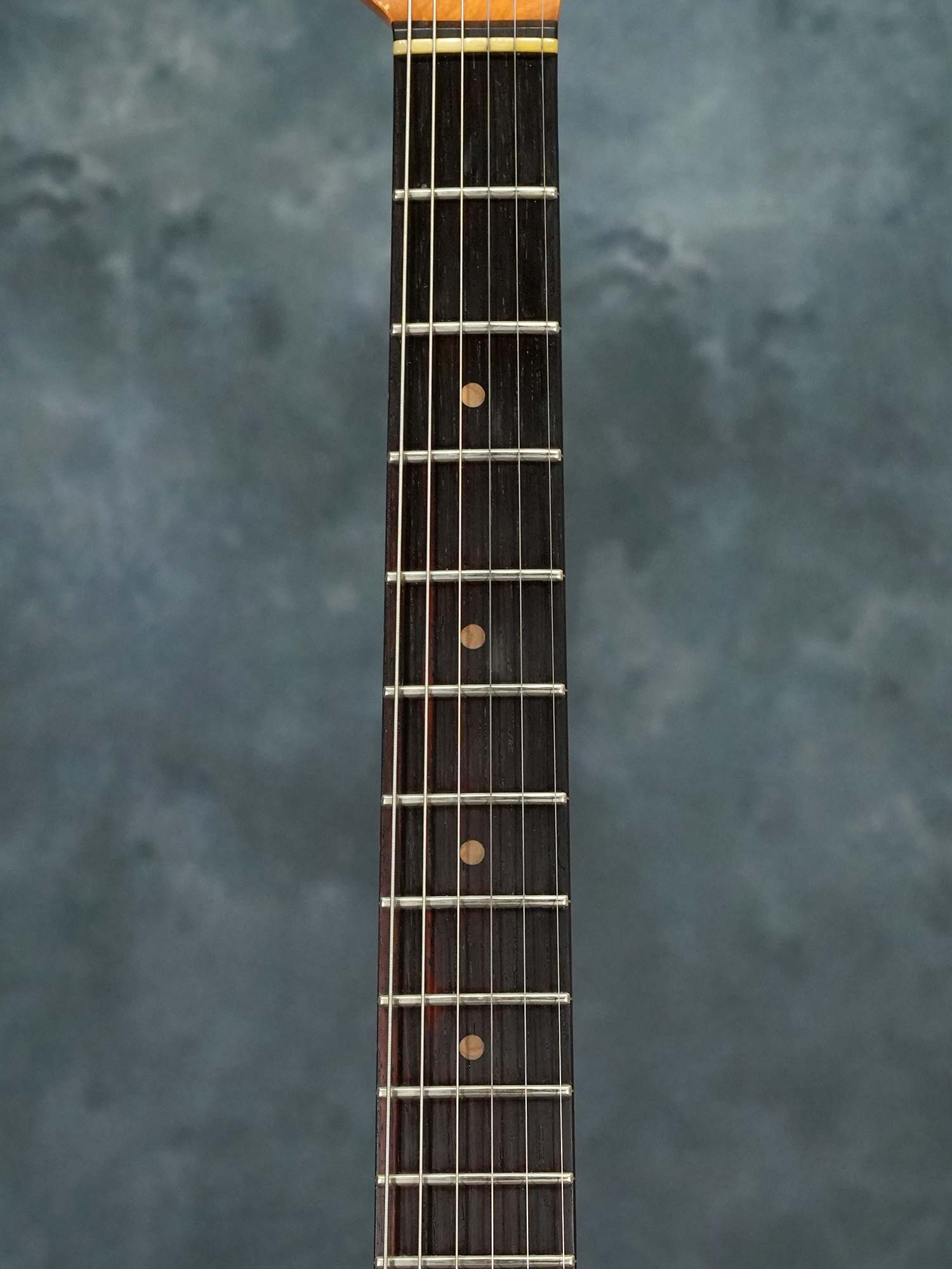 スモールヘッドにスパゲティロゴ1963年ネックと1965年頃ボディ、近年製のパーツで組み上げられつつ枯れた音色と渋いルックスが格好良くプレイヤー向けのFender Stratocaster。1963年デイトのスモールヘッド&スパゲティロゴメイプルネック&ラウンドラミネイトされたハカランダ指板、1965年頃のアルダーボディ、ピックアップはフロントがブラックボビン・センターはRaw Vintage・リアはSerymour Duncan Antiquity、5-Wayレバースイッチ、ポット類・ペグ・ブリッジ・ノブ類も全て気年製に交換されており、1963年製のネック&1965年頃製のボディに近年製のパーツで組み上げられています。