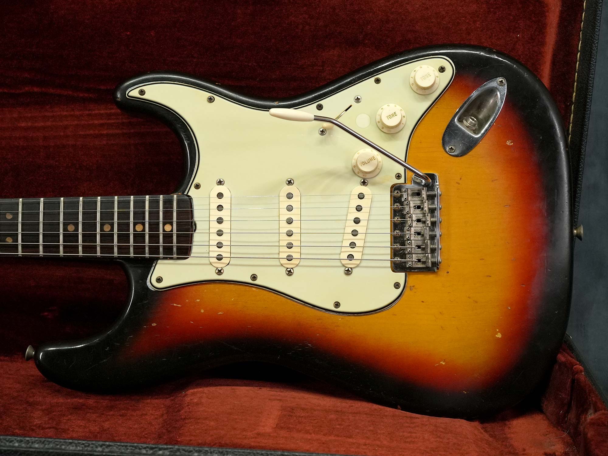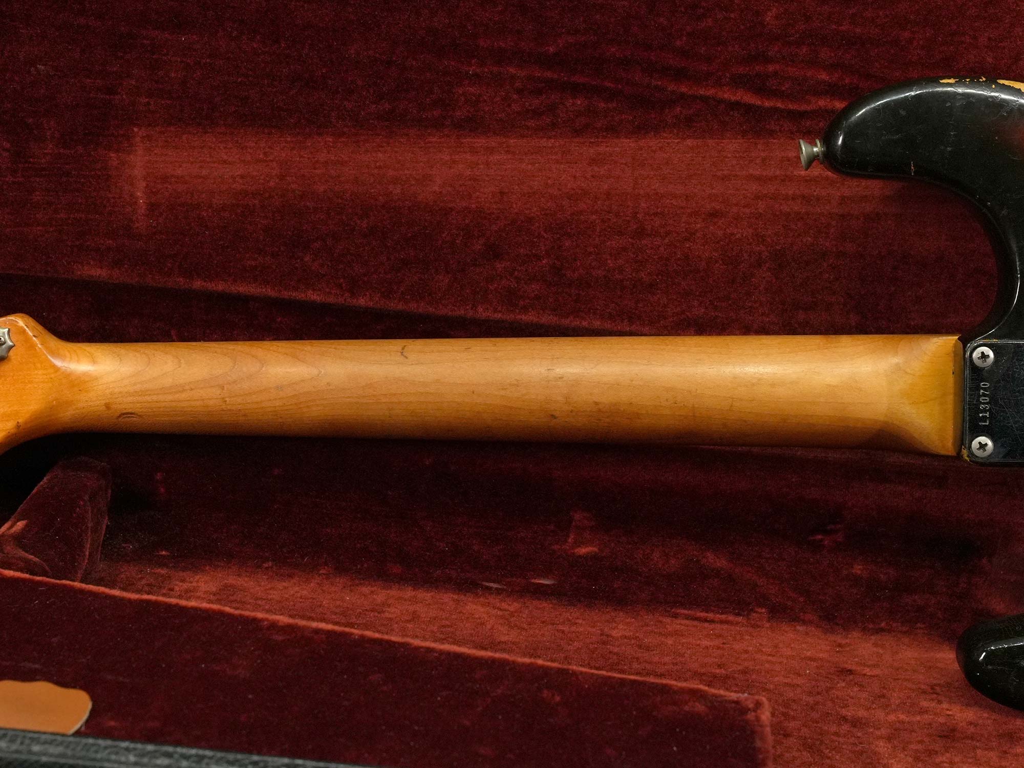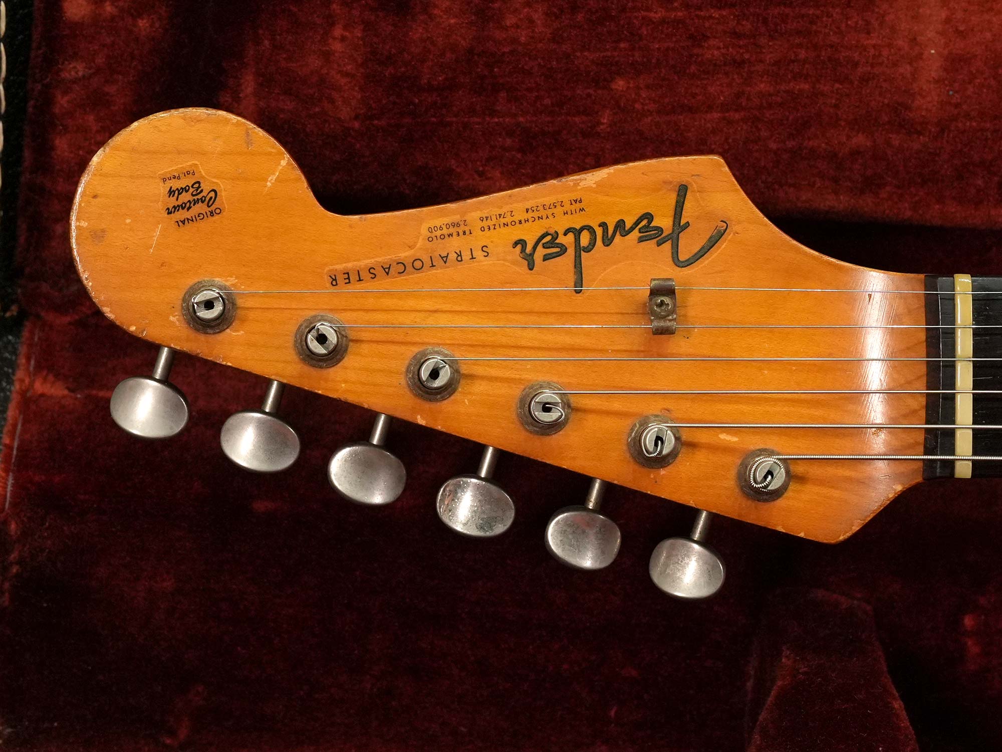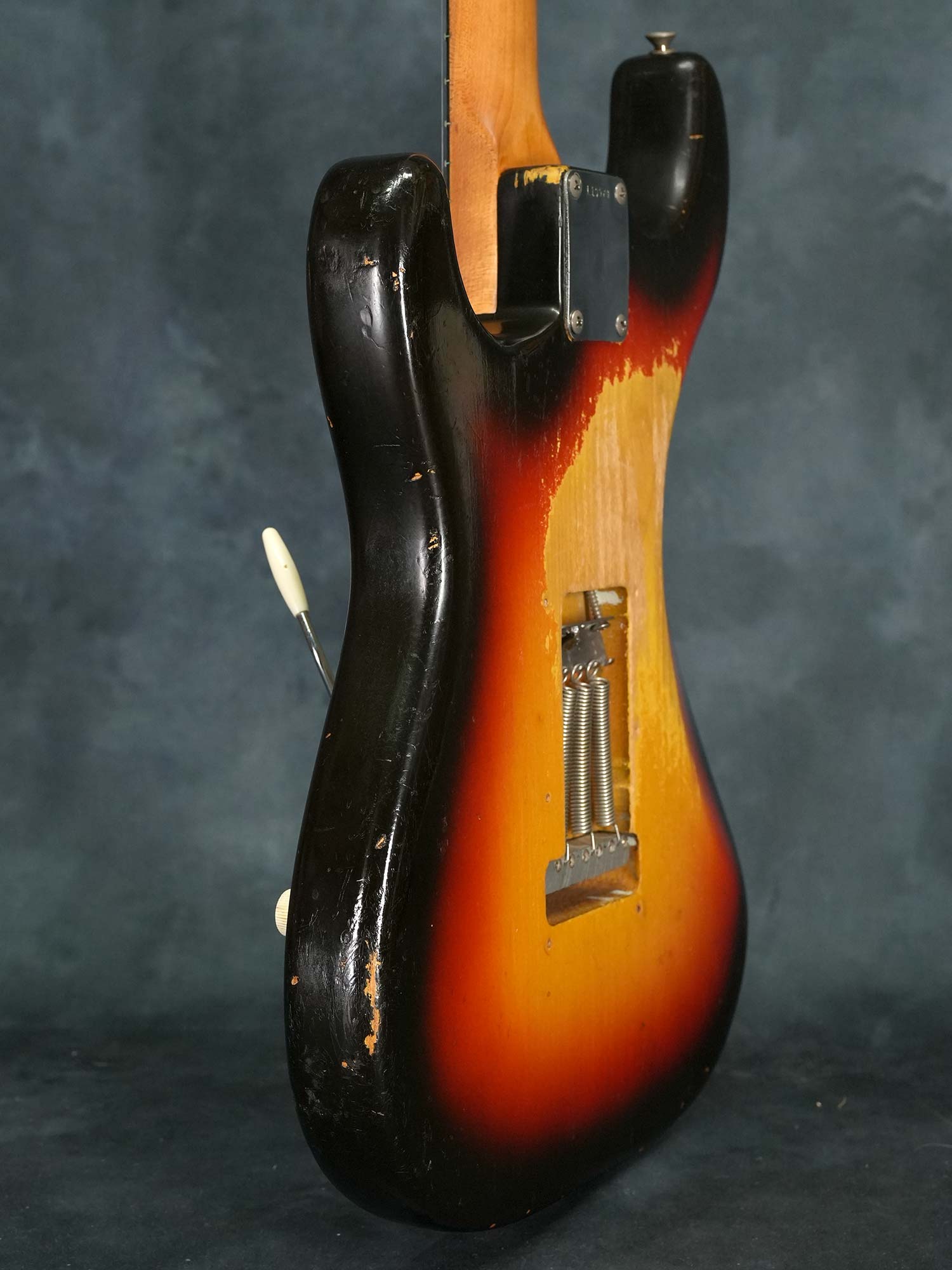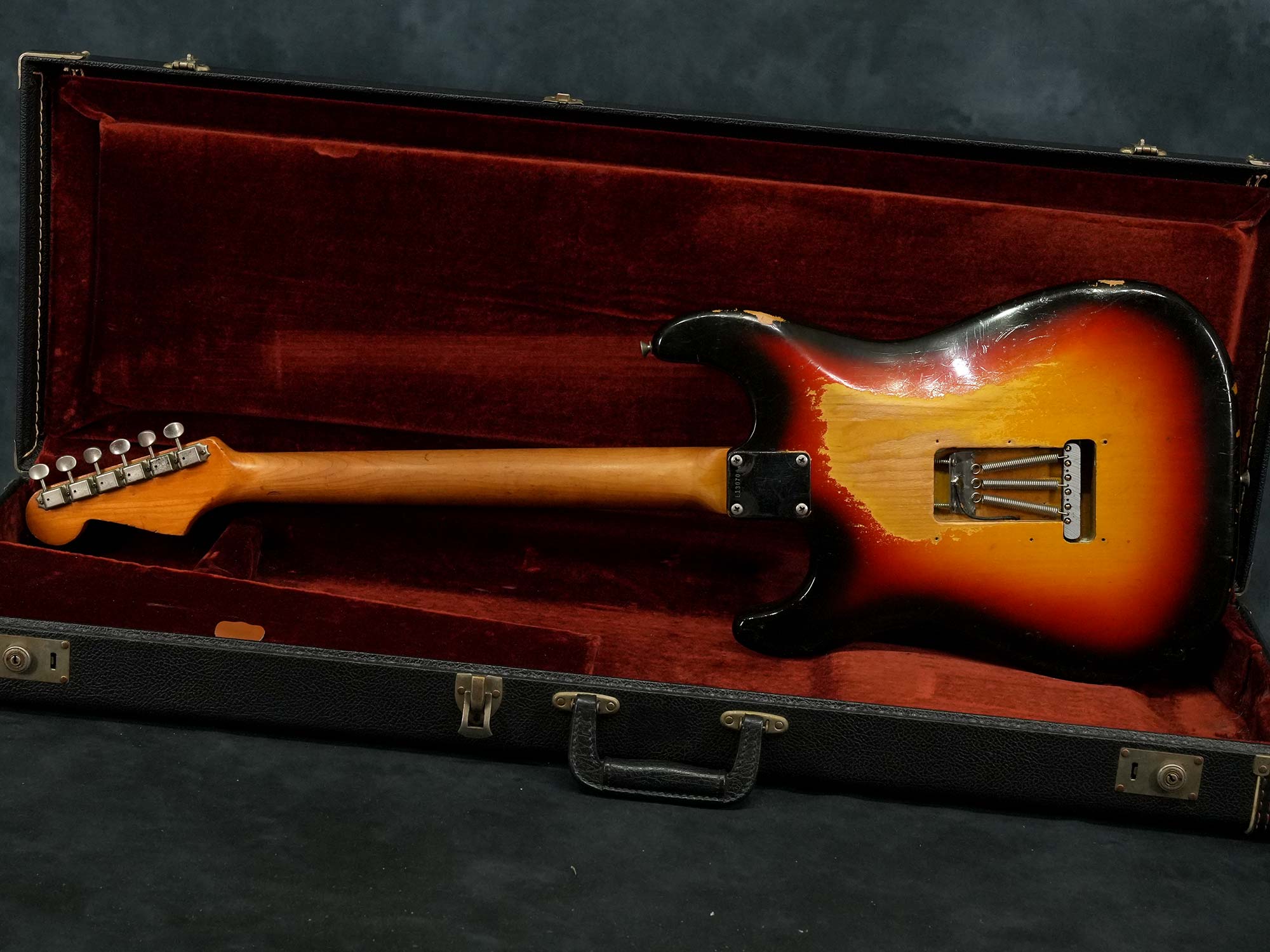 スモールヘッドにスパゲティロゴ1963年ネックと1965年頃ボディ、近年製のパーツで組み上げられつつ枯れた音色と渋いルックスが格好良くプレイヤー向けのFender Stratocaster。1963年デイトのスモールヘッド&スパゲティロゴメイプルネック&ラウンドラミネイトされたハカランダ指板、1965年頃のアルダーボディ、ピックアップはフロントがブラックボビン・センターはRaw Vintage・リアはSerymour Duncan Antiquity、5-Wayレバースイッチ、ポット類・ペグ・ブリッジ・ノブ類も全て気年製に交換されており、1963年製のネック&1965年頃製のボディに近年製のパーツで組み上げられています。