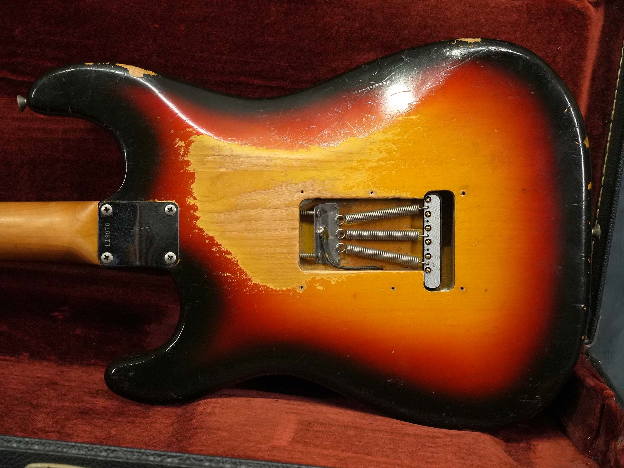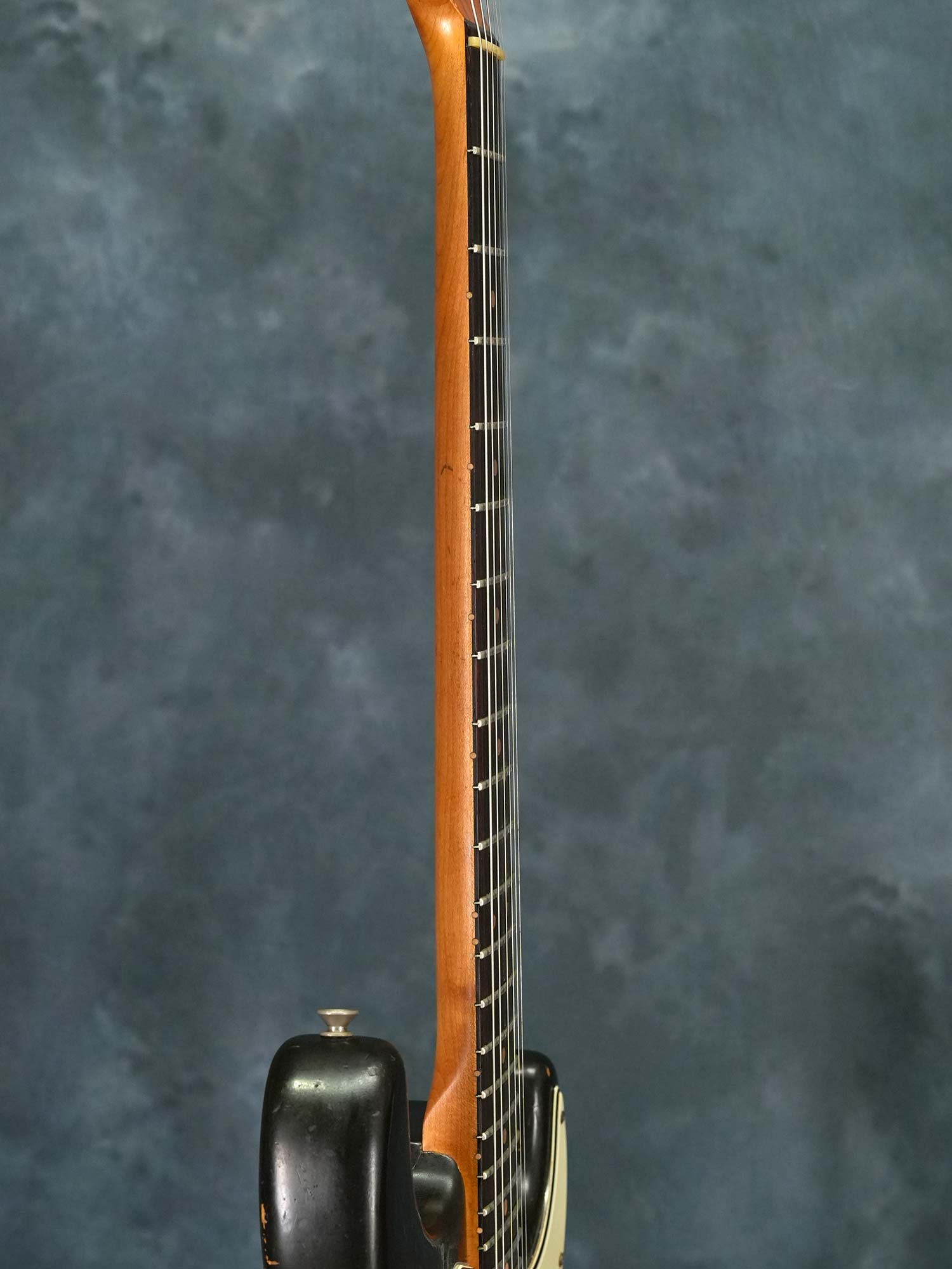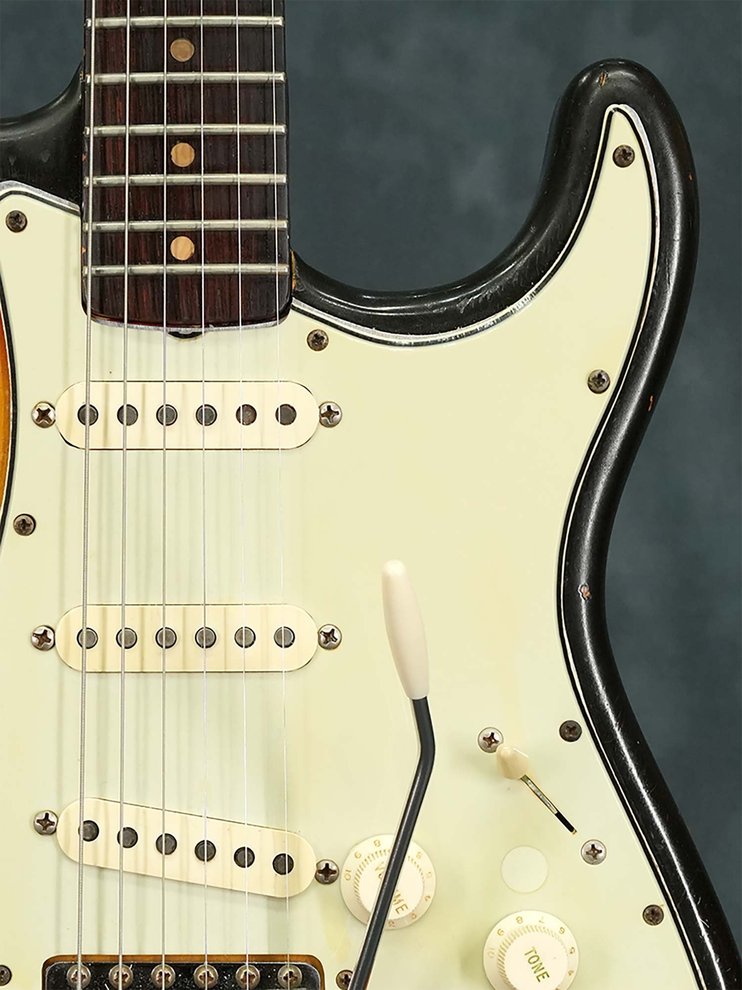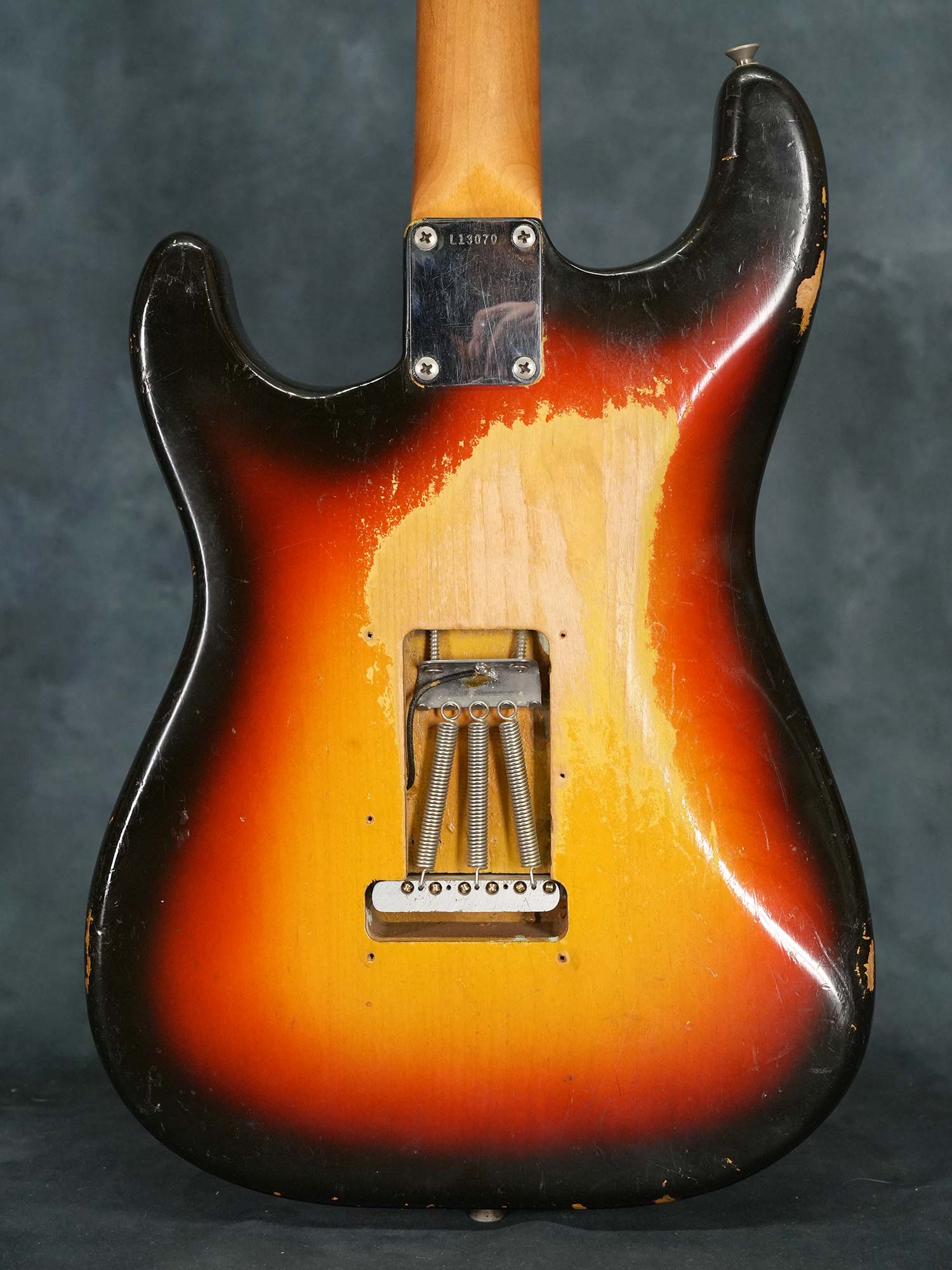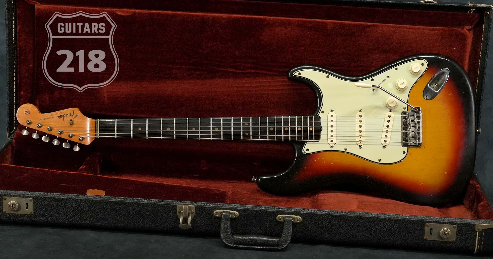 スモールヘッドにスパゲティロゴ1963年ネックと1965年頃ボディ、近年製のパーツで組み上げられつつ枯れた音色と渋いルックスが格好良くプレイヤー向けのFender Stratocaster。1963年デイトのスモールヘッド&スパゲティロゴメイプルネック&ラウンドラミネイトされたハカランダ指板、1965年頃のアルダーボディ、ピックアップはフロントがブラックボビン・センターはRaw Vintage・リアはSerymour Duncan Antiquity、5-Wayレバースイッチ、ポット類・ペグ・ブリッジ・ノブ類も全て気年製に交換されており、1963年製のネック&1965年頃製のボディに近年製のパーツで組み上げられています。