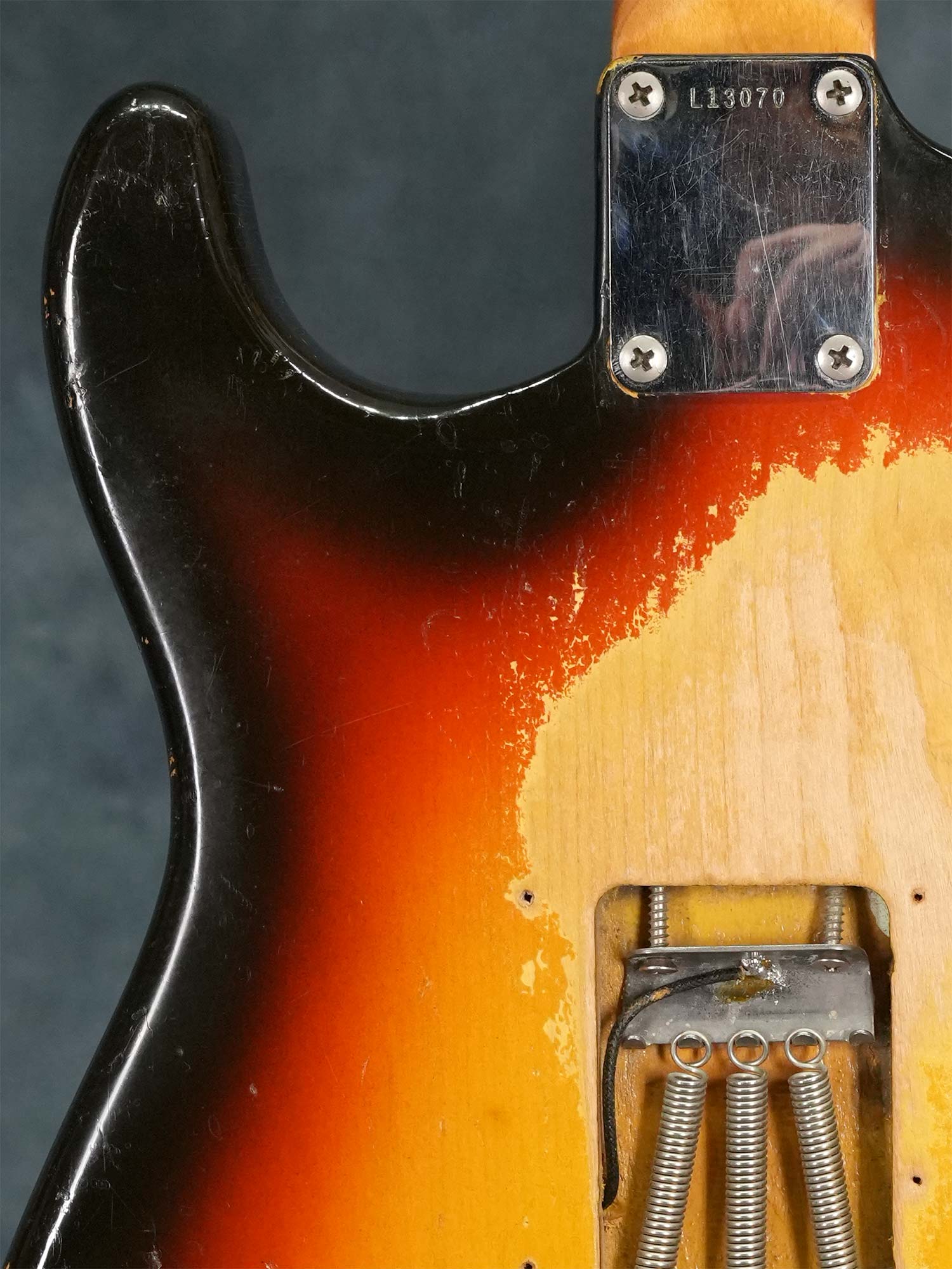 ネック&ボディ共にフィニッシュはオリジナルで、ボディのリアピックアップ6弦側にザグリを埋めた跡が有ります。ネックは弾き込まれた事で裏側は殆ど塗装が残っておらず、ボディトップは比較的塗装が残っているものの、ボディバックはバックル傷を中心に大きく塗装が剥がれています。