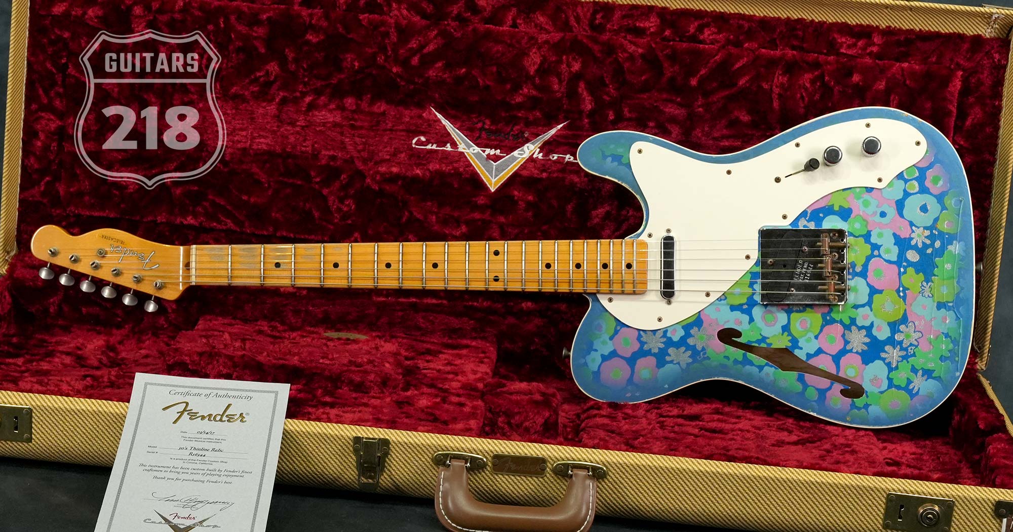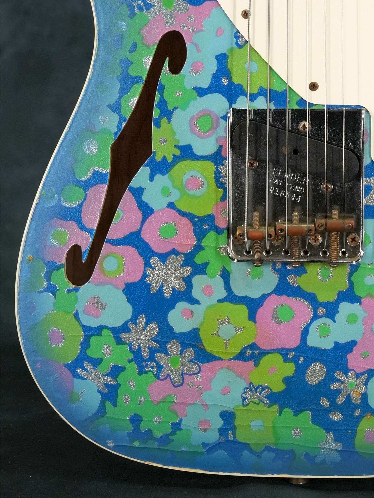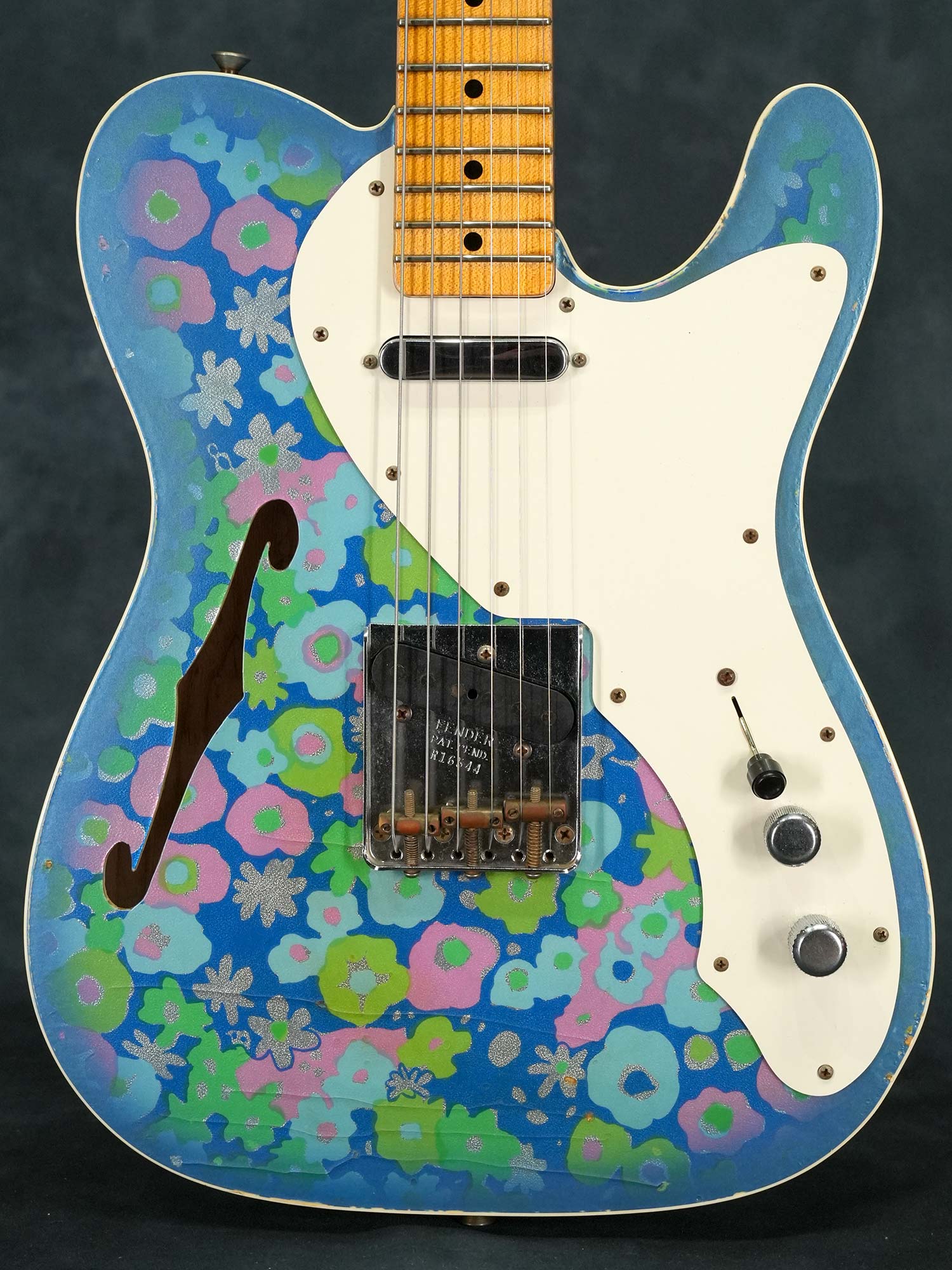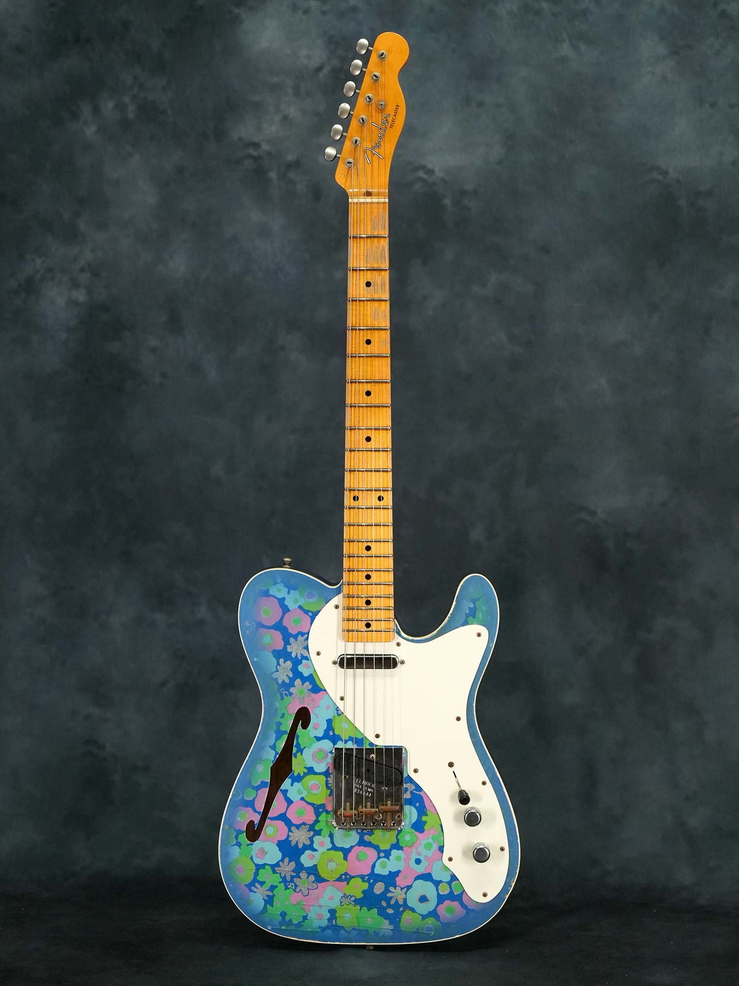 1950年代風のスパゲティロゴで肉厚な1-Pieceメイプルネック、1968年に発表されたTelecaster Thinlineタイプの中空ボディにはオリジナルでは存在しないバインディングが巻かれた上でボディトップは特徴的な模様の布をが貼られた「ブルーフラワー」、本来ならバックも同じ柄で仕上げられているものの本器のボディバックはブルースパークル仕上げられています。