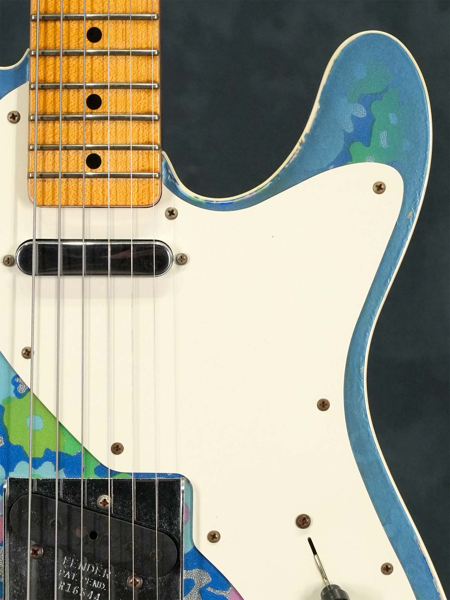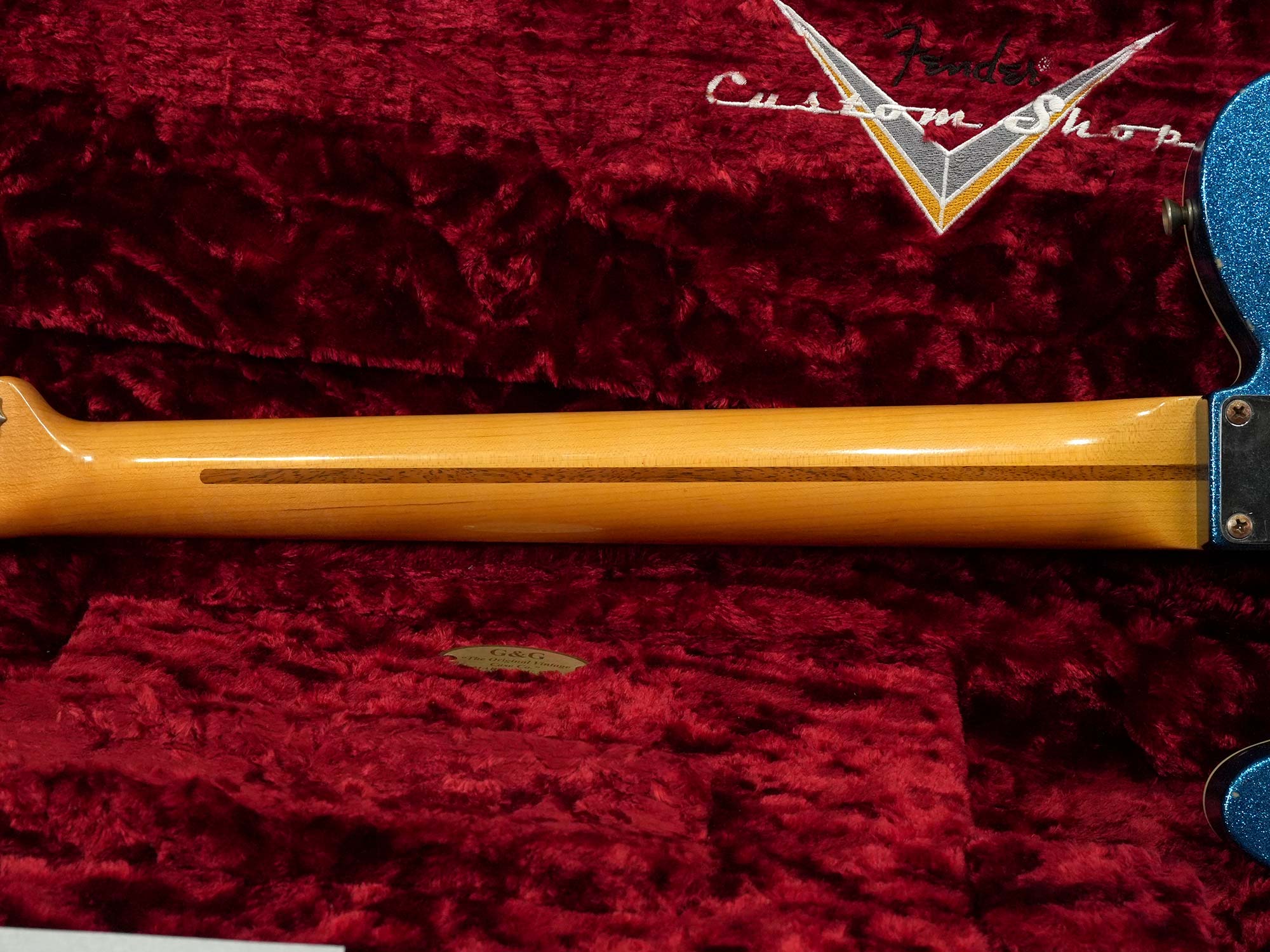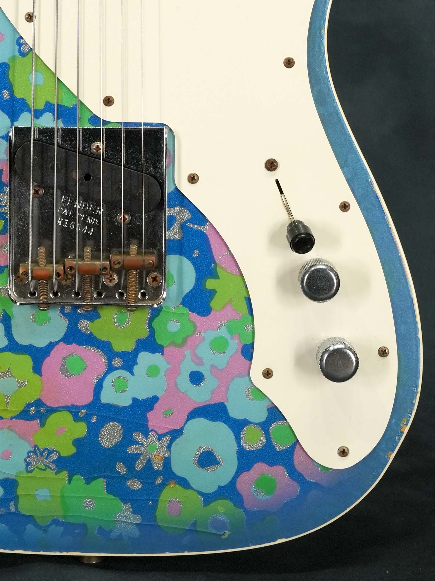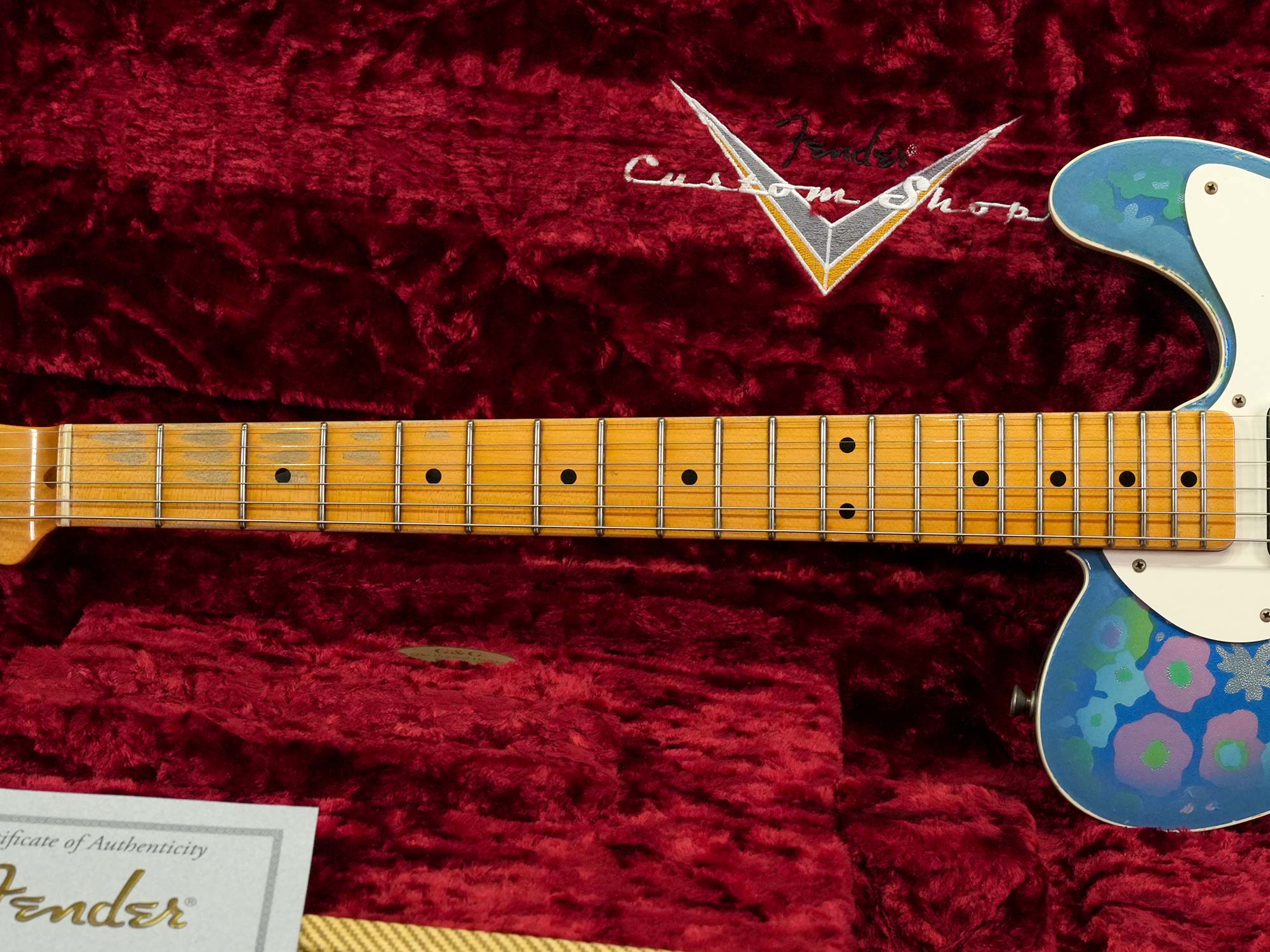 1950年代風のスパゲティロゴで肉厚な1-Pieceメイプルネック、1968年に発表されたTelecaster Thinlineタイプの中空ボディにはオリジナルでは存在しないバインディングが巻かれた上でボディトップは特徴的な模様の布をが貼られた「ブルーフラワー」、本来ならバックも同じ柄で仕上げられているものの本器のボディバックはブルースパークル仕上げられています。