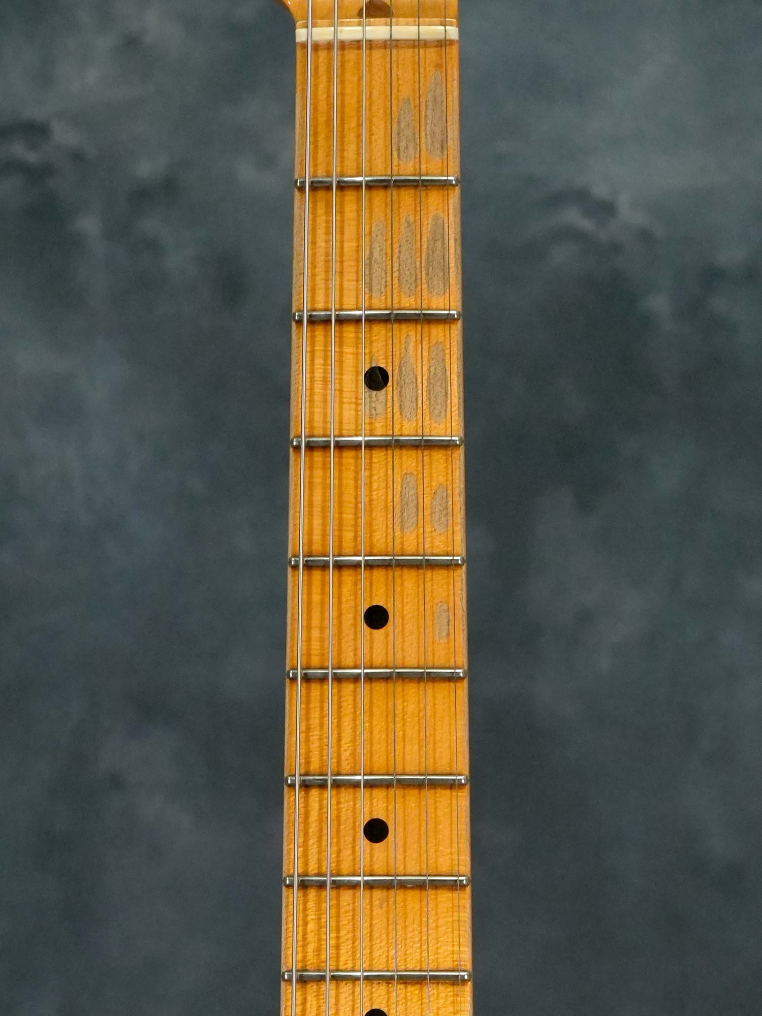 使用感を再現したレリック加工が施されており、指板の塗装剥がれやボディの大小のウェザーチェックや所々打痕なども再現されているため後から付いた傷との判別は難しいものの、木部の割れや凹みを伴うようなダメージや違和感を感じるような大きな傷は有りません。