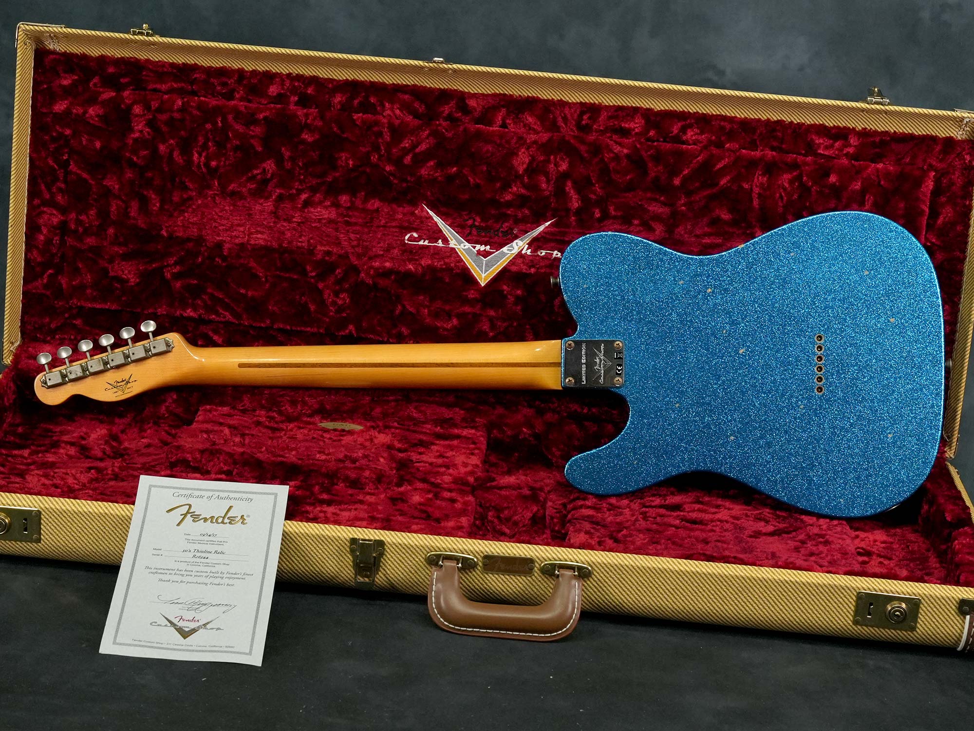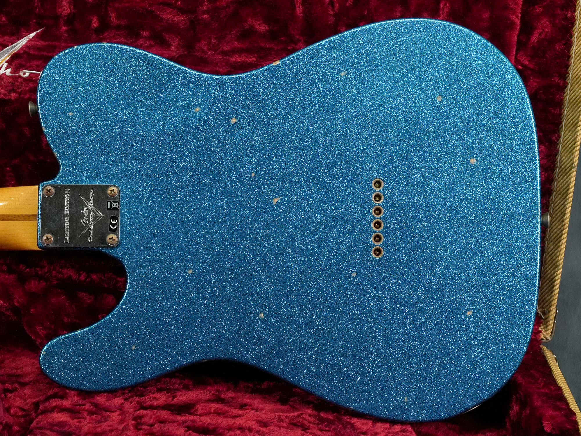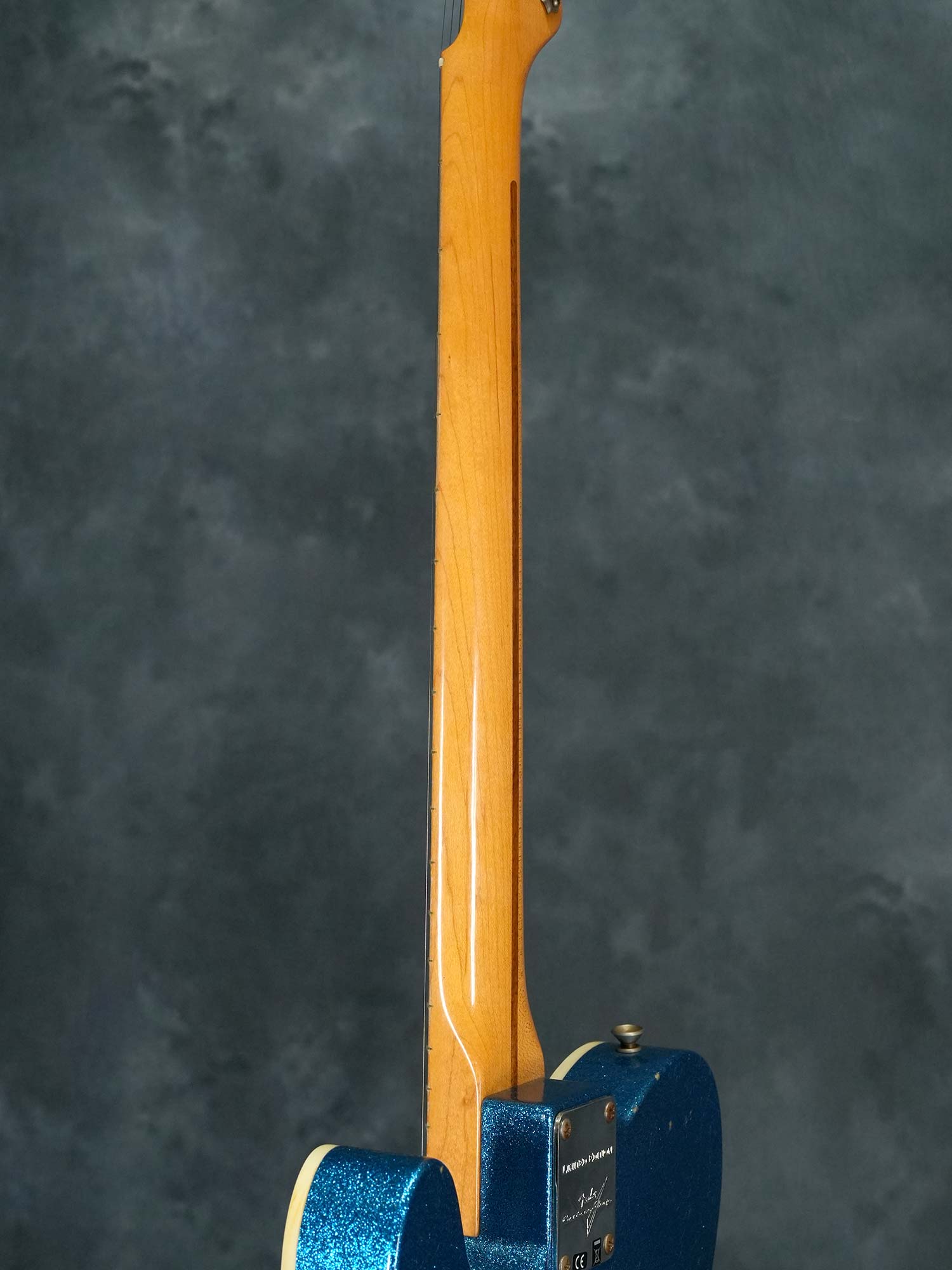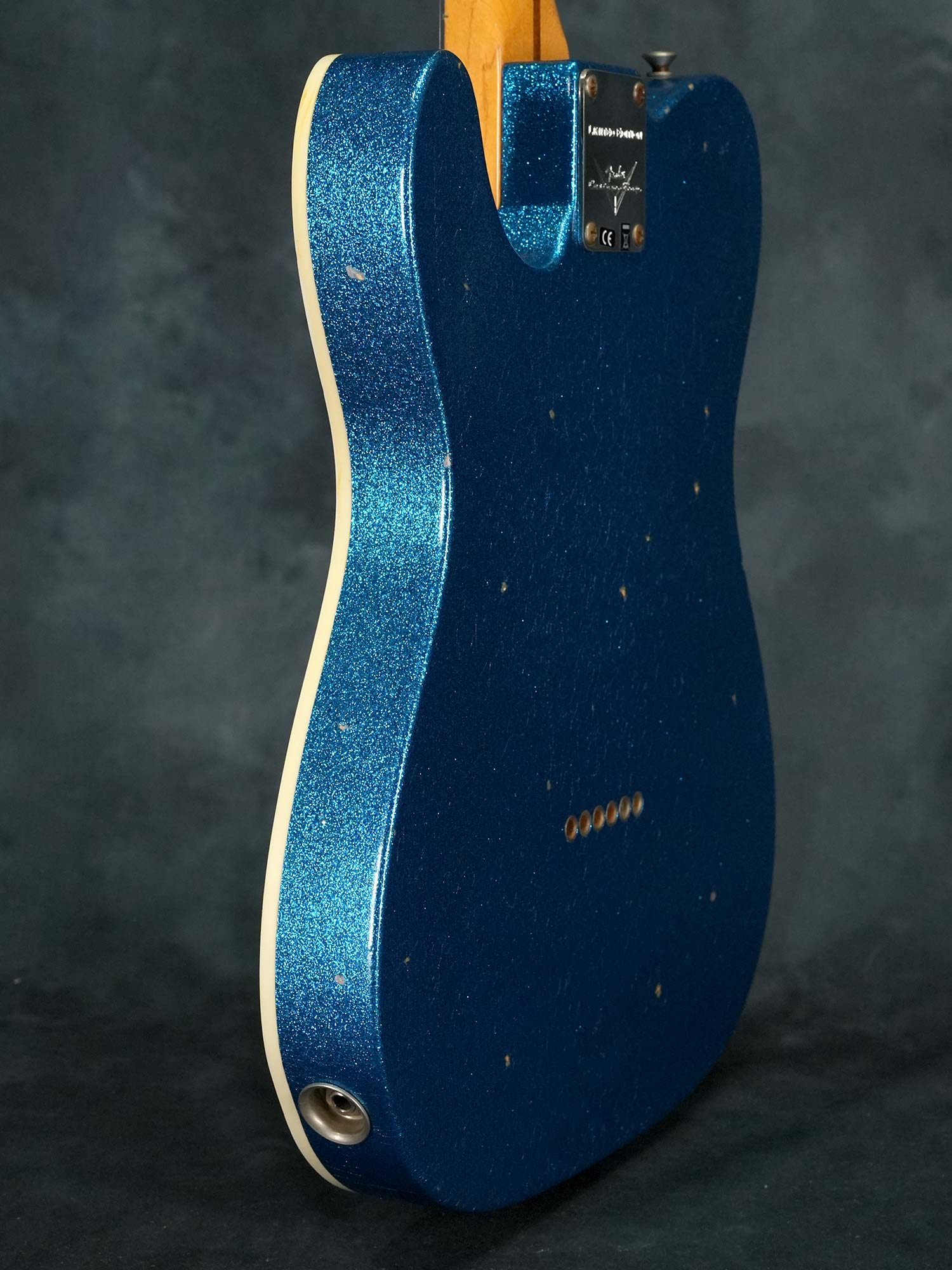 本来は1950年代にも1960年代にも存在しない仕様ながら、(ボディバックのブルースパークルを除いて)個別に見れば実際に存在した特徴的なスペックを合わせる事でどこかクラシックな雰囲気を感じる華やかなデザイン、中空構造かつ軽量なボディによる明るくアコースティックな鳴りが心地よく、限定モデルならではステージで映えるテレキャスターシンラインをお探しの方にオススメの一本です。