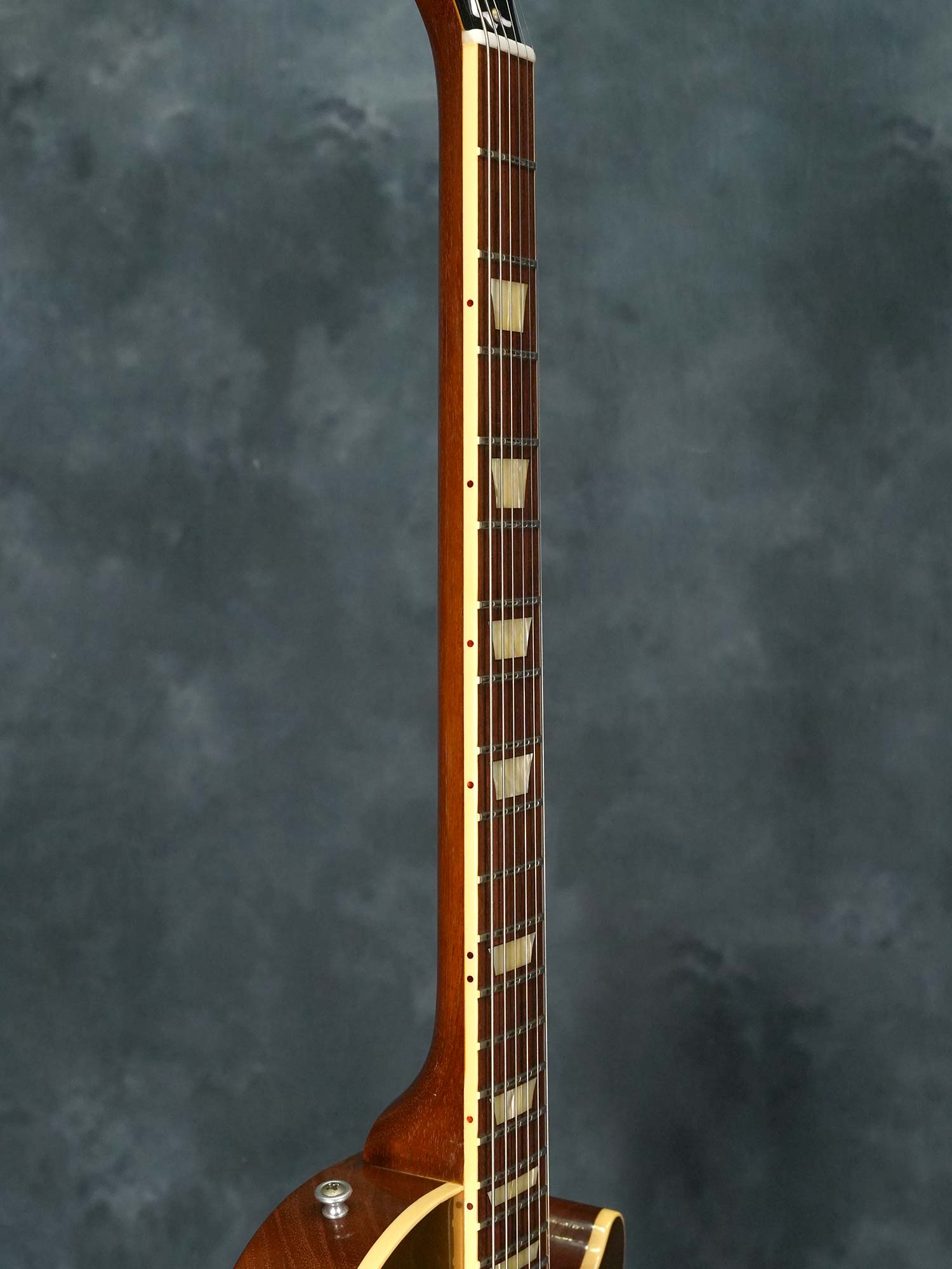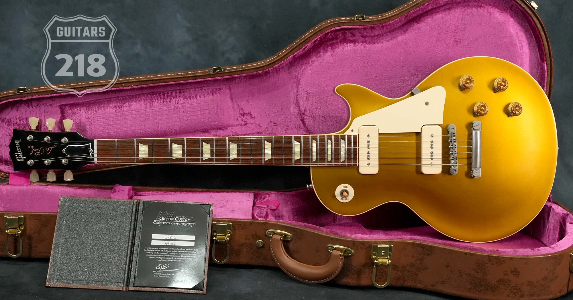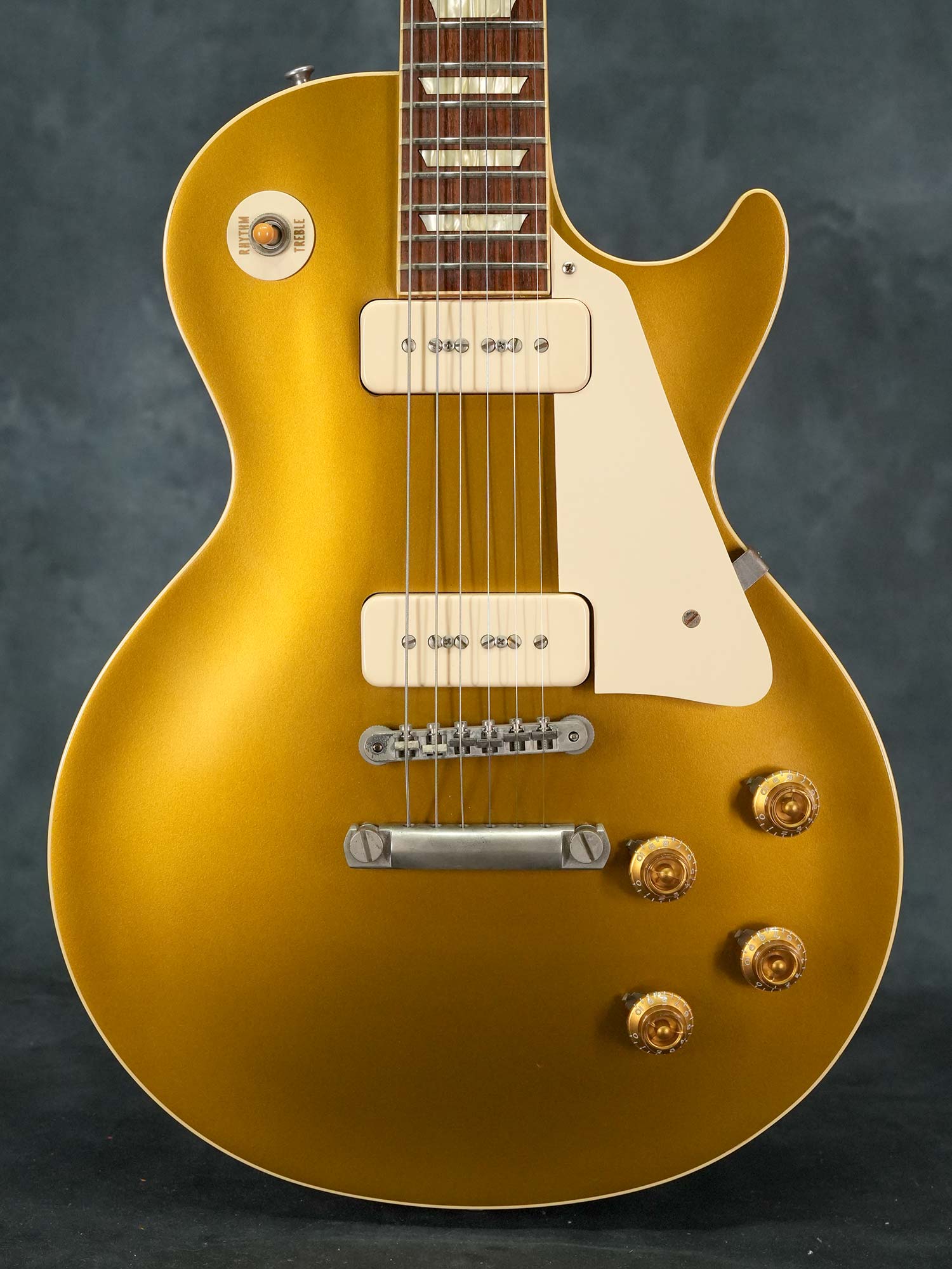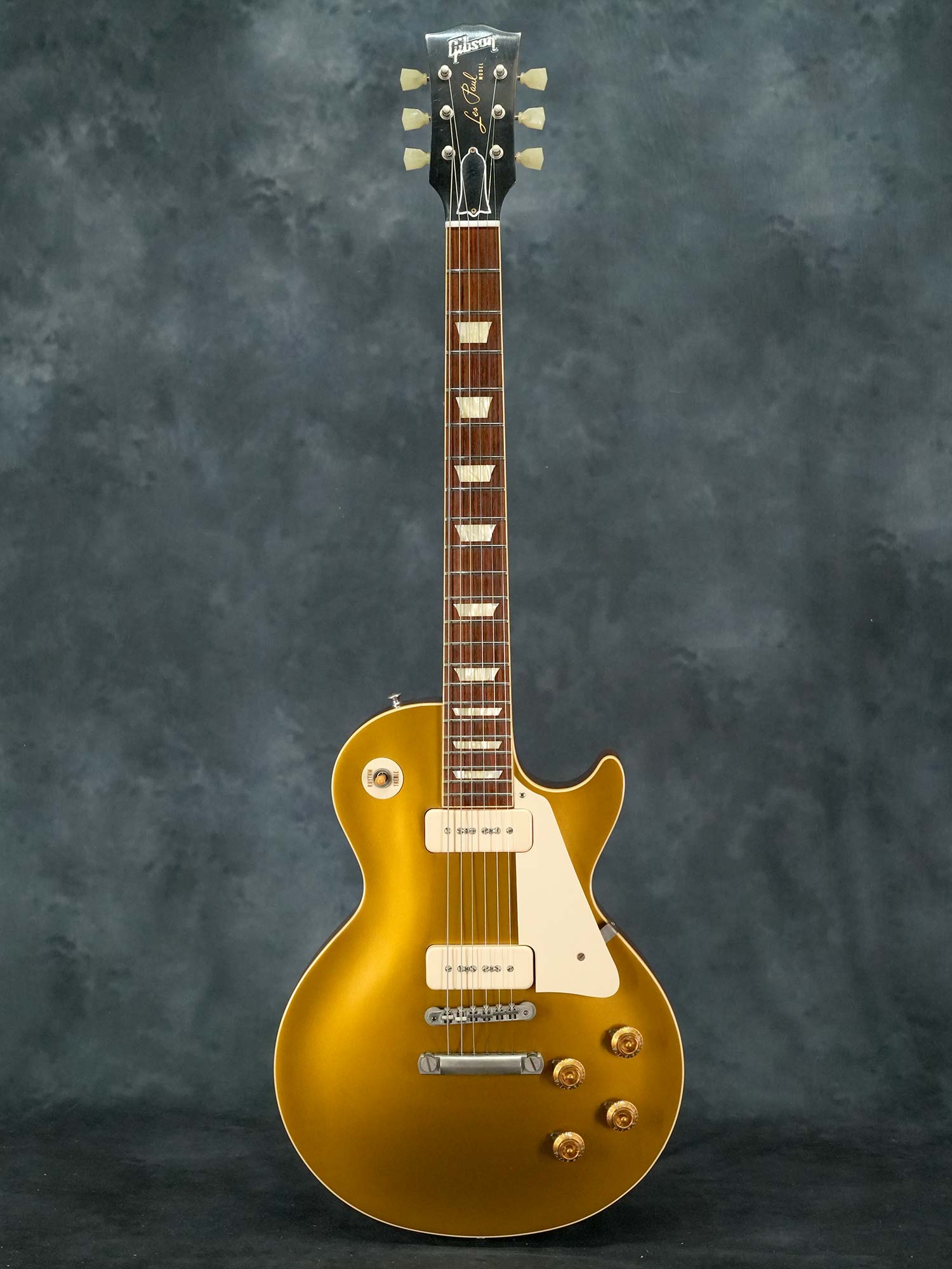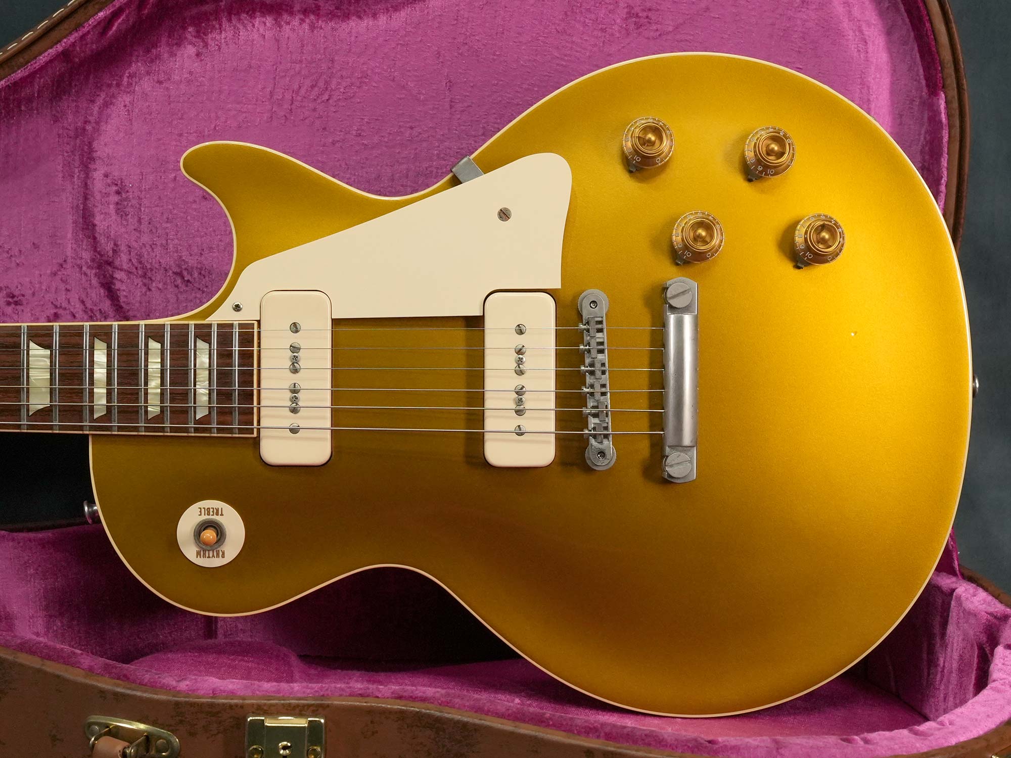 軽量で扱い易く乾いた音色が心地よい1956 Les Paul Goldtop Reissue、2014年製の中古品です。マホガニーBack&メイプルTopのボディに、マホガニーネック、ローズウッド指板、ノンワイヤーのABR-1ブリッジ、軽量なアルミテイルピース、ピックアップはフロント&リア共にシングルコイルのP-90を搭載し、3-Wayトグルスイッチに2-Volume&2-Toneのコントロール、2014年当時のバンブルビーレプリカに加えて、 チューブレスの強固なトラスロッド、半透明のクルーソンスタイルペグ、鉄製のロングなテールピーススタッドやインサートなど、Gibson Custom Shop設立20周年となる2013年に大幅にアップデートされた現在のモデルにも通じる仕様。