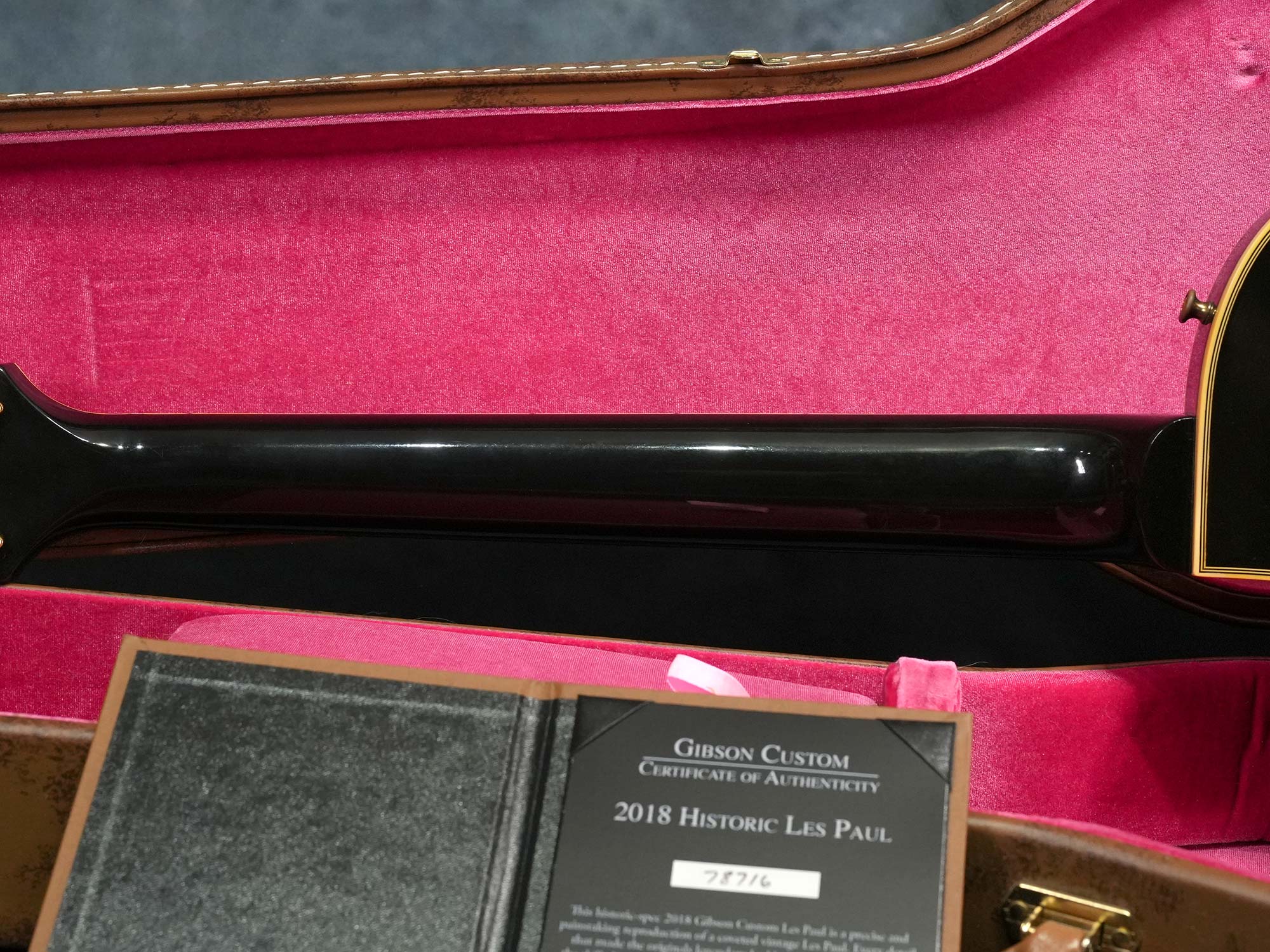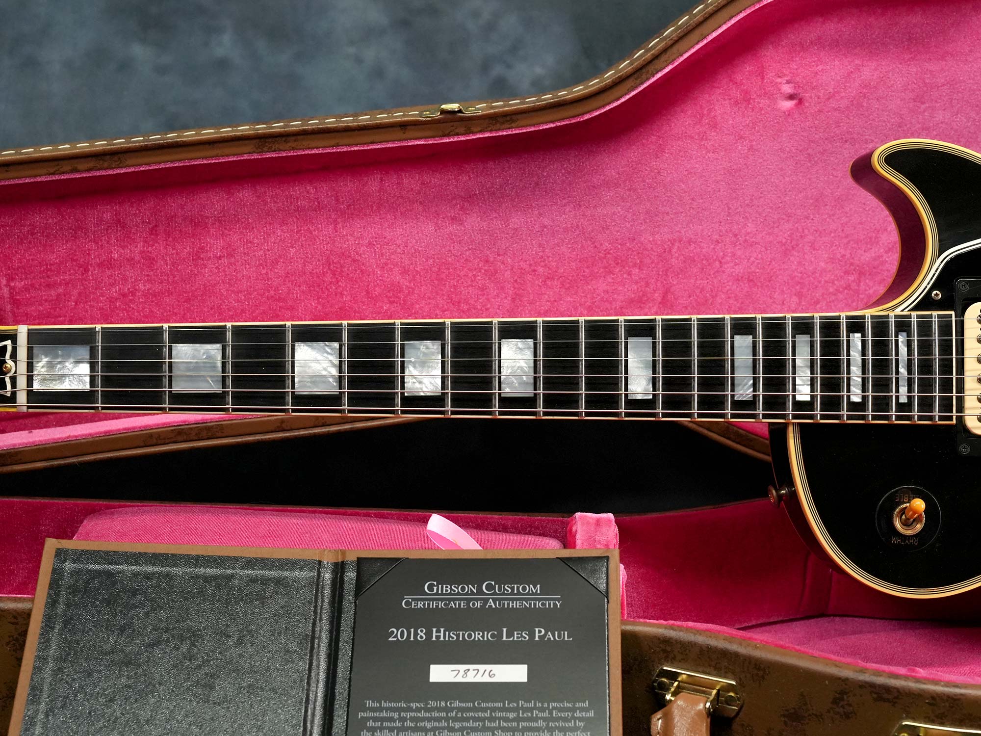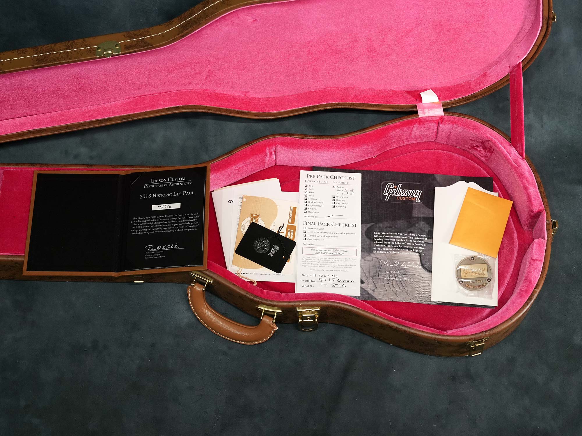 1-Pieceマホガニーボディ、ロングテノン(ディープジョイント)のマホガニーネック、エボニー指板、ワッフルバックのVX501ペグ、ノンワイヤーのABR-1ブリッジ、軽量なアルミテイルピースと鉄製のロングスタッド&インサート、2015年のTrue Historic以降を踏襲し現行モデルまで続くヴィンテージリイシュースペックを採用し、2018年当時では製造本数が少ない3PUのレスポールカスタムをGibson Custom Shopナッシュビルファクトリーで日本国内ディーラーが選定した「現地選定品」となります。