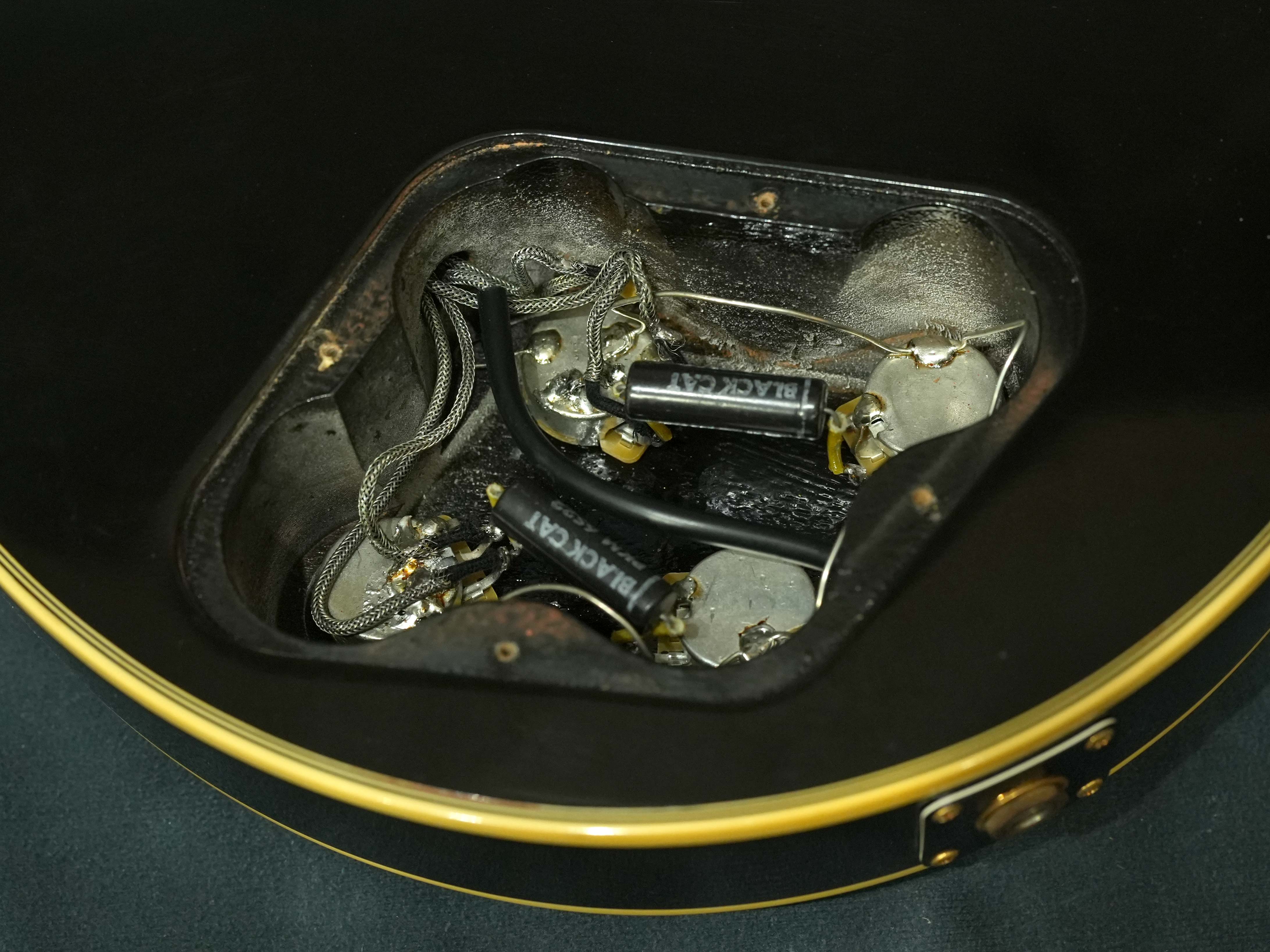 ピックアップは全て”Vintage Maniacs Hysteric PAF”のダブルホワイトかつ7KΩ代のローパワーなピックアップへ、合わせてコンデンサは古いCornell Black Cat .022に交換されており、オリジナルパーツは付属しません。Gibsonの3PUのモデルは特殊な配線となっており本来は「フロント・センター&リアのフェイズ・リア」になりますが、本器はセンターピックアップが結線されておらず「フロント・フロント&リア・リア」と言った一般的な2PUのモデルと同じように配線されています。