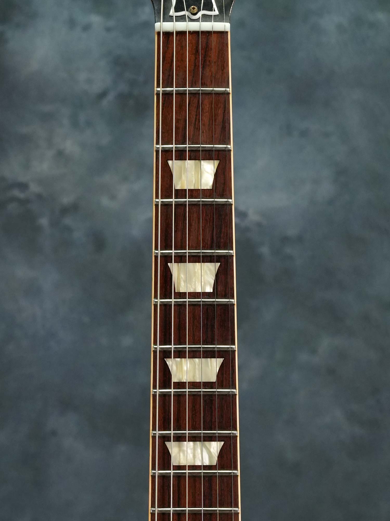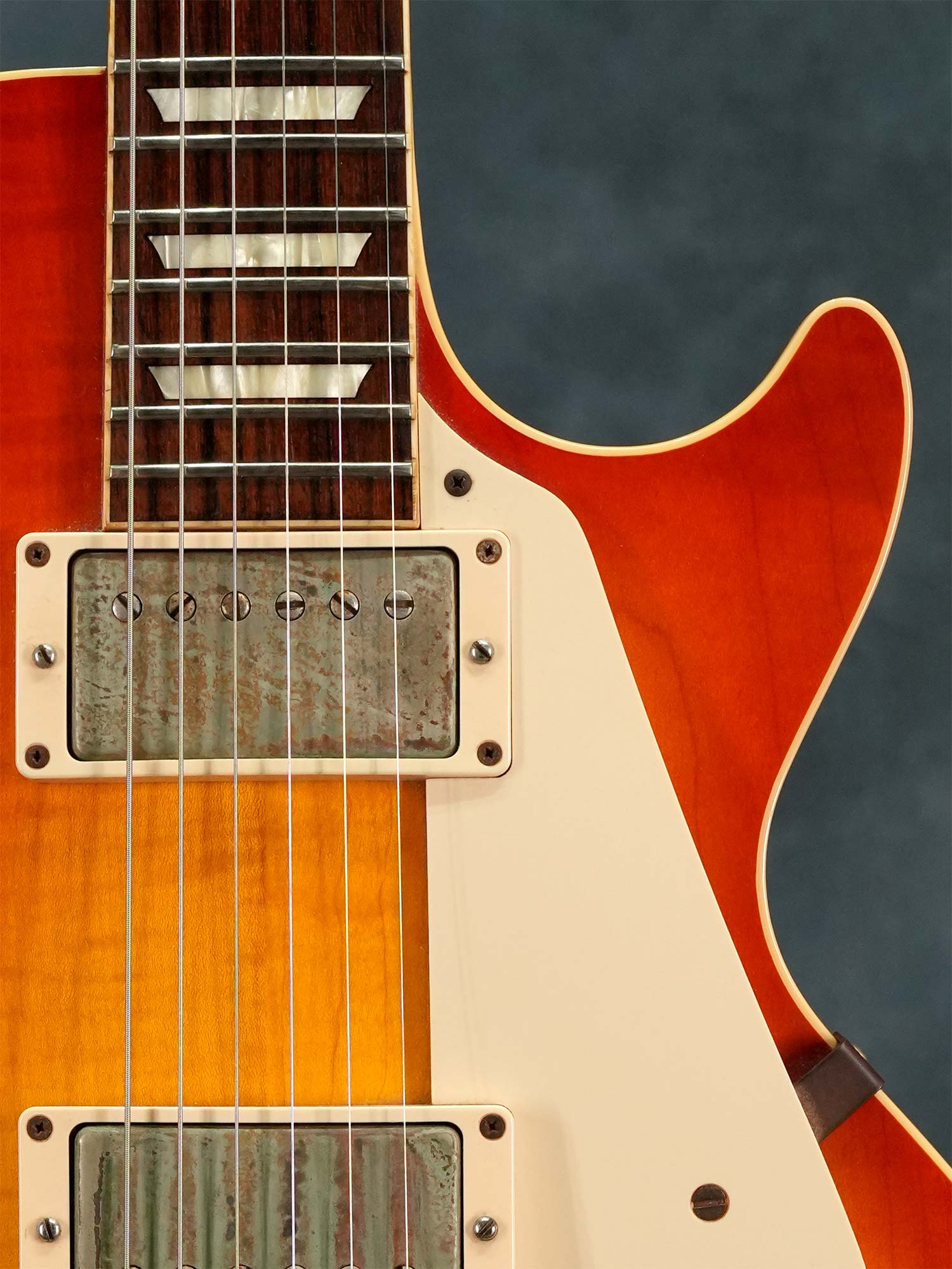 新品時より半艶消しの塗装とエイジングハードウェアによる経年変化が再現されたVOSフィニッシュが採用されており、1/2/3弦側のヘッドストック先端に塗装剥がれを伴う傷、6弦側16フレット付近のバインディング周辺に塗装剥がれ、ボディバックカブのセンター付近にはバックルによる塗装のダメージ、ピックアップカバーやブリッジスタッドなどニッケルハードウェアは本来のエイジングに加えてさらにメッキが傷んでおり、この時期のプラスチックパーツの宿命とも言えるようにコントロールノブは内側からヒビが入っています。