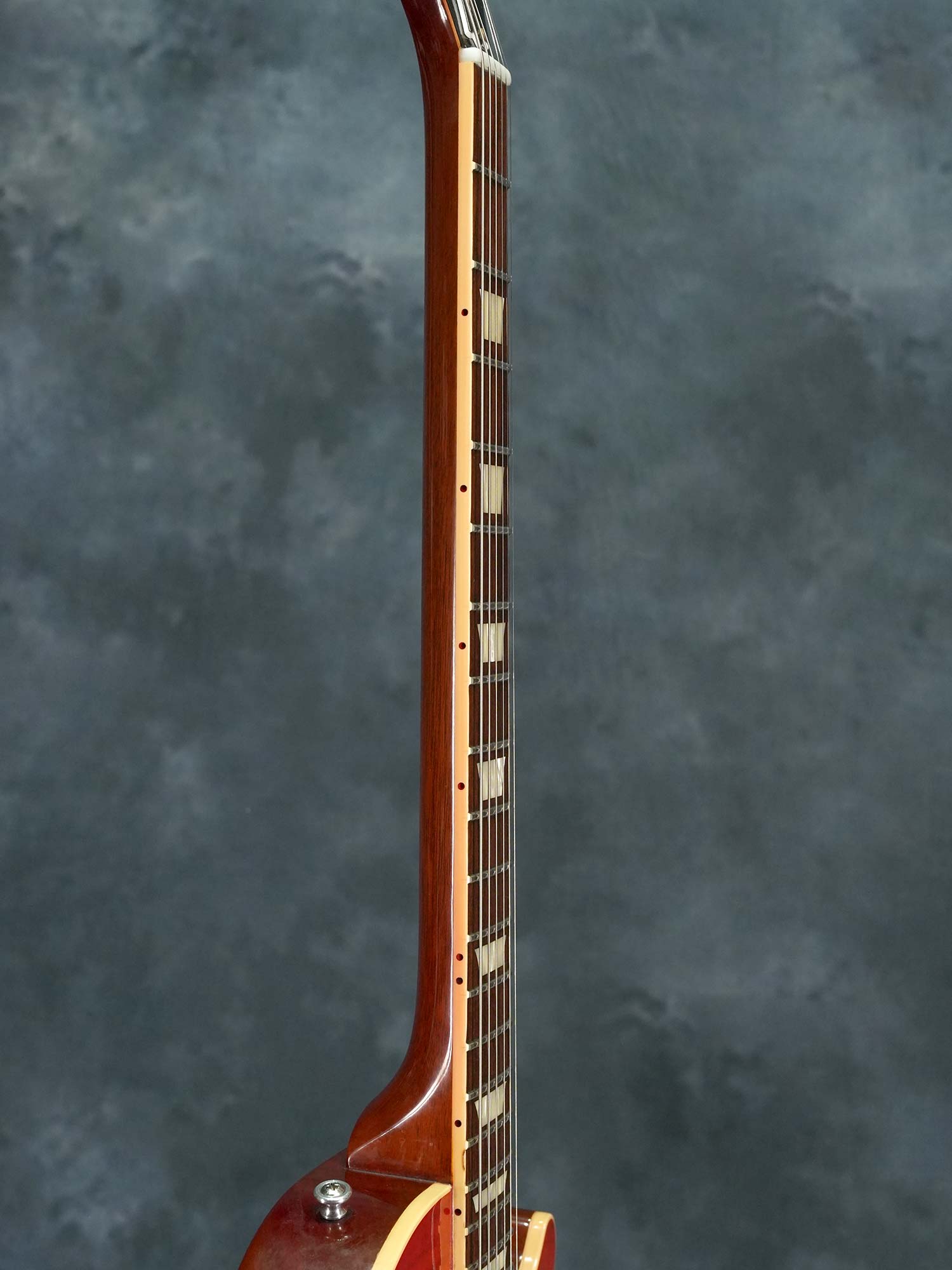 角度によってうっすらフィギュアが浮き出るメイプルトップに鮮やかなチェリーサンバーストの1958 Les Paul Standard Reissue、2013年製の中古品です。2-Pieceメイプルトップ&1-Pieceマホガニーバックのボディ、ロングテノン(ディープジョイント)の太身なマホガニーネック、ローズウッド指板、本来は杢目の出ていないプレーンメイプルの1958 Les Paulですが、ボディトップのメイプルには光の角度によってうっすらとフィギュアが浮き出でおり、鮮やかなチェリーサンバーストによる雰囲気の良いルックスに仕上がっています。