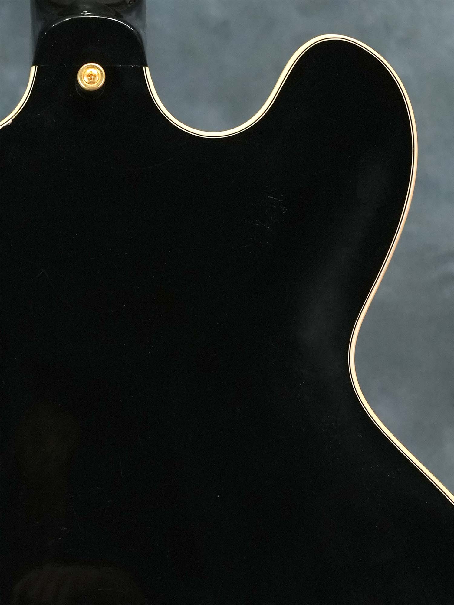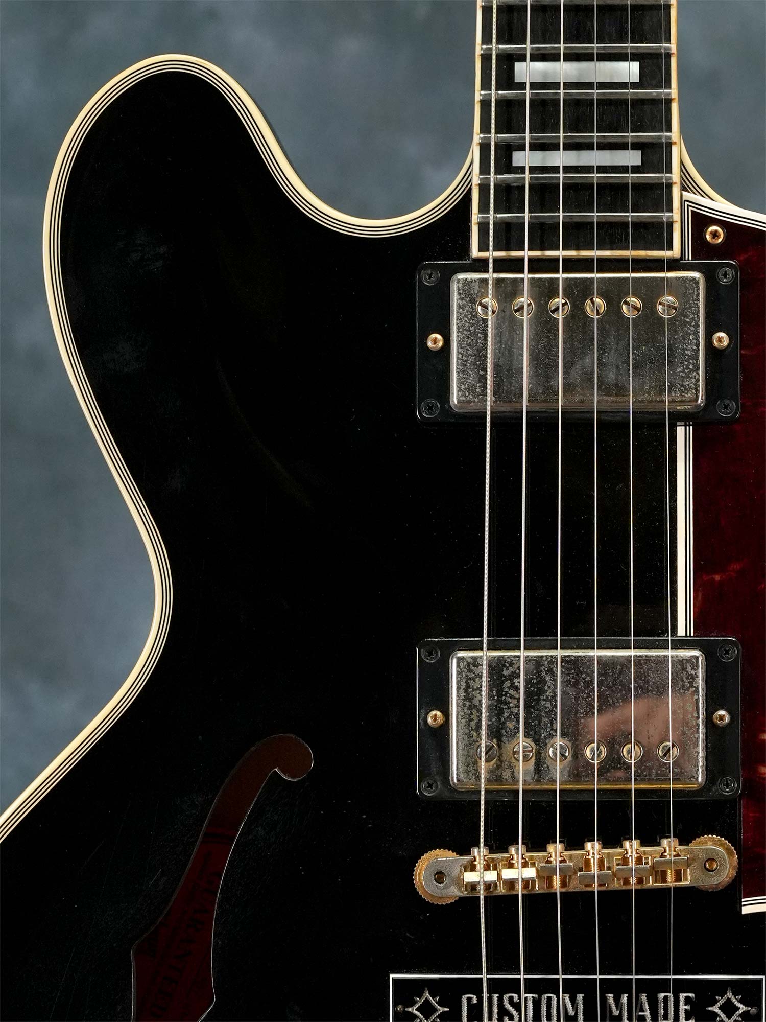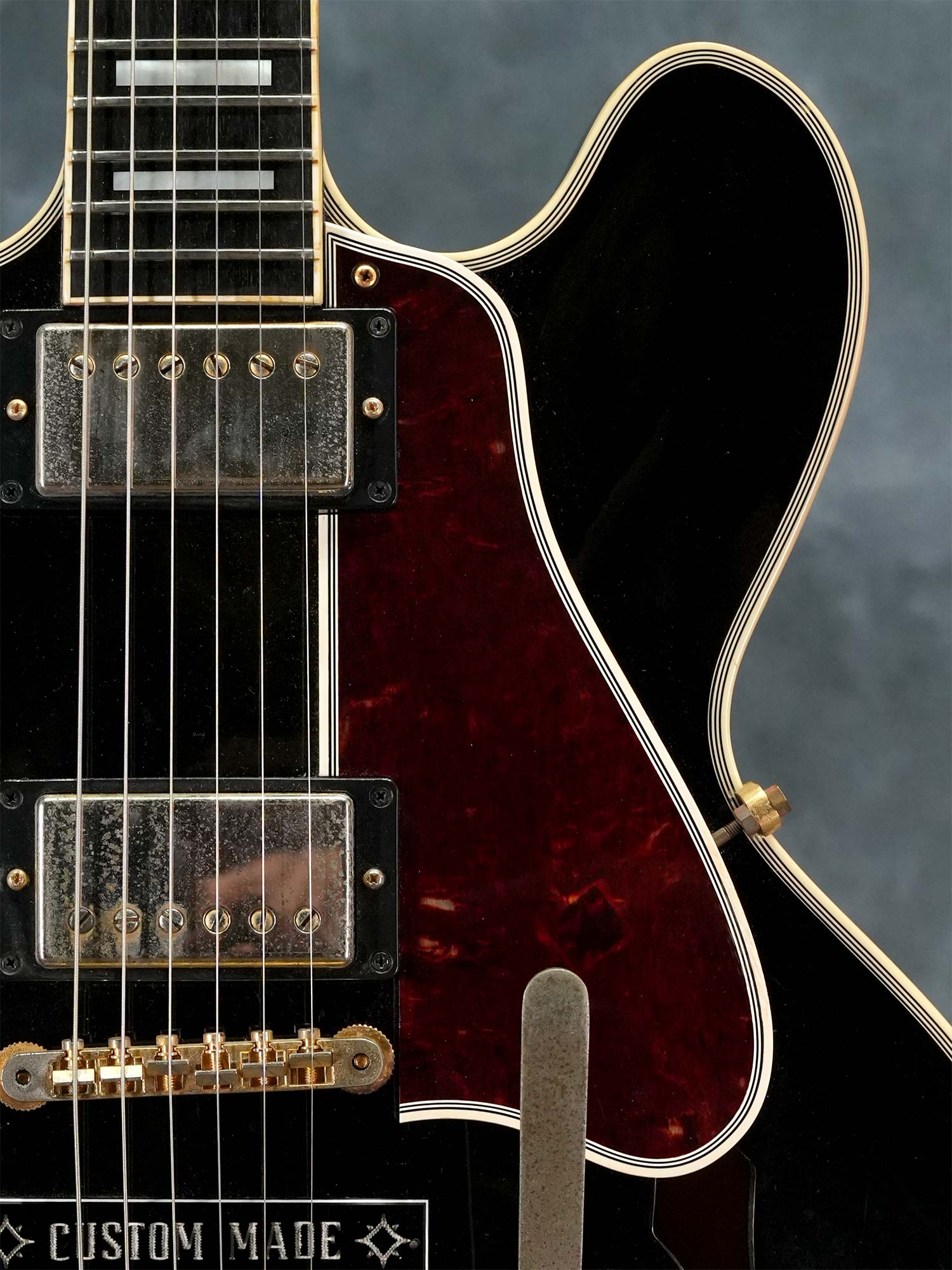 Bigsbyアーム+CUSTOM MADEプレートによる特徴的なデザインに、適度な使用感やゴールドハードウェアの色抜けによる渋いルックス、クリアでアコースティック感の有る音色が心地よく、ES-335とは異なる格好良さのセミアコをお探しの方にオススメの一本です。