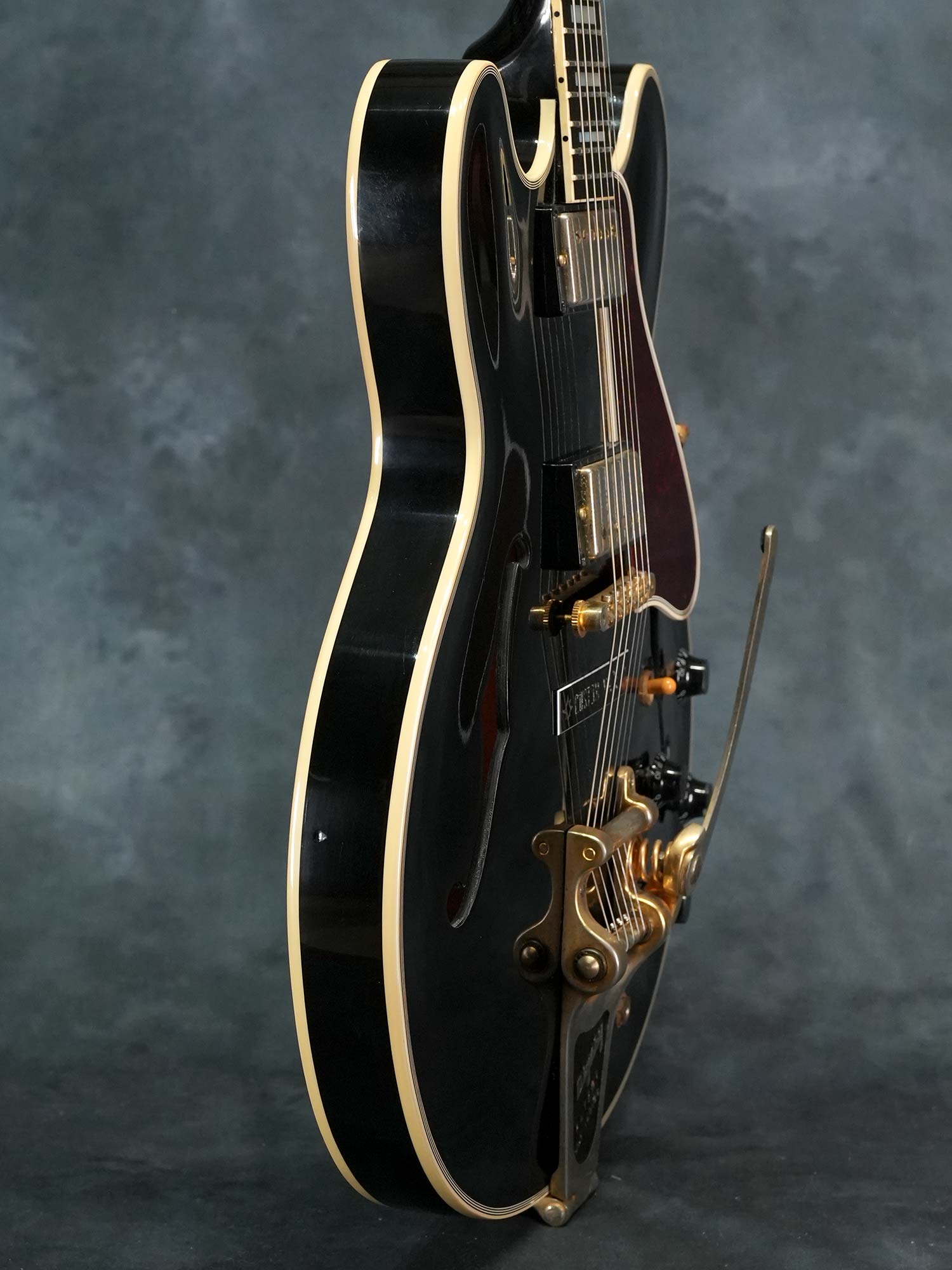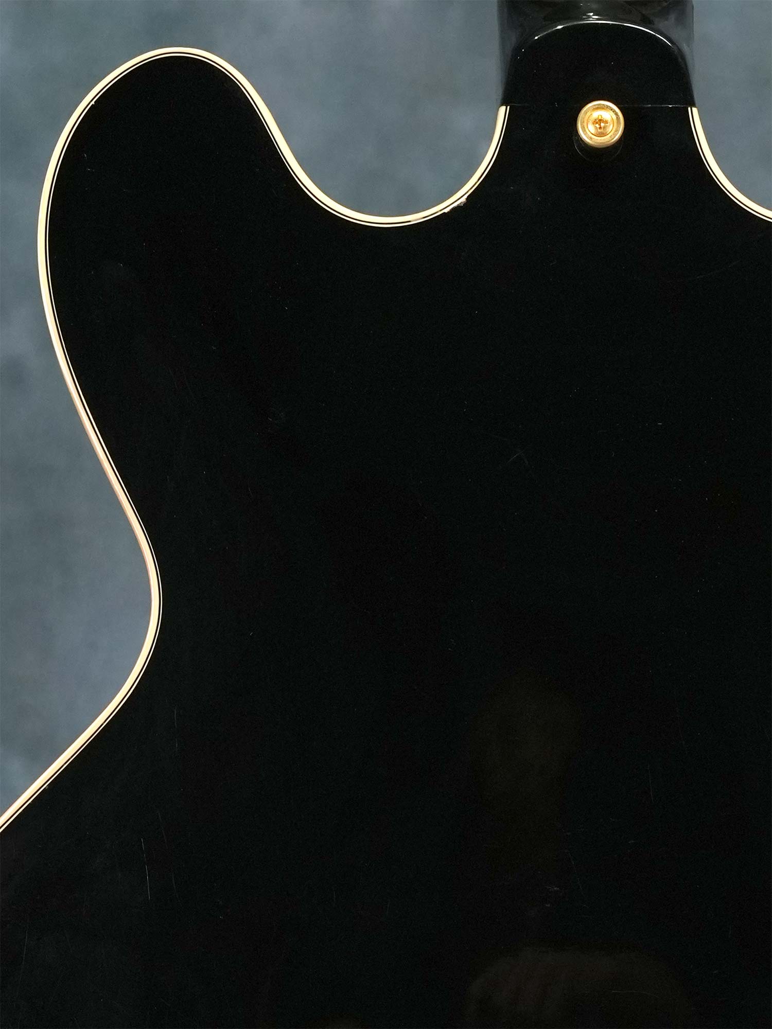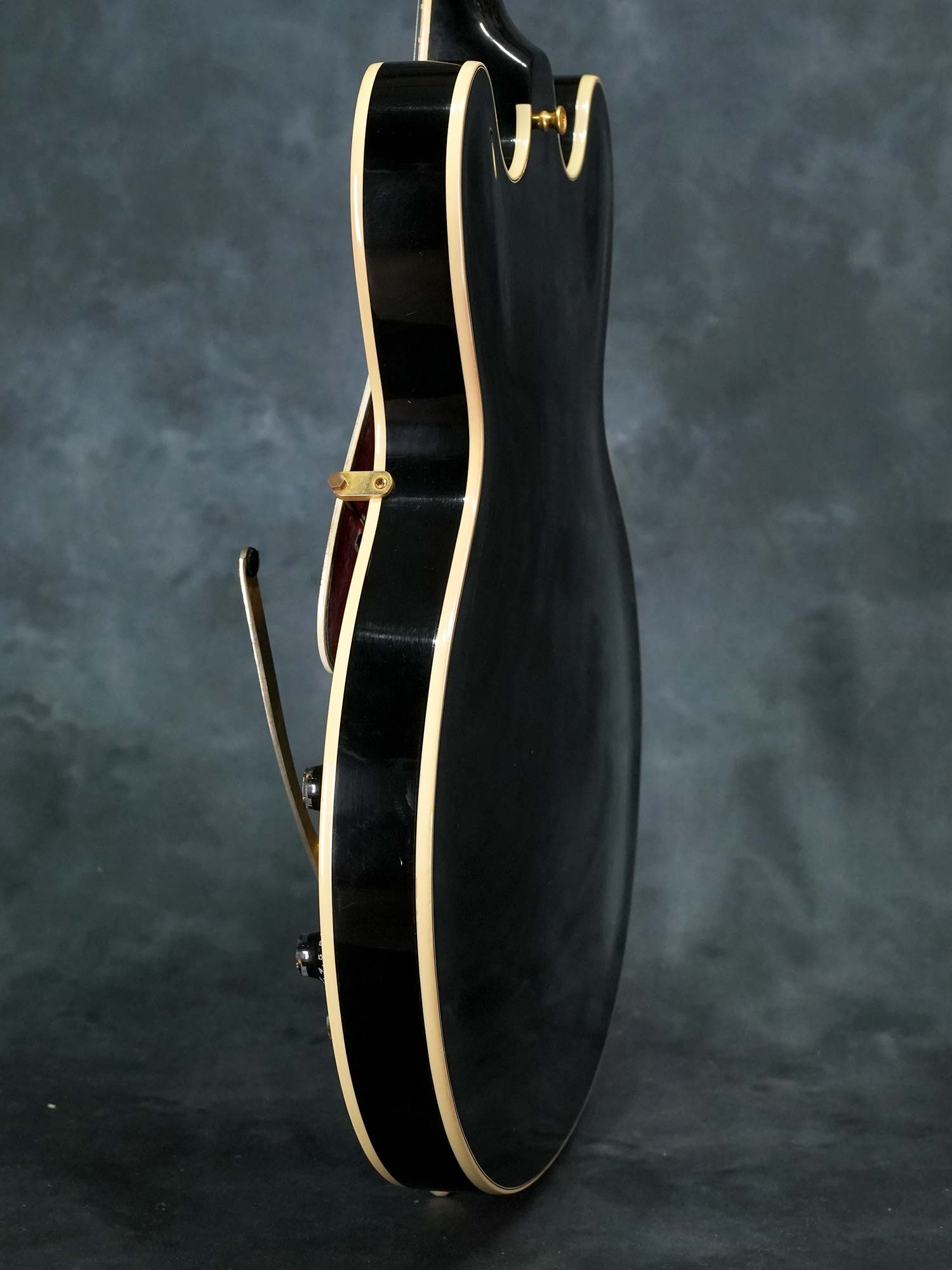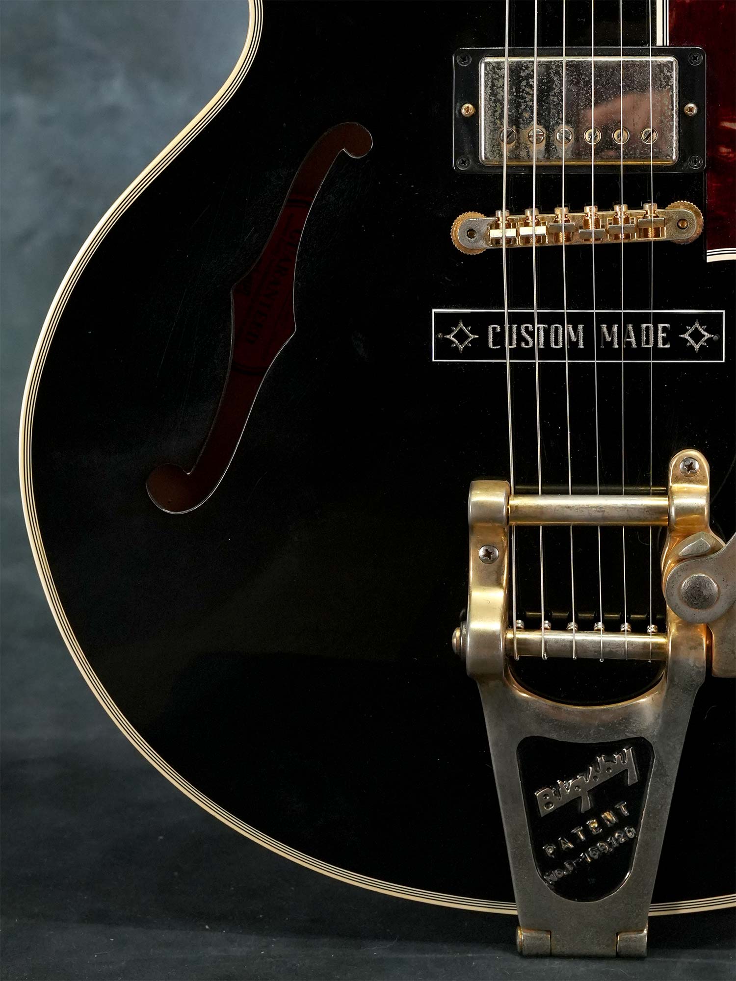 ラミネイトメイプルのセミホロウボディ、ロングテノン(ディープジョイント)のマホガニーネック、エボニー指板、Groverペグ、ピックアップはフロント&リア共にセミアコとの相性が良い57 Classicを搭載し、バリトンスイッチは非搭載、本来はストップテイルピースのモデルにBigsby B7が取り付けられた上でストップテイルピースのスタッド穴は「CUSTOM MADE」の刻印が入ったプレートで隠されています。