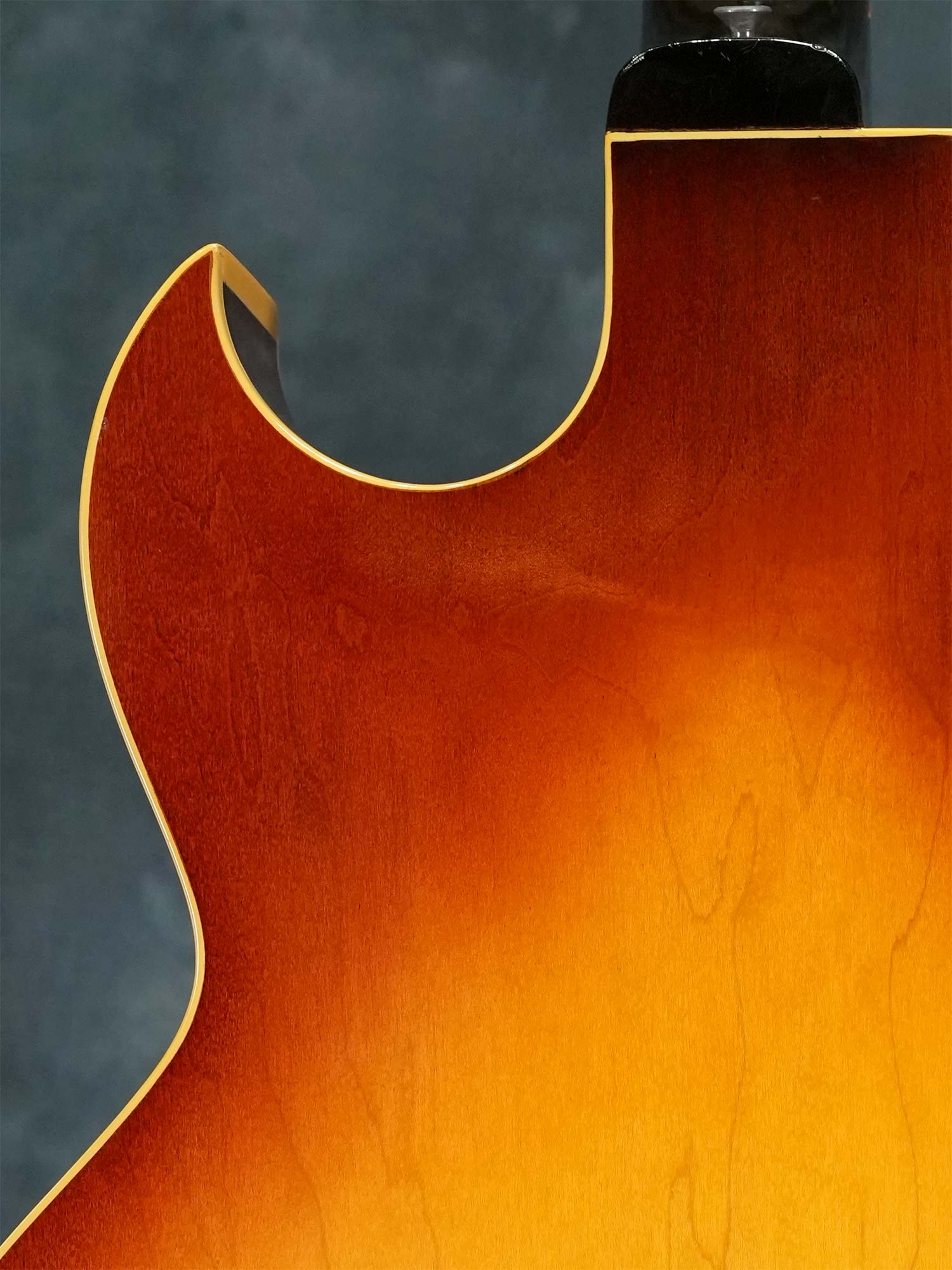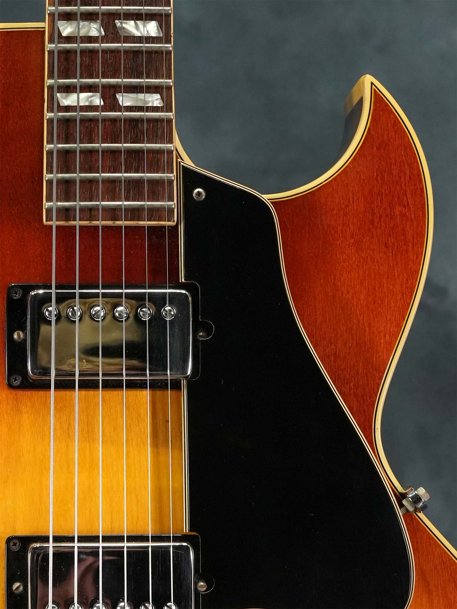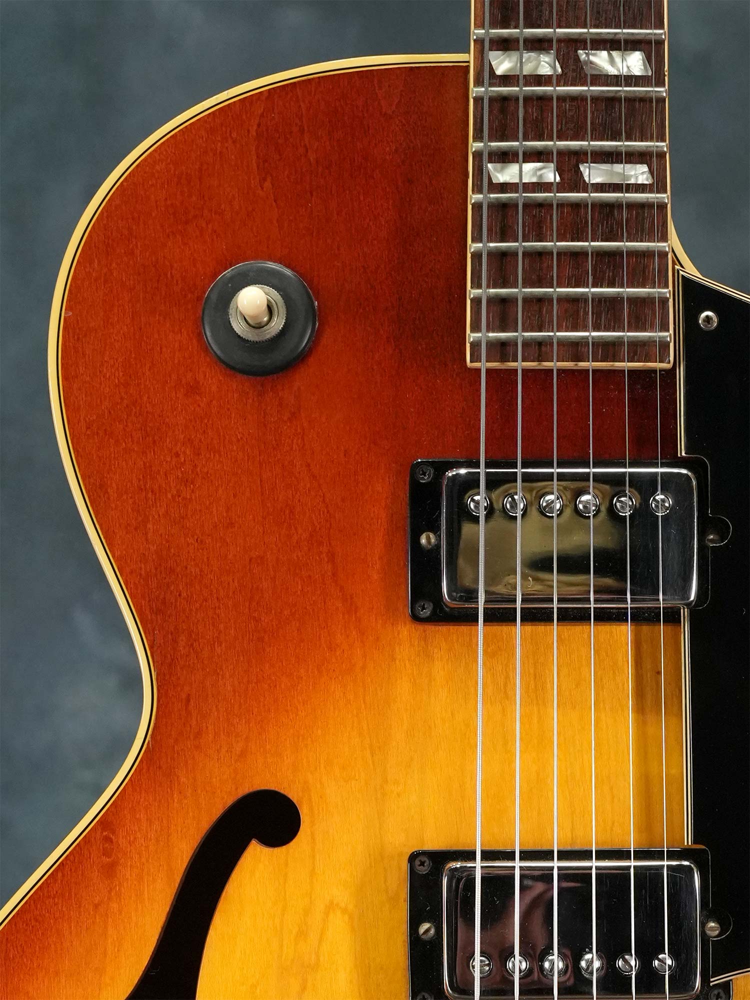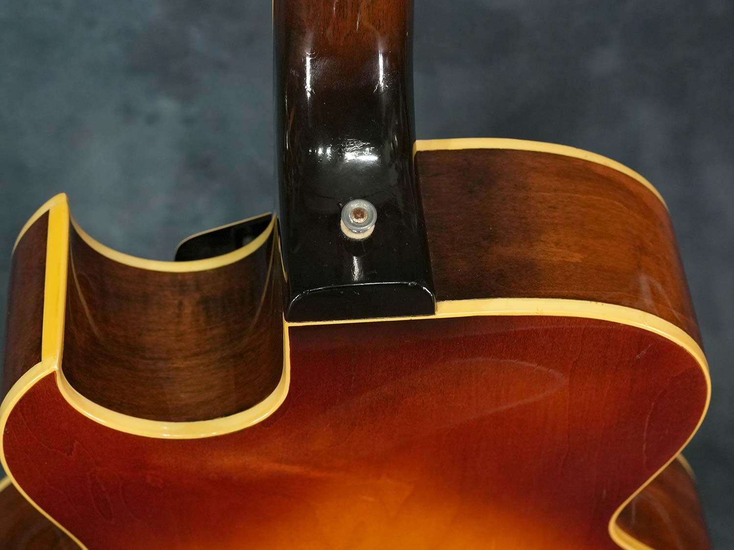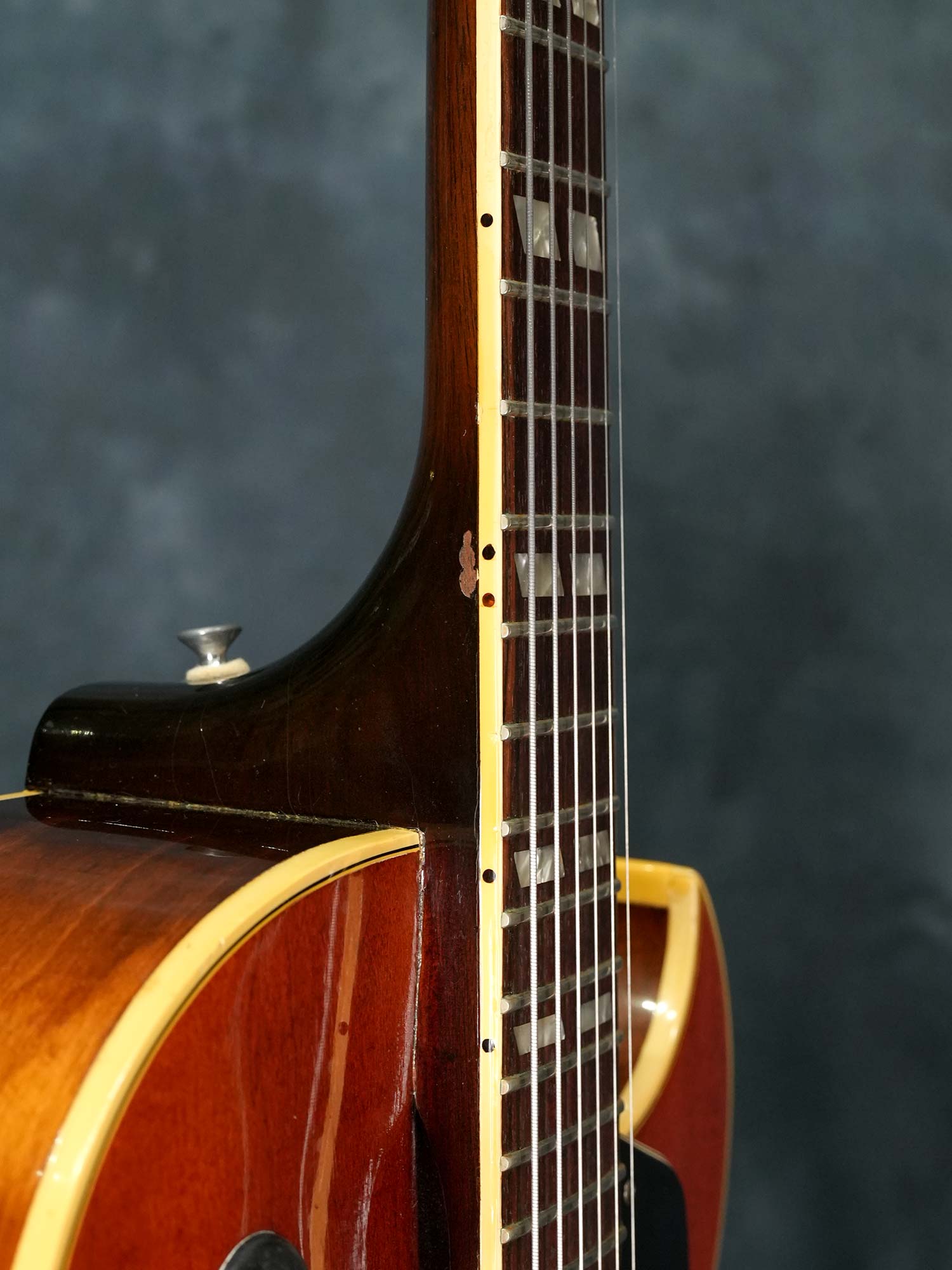 1960年代中期~1970年代中期は多くのGibson製品で所謂「ナローネック」と呼ばれる細身なネックになり、ES-175も他モデルと同じく1965年頃からナローネックが採用されるものの1970年頃には他モデルに先駆けてレギュラーネック幅に戻されており、本器も3-Pieceマホガニーのレギュラーネックで細身なネックが苦手な方にも弾き易いネック幅です。
