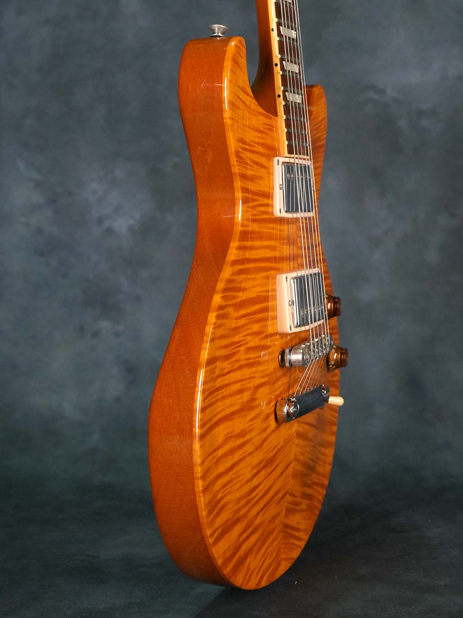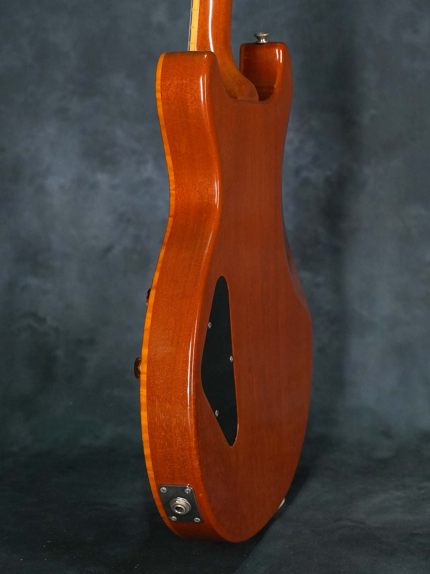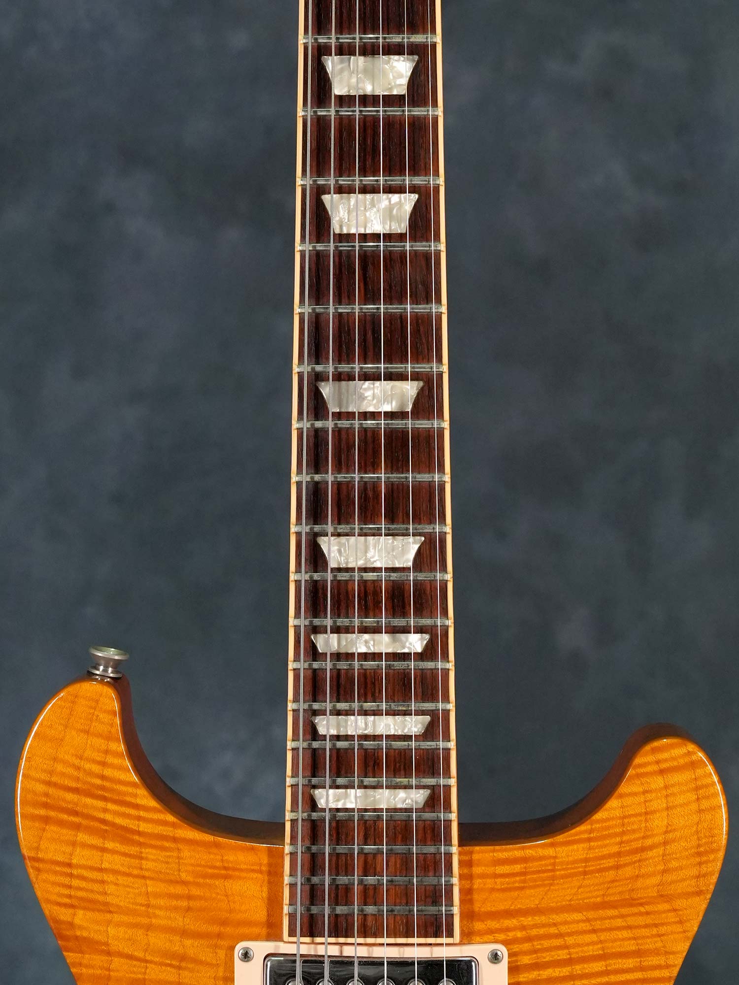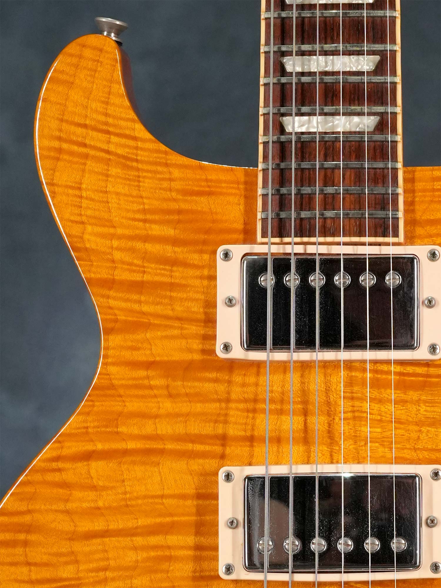 全体に濃淡の強いフィギュアの出たメイプルとアンバーカラーの組み合わせの雰囲気が良く、チェンバー構造による軽量&扱い易く格好良いハムバッカーのギターをお探しの方にオススメの1本です。