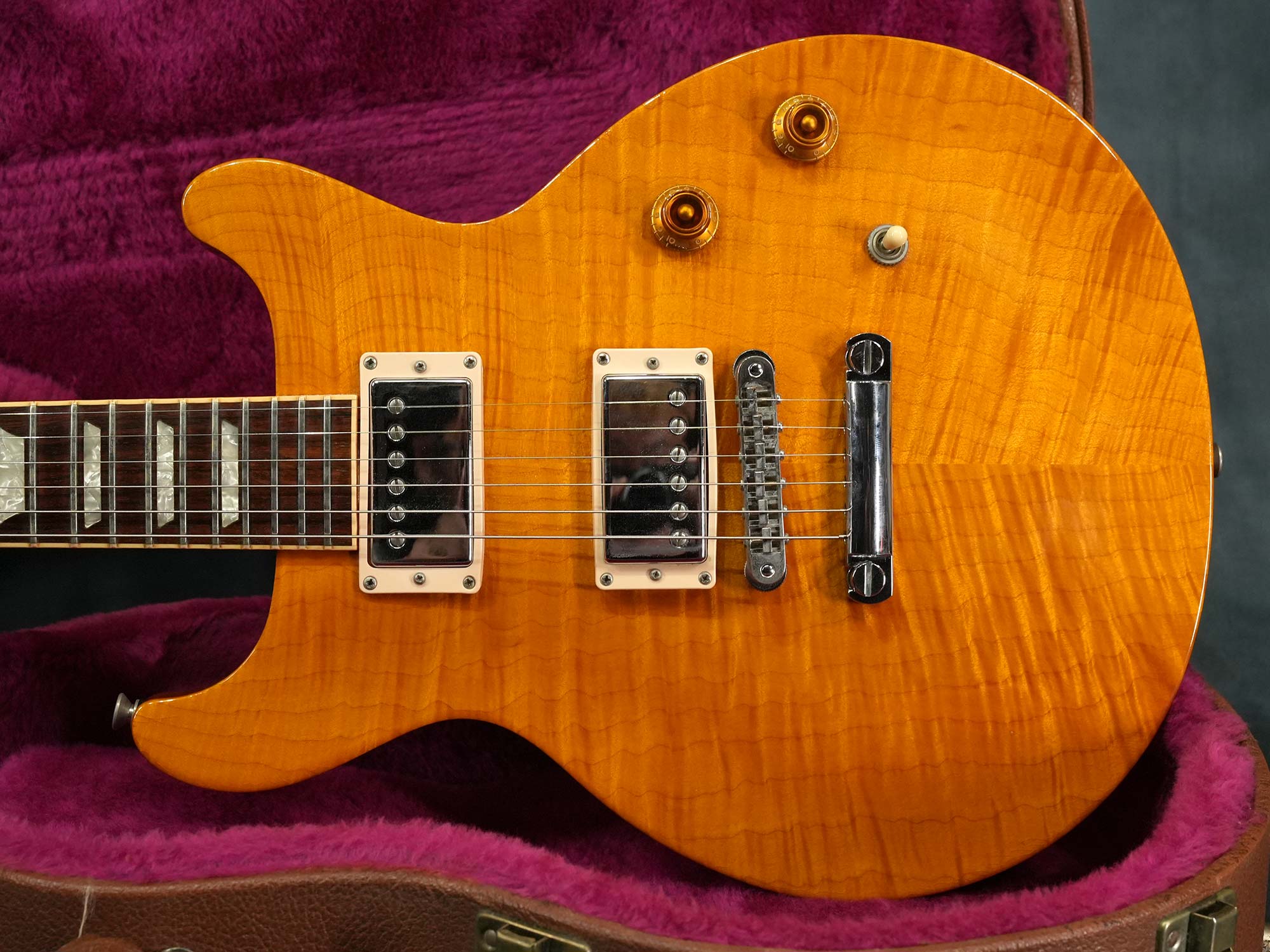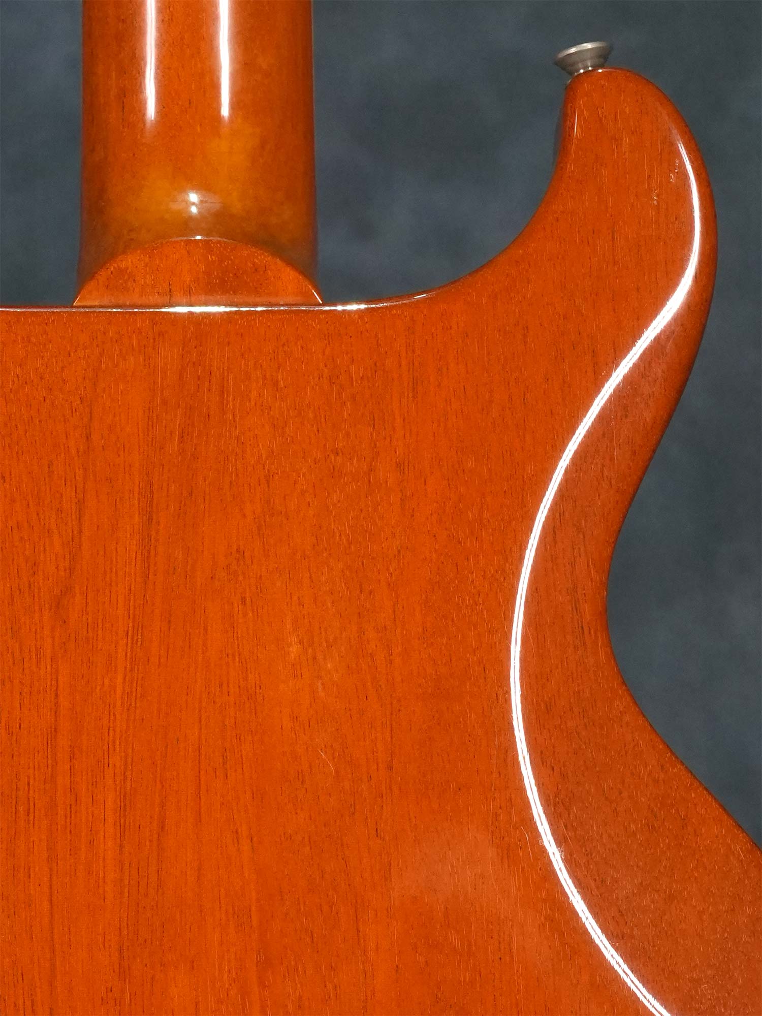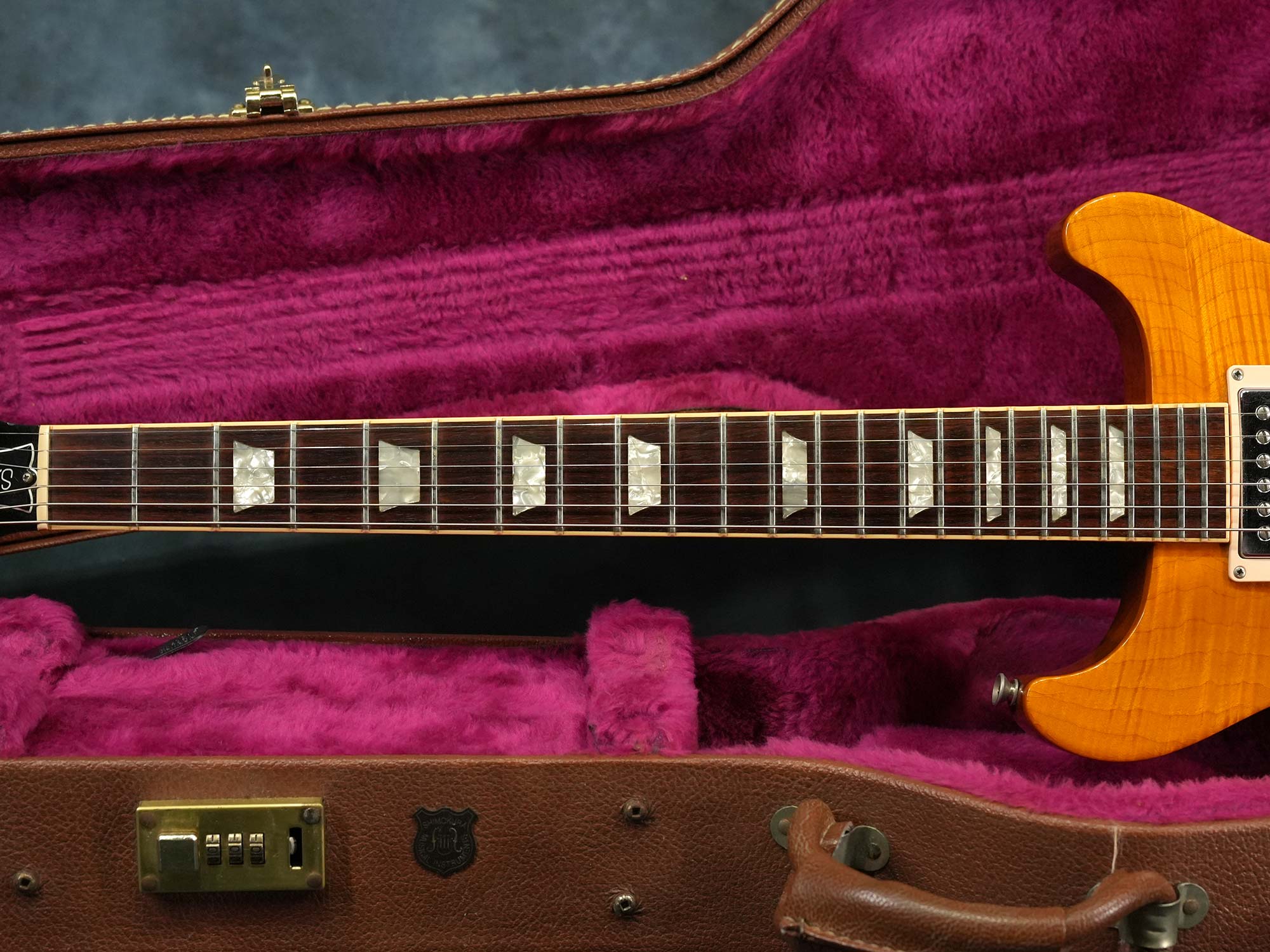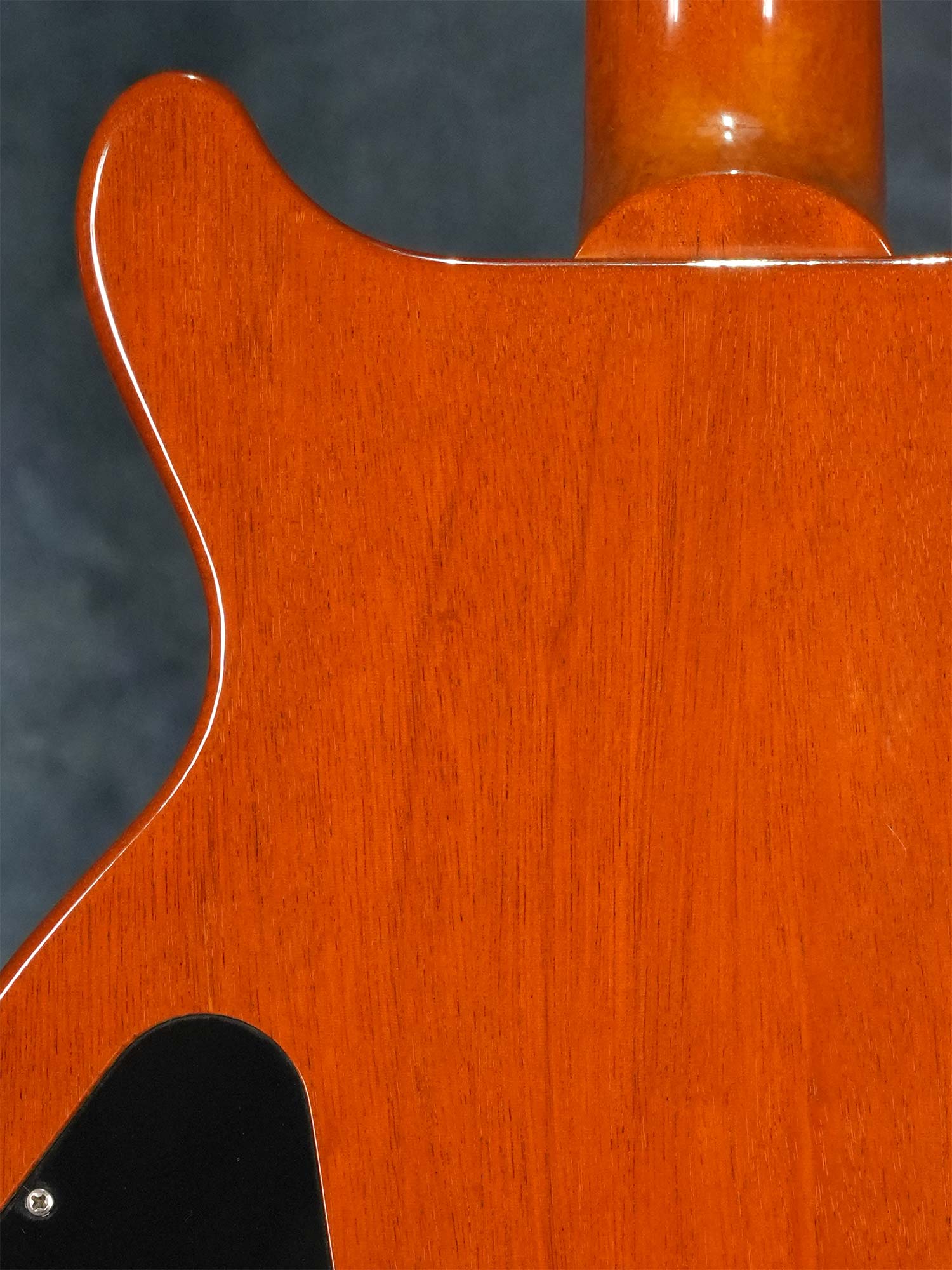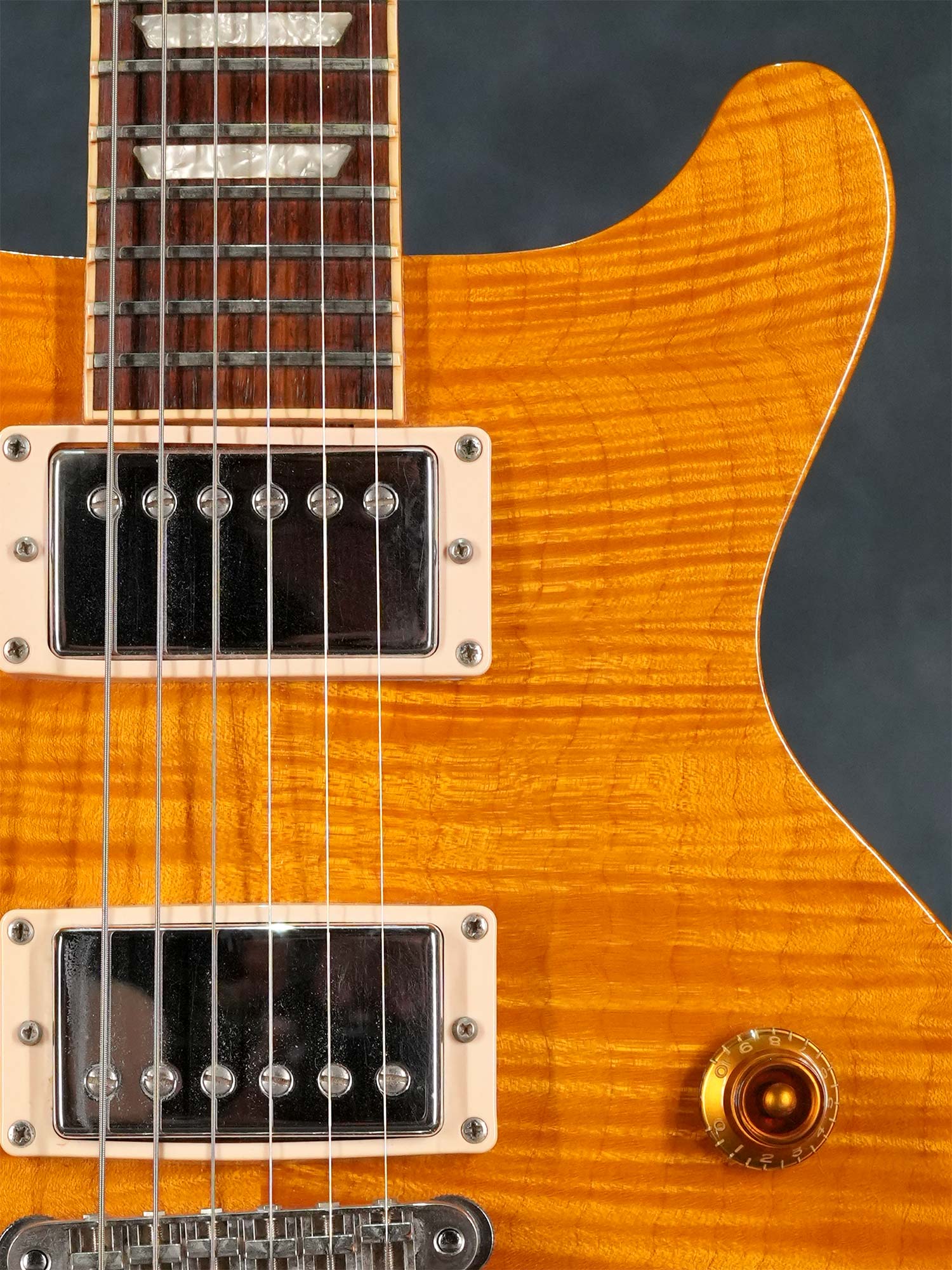 全体に濃淡の強いフィギュアの出たメイプルとアンバーカラーの組み合わせの雰囲気が良く、チェンバー構造による軽量&扱い易く格好良いハムバッカーのギターをお探しの方にオススメの1本です。