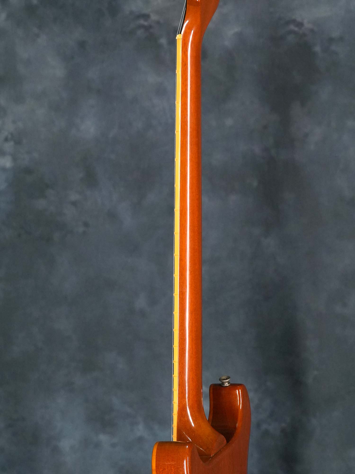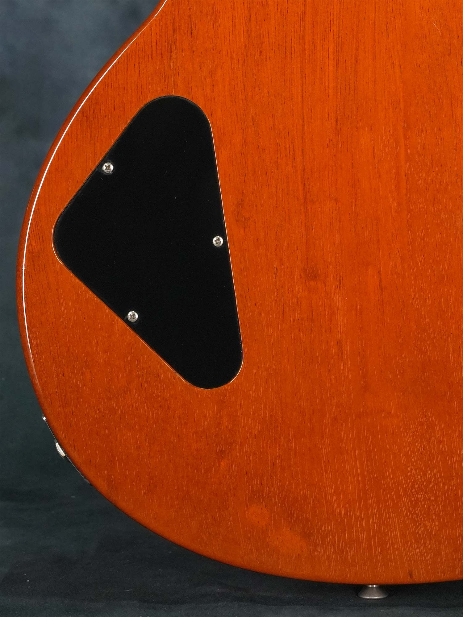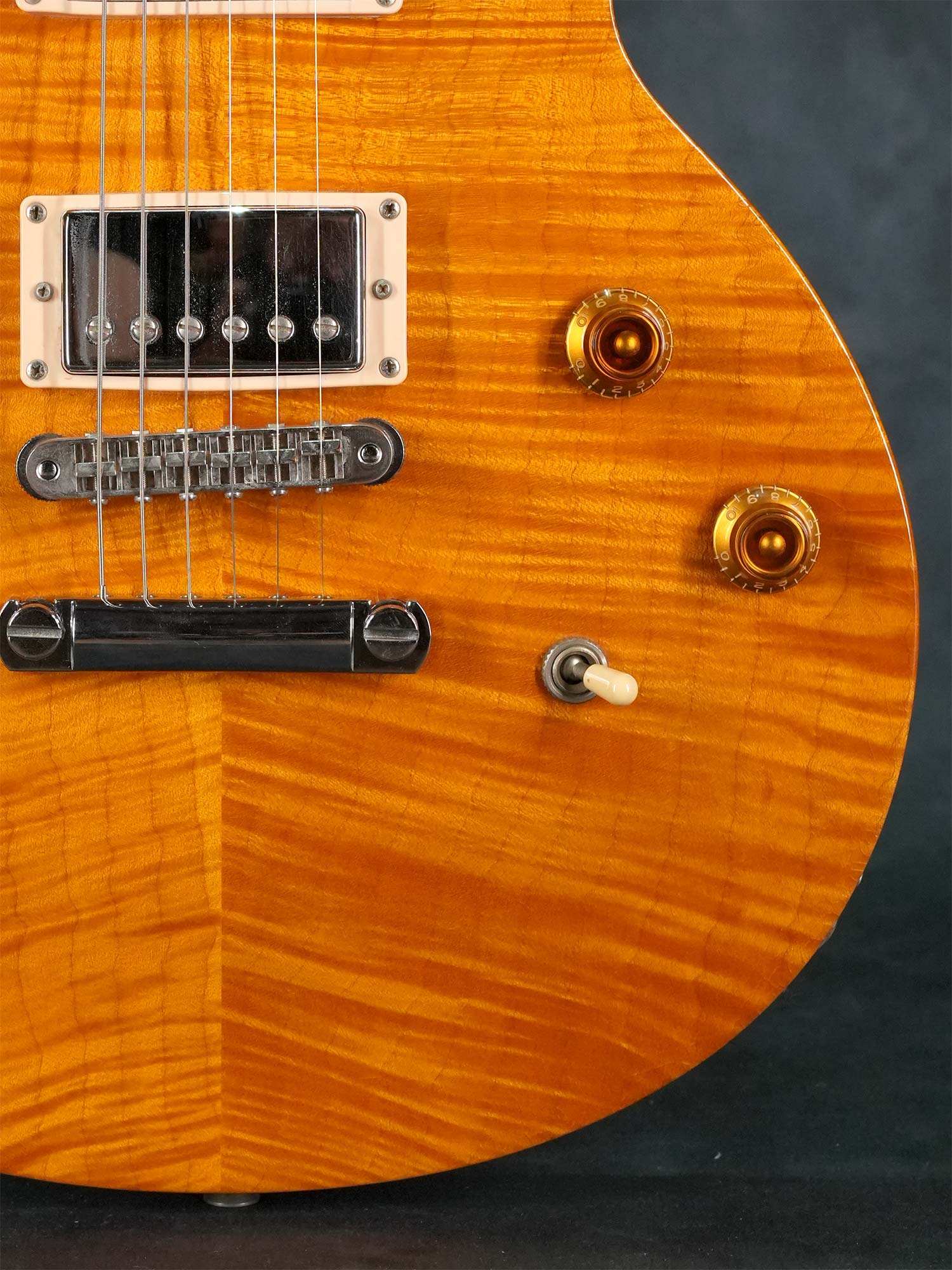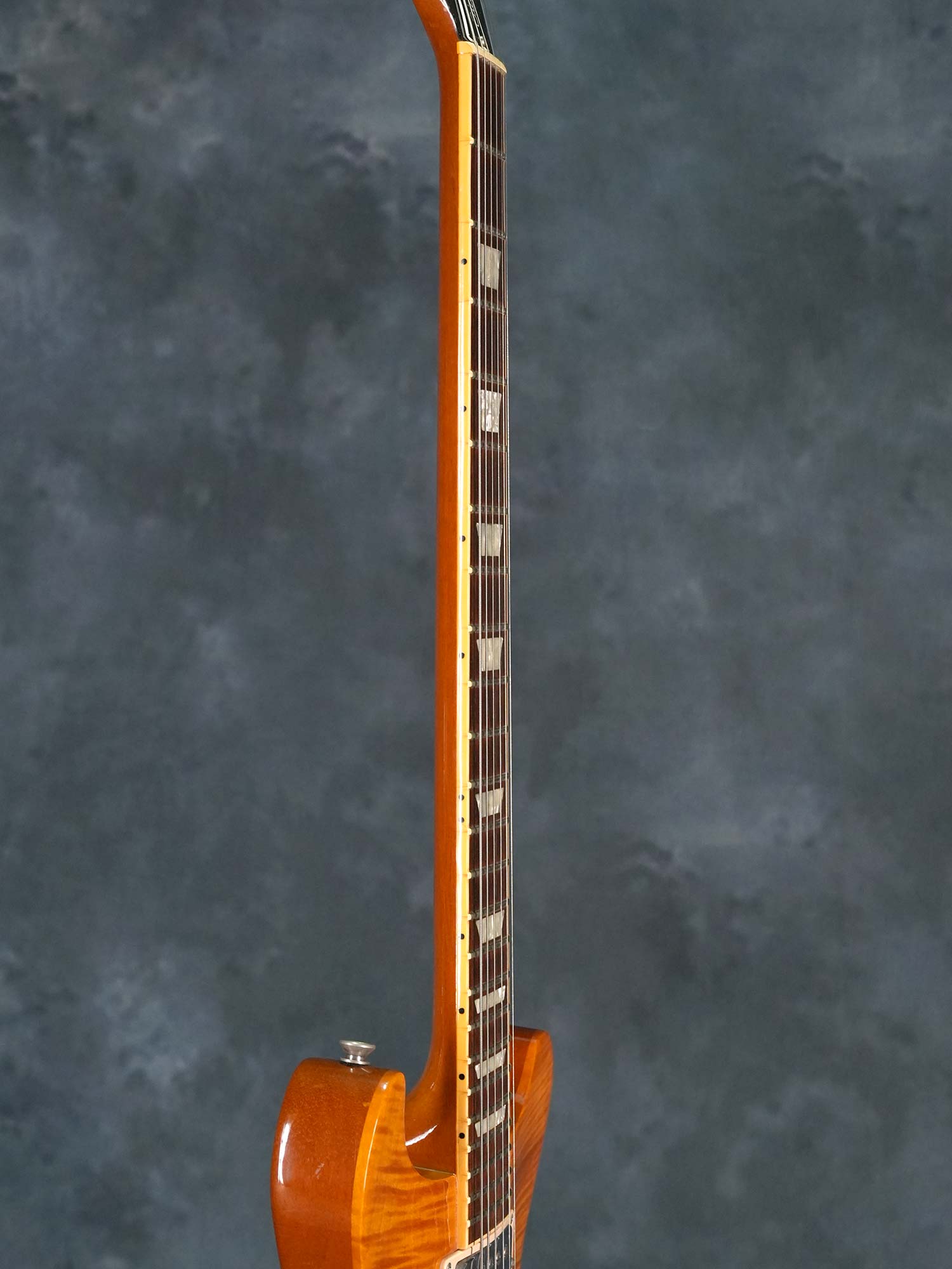 全体に濃淡の強いフィギュアの出たメイプルとアンバーカラーの組み合わせの雰囲気が良く、チェンバー構造による軽量&扱い易く格好良いハムバッカーのギターをお探しの方にオススメの1本です。