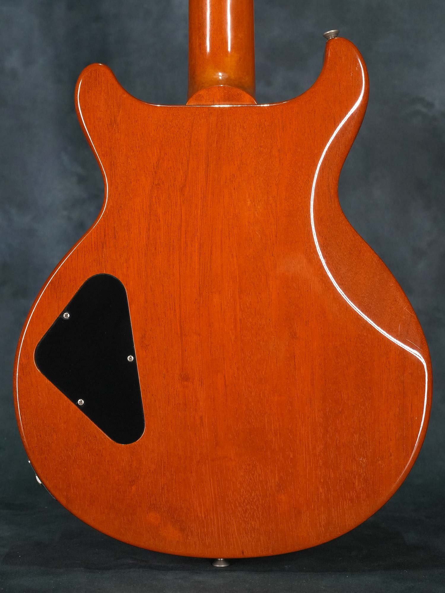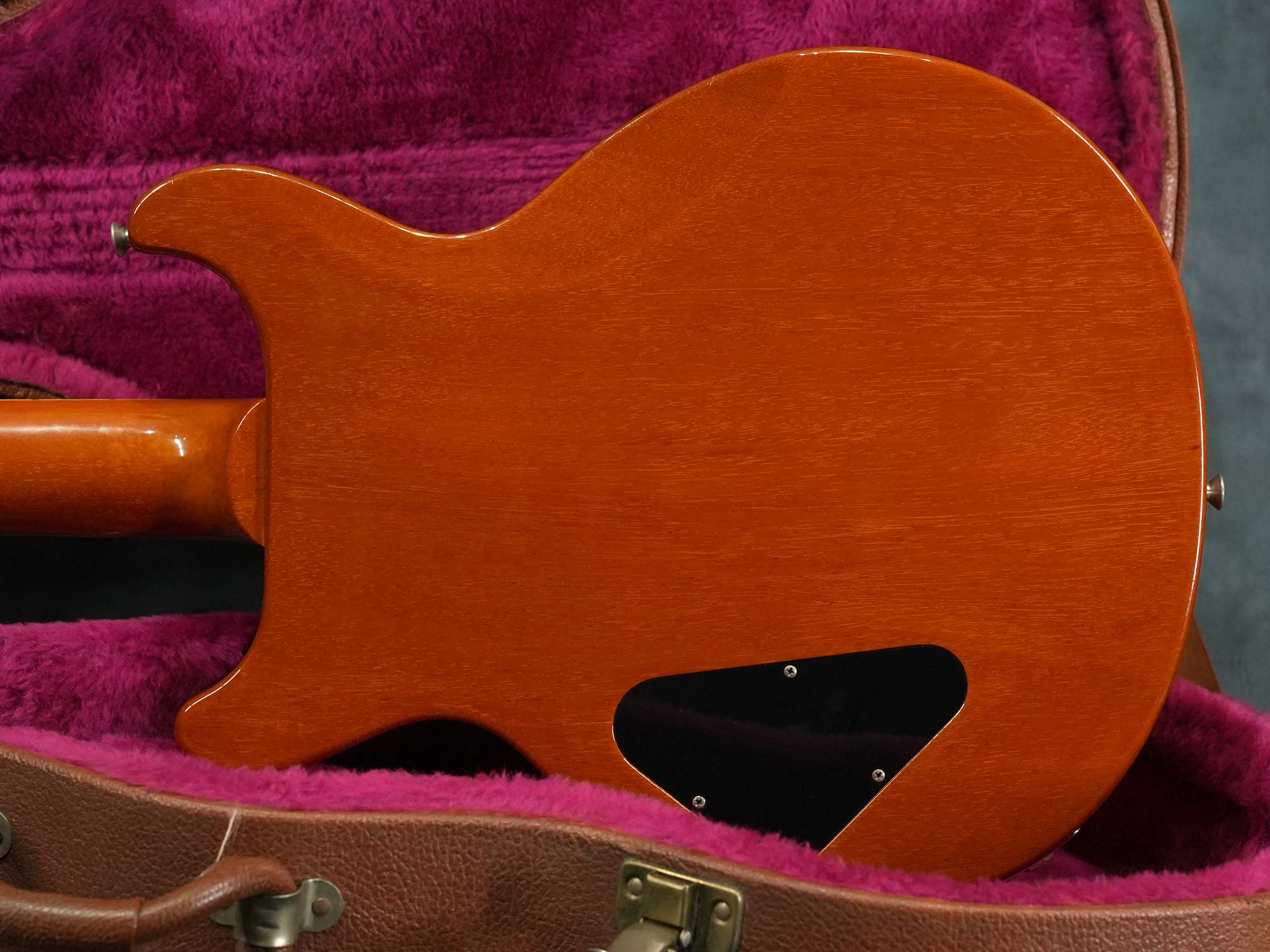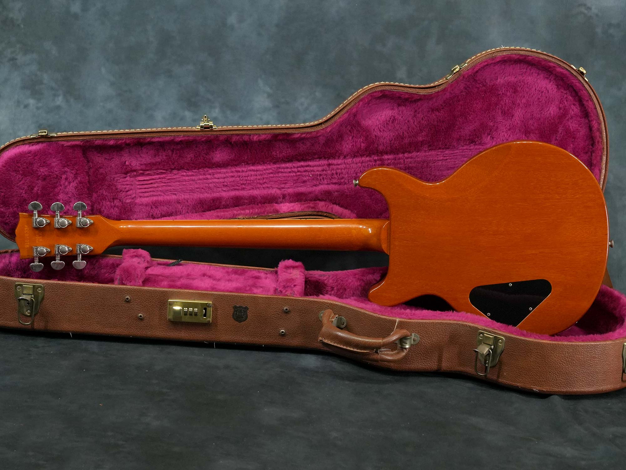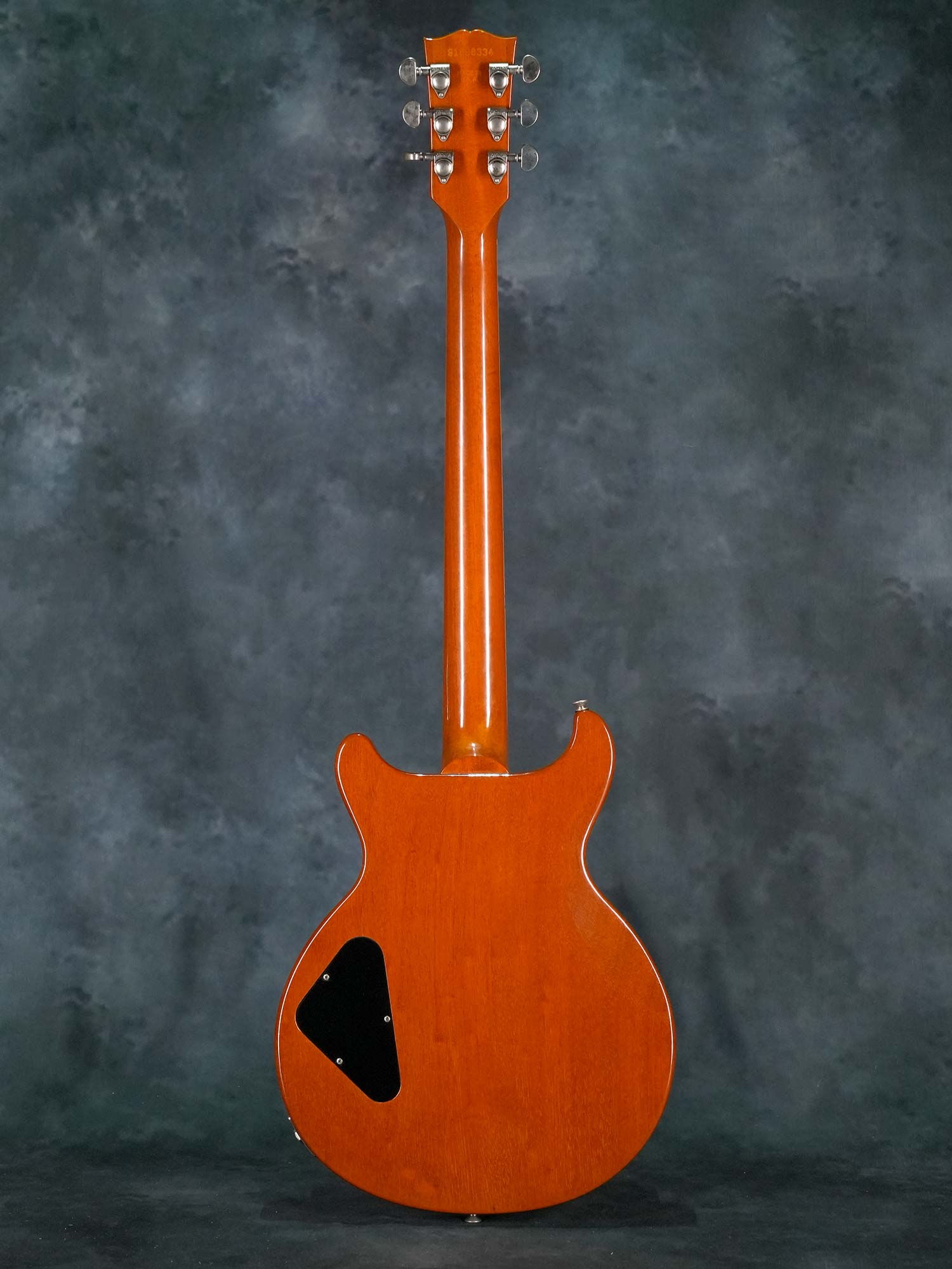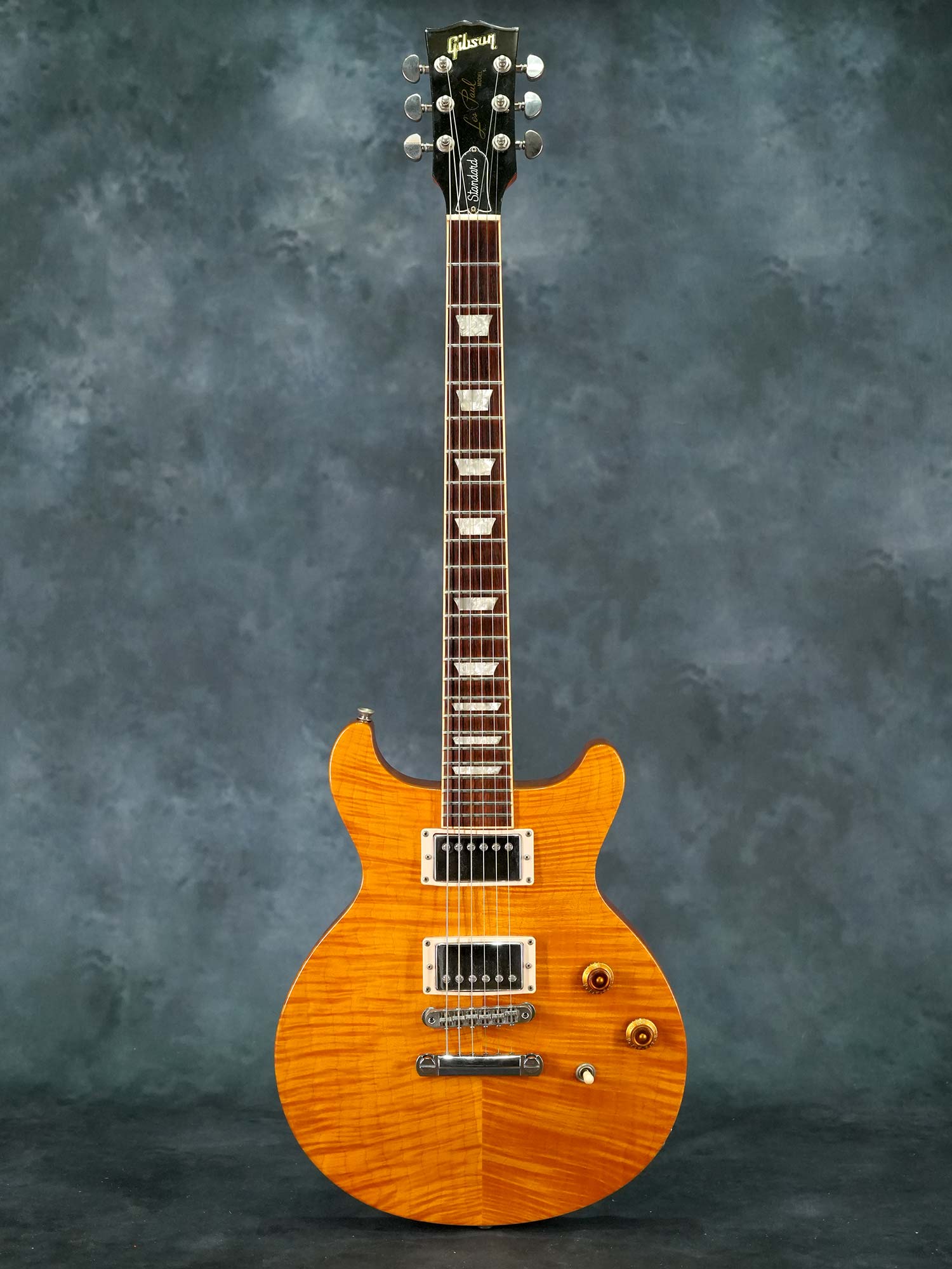 ハイポジション迄指が届くダブルカッタウェイのボディに24フレットを採用したGibson Les Paul Standard Double Cutaway (DC)、杢目の映えるアンバーカラーの1998年製中古品です。AAAグレードのフィギュアドメイプルトップ&k軽量化のため内部がくり抜かれたチェンバー構造かつコンター加工の入ったマホガニーバックボディ、薄身なマホガニーネック、24フレット仕様のローズウッド指板、ピックアップはフロントに490R&リアに498Tを搭載。
