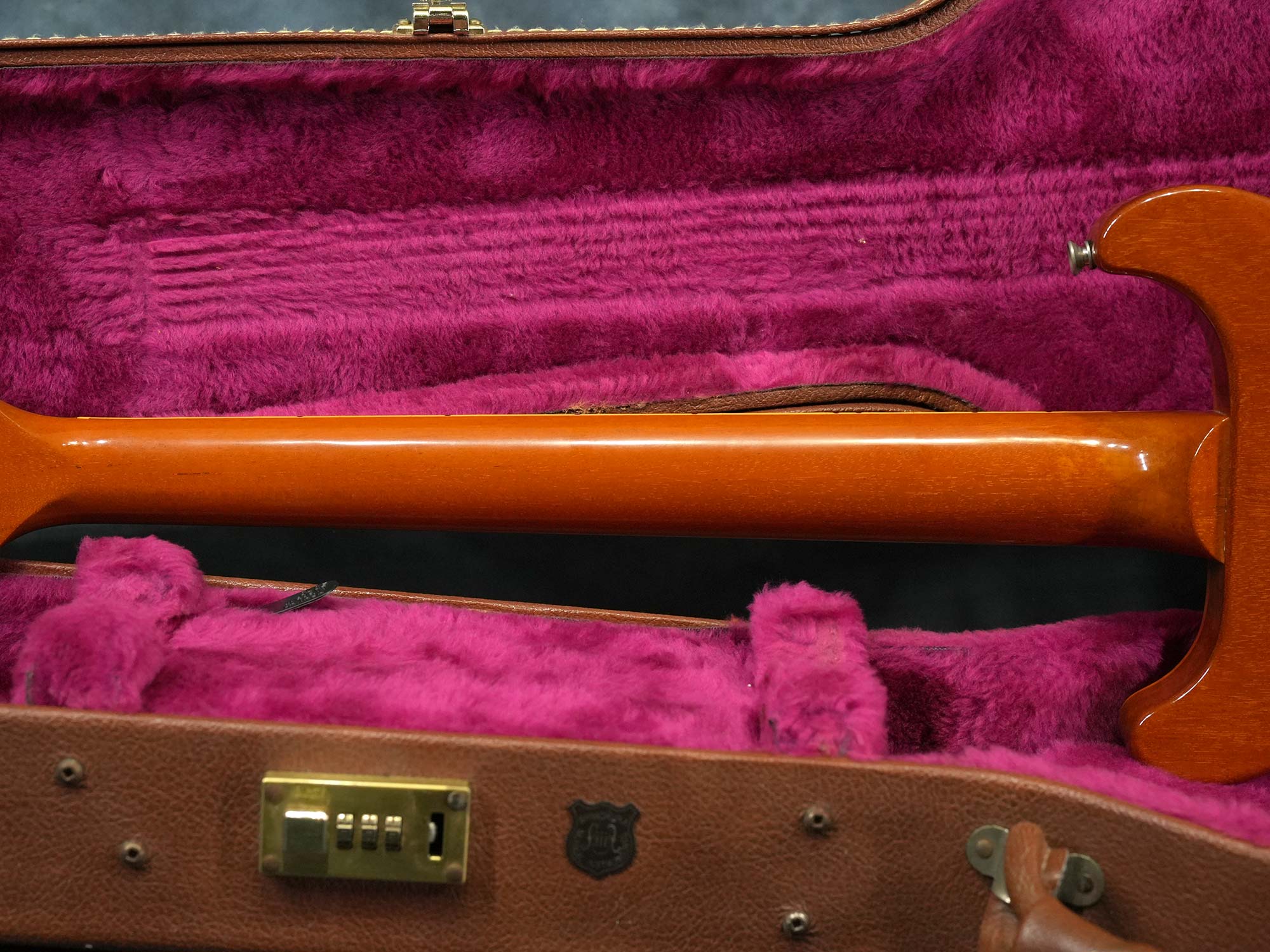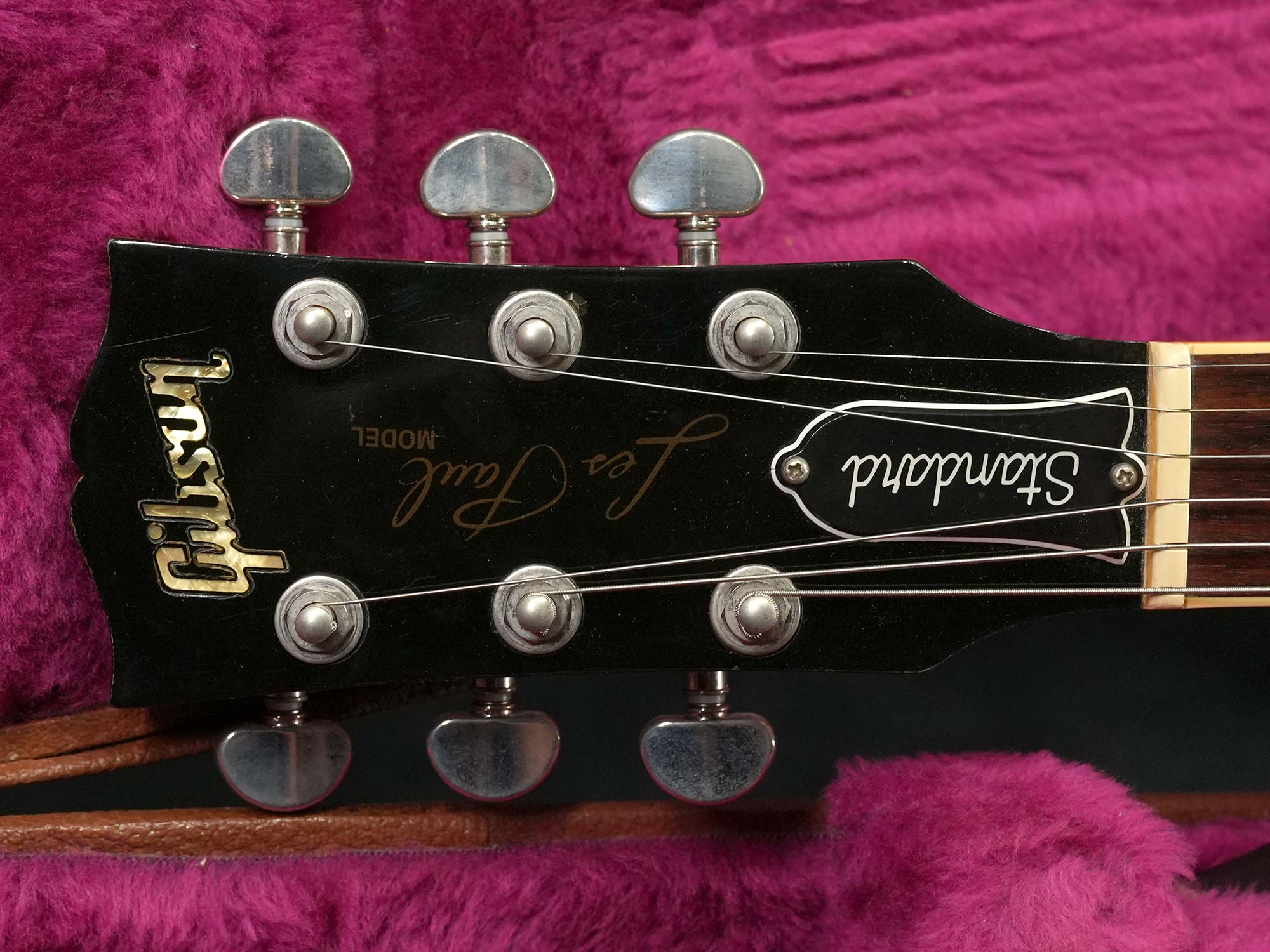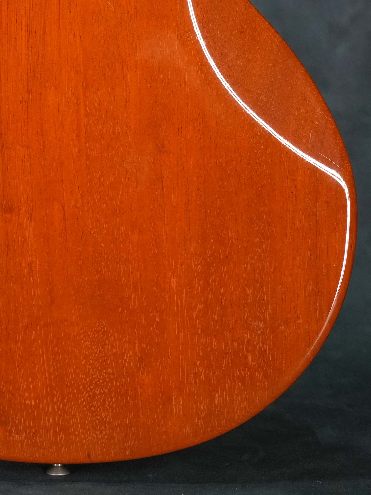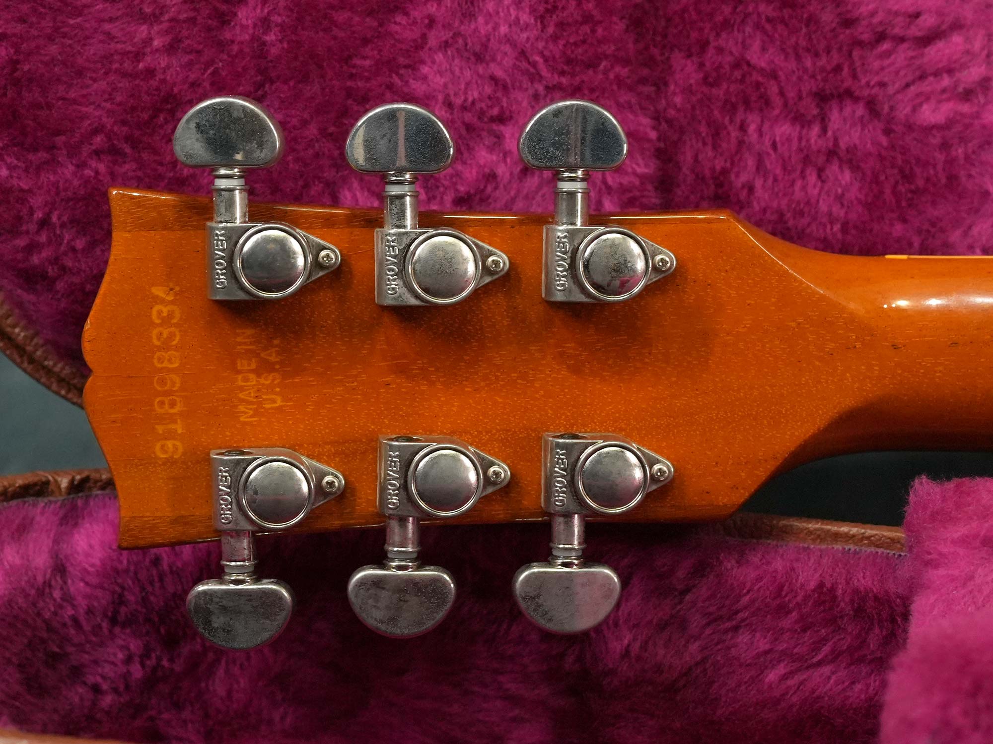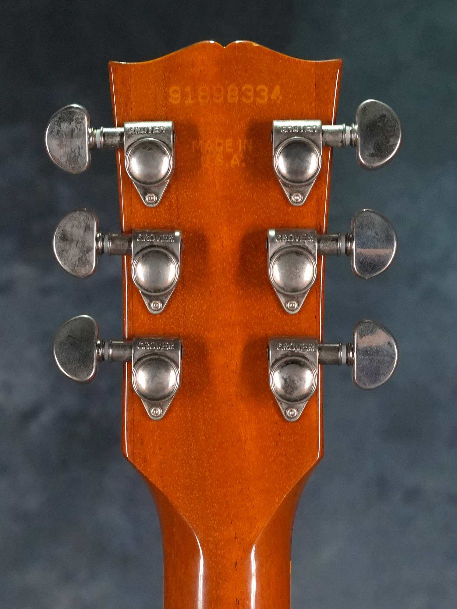 ペグがGrover 102へ、ブリッジがGotohのナッシュビルタイプへ、ストラップピンが他社の物へ交換されています。経年によりヘッドのGibsonロゴ周辺は塗装にヒビが入っており、写真では分かり難いもののボディにはウェザーチェックも入っています。弾き傷や擦り傷に加えてボディバックはバックル痕により中心付近の塗装が凸凹しているなど全体的に使用感はあるものの、木部の割れやヒビを伴うような大きなダメージは有りません。