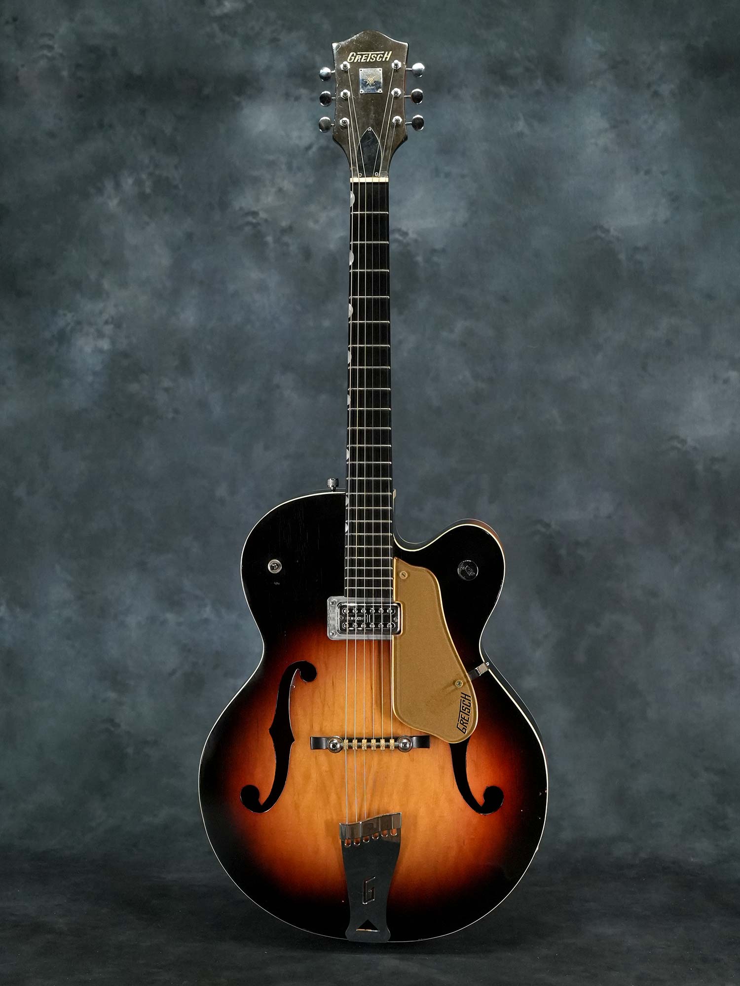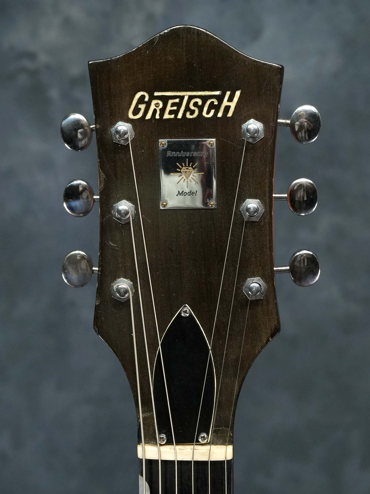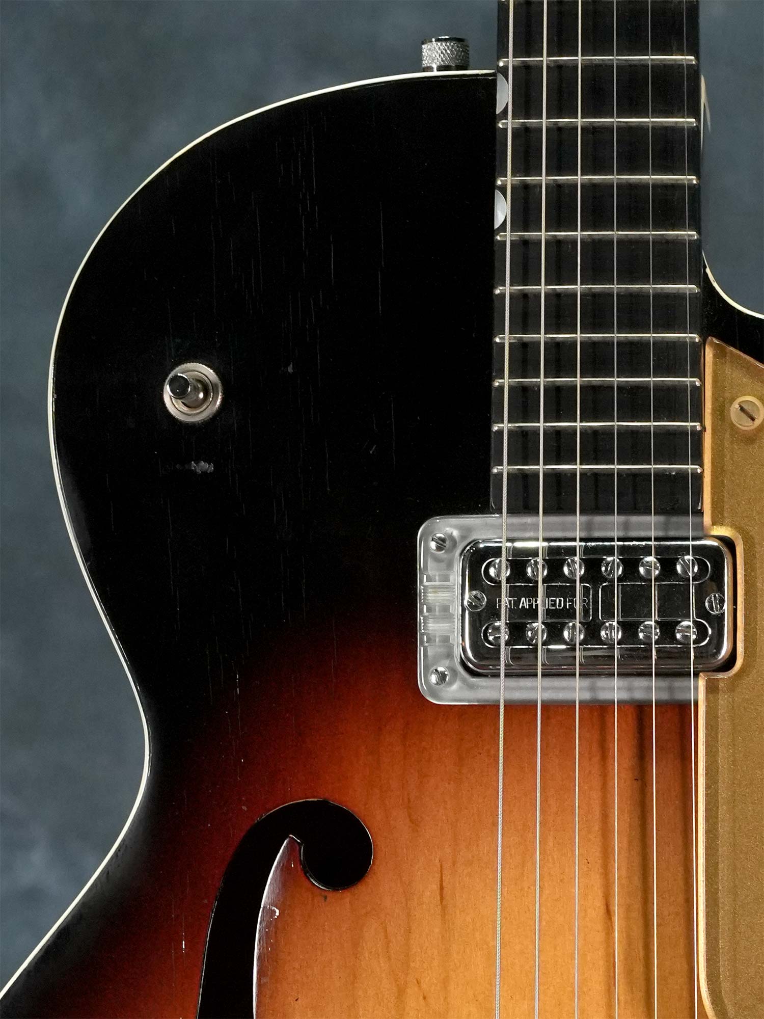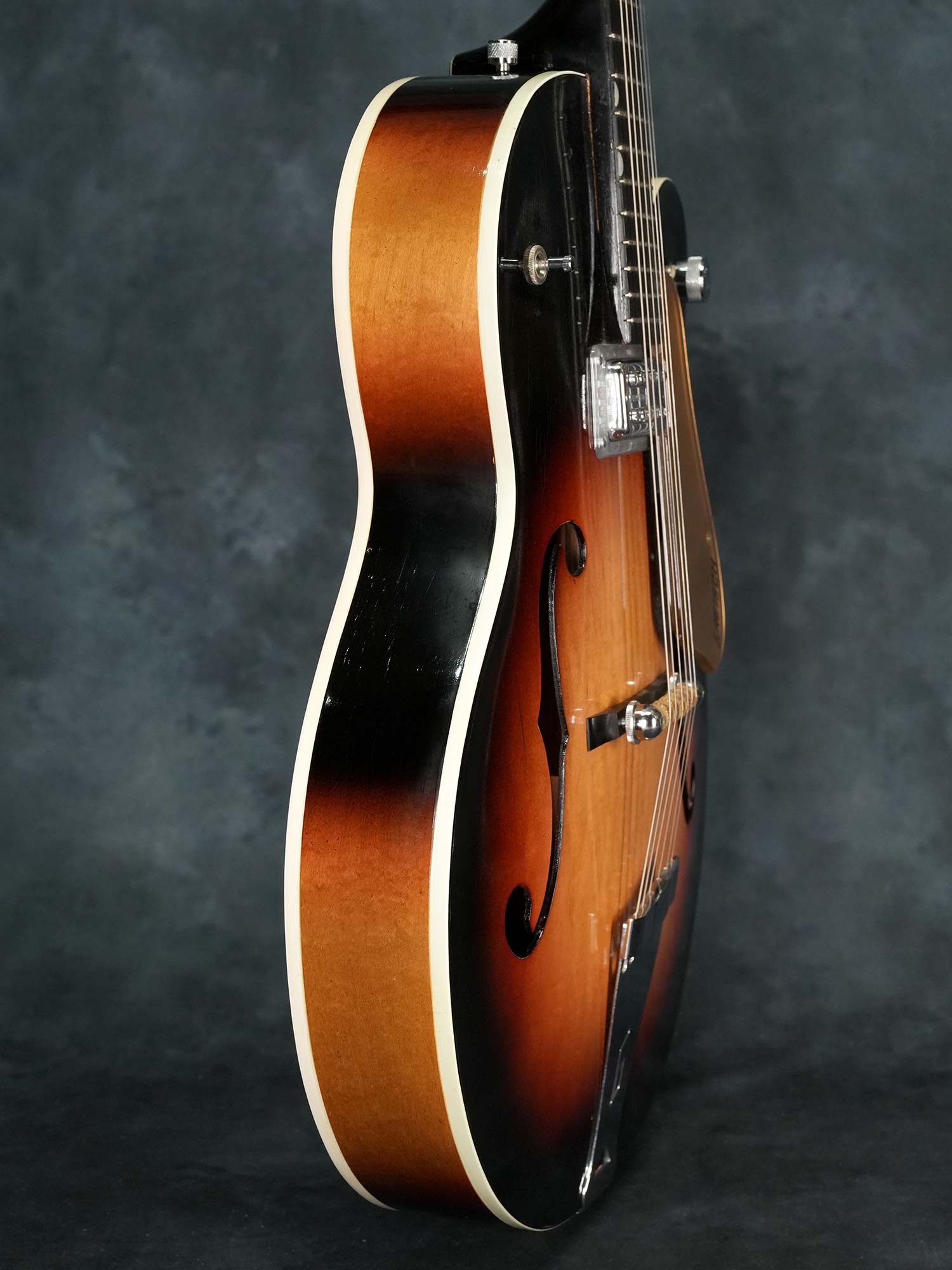 Gretsch社の135周年を記念して1958年に発売されたアニヴァーサリーモデル。一般的に「記念モデル」では数量や製造年が限定されている事が多いものの、仕様を変えながら1958年~1971年まで約23年に渡って製造されていたロングセラーモデルで、ピックアップの数やカラーヴァリエーションなど複数のモデルが有る中で、本器は1958年の発売から1959年までの約2年程と短い期間のみ製造された「”PAF”フィルタートロン・ピックアップ」搭載の1959年製 Gretsch 6124 Single Anniversary です。ラミネイトメイプルのフルアコースティックボディに、ナット幅42.7mmかつやや薄身なメイプルネック、サムネイルインレイの入ったエボニー指板、Gテイルピース、弦間を自由に設定可能なスペースコントローラーブリッジ、ピックアップはPATTENT APPLIED FOR(特許出願中)刻印の入った通称”PAF”フィルタートロン・ハムバッカーを搭載し、3-WayのトーンセレクターにVolumeのみのシンプルなコントロール。