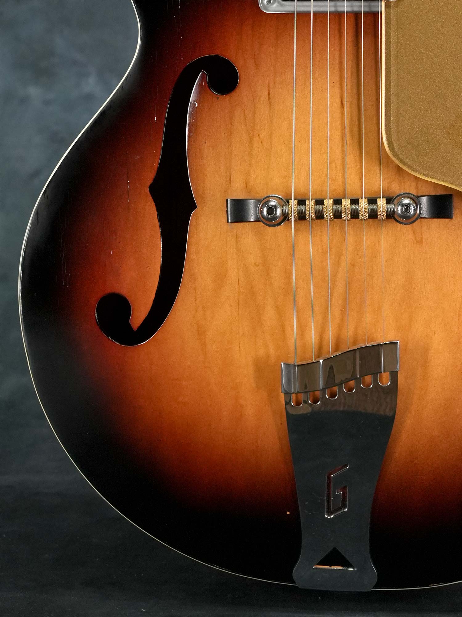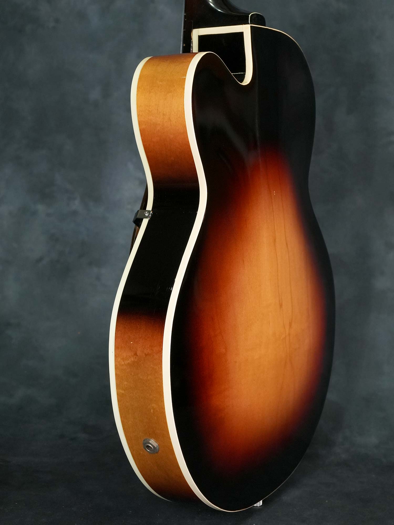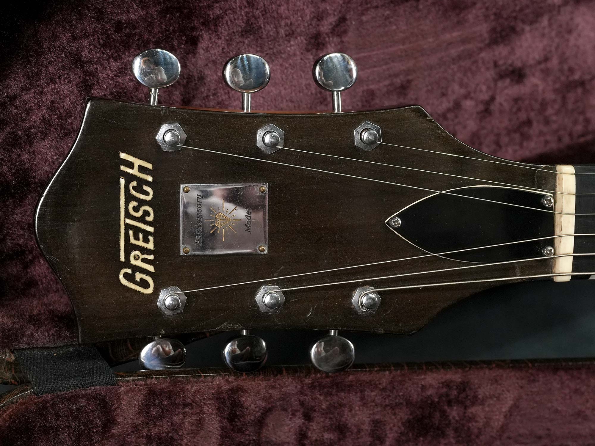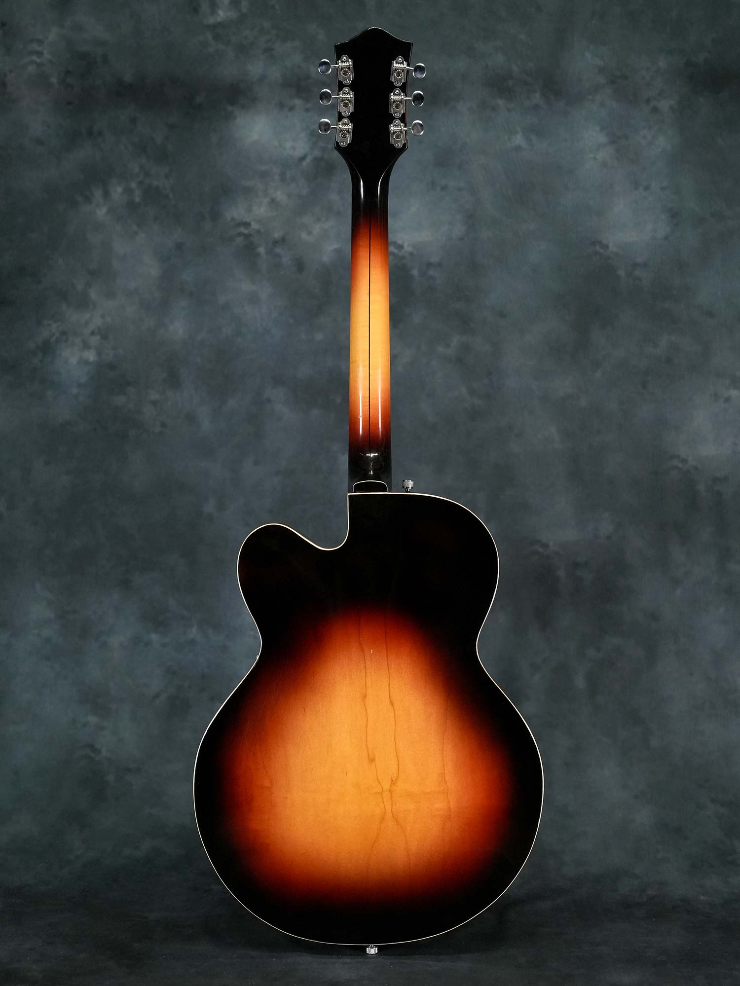 Gretsch社の135周年を記念して1958年に発売されたアニヴァーサリーモデル。一般的に「記念モデル」では数量や製造年が限定されている事が多いものの、仕様を変えながら1958年~1971年まで約23年に渡って製造されていたロングセラーモデルで、ピックアップの数やカラーヴァリエーションなど複数のモデルが有る中で、本器は1958年の発売から1959年までの約2年程と短い期間のみ製造された「”PAF”フィルタートロン・ピックアップ」搭載の1959年製 Gretsch 6124 Single Anniversary です。ラミネイトメイプルのフルアコースティックボディに、ナット幅42.7mmかつやや薄身なメイプルネック、サムネイルインレイの入ったエボニー指板、Gテイルピース、弦間を自由に設定可能なスペースコントローラーブリッジ、ピックアップはPATTENT APPLIED FOR(特許出願中)刻印の入った通称”PAF”フィルタートロン・ハムバッカーを搭載し、3-WayのトーンセレクターにVolumeのみのシンプルなコントロール。