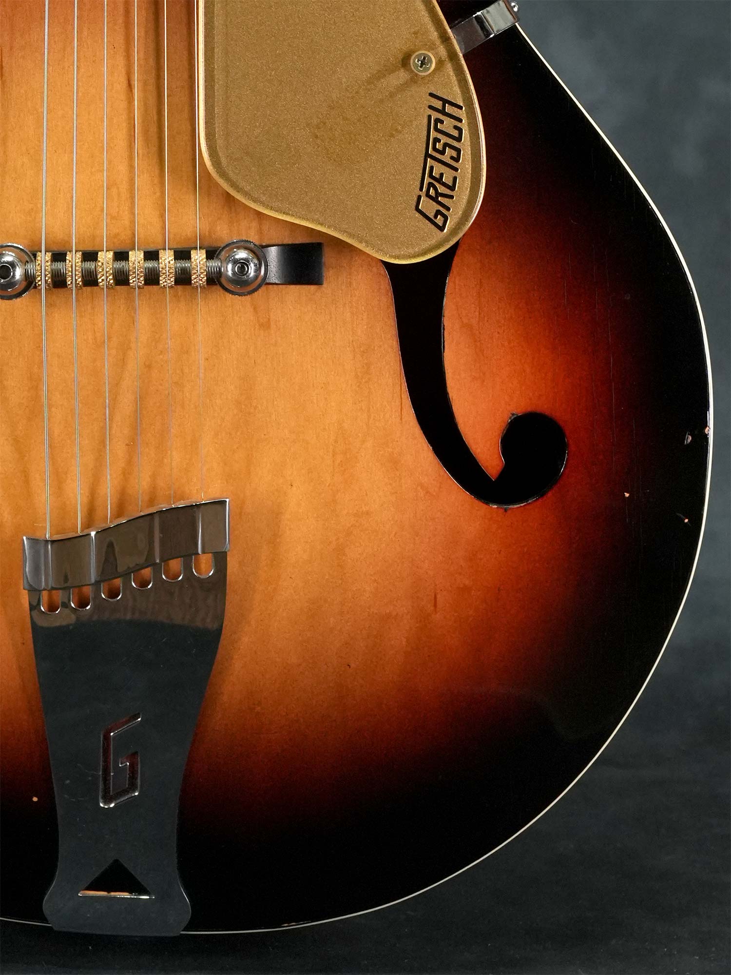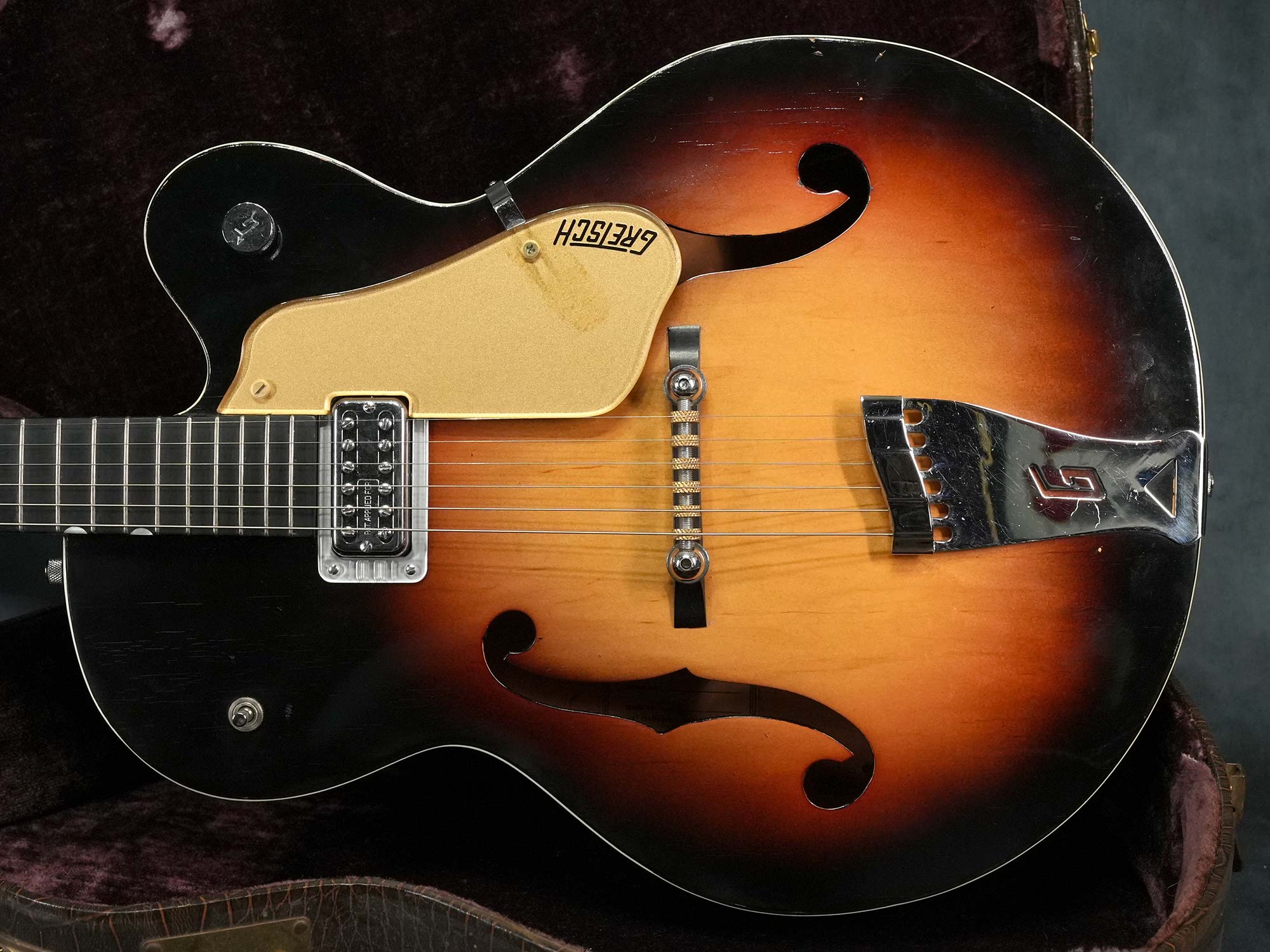 フィルタートロン・ハムバッカーの温かさと、ヘヴィパターンのブレーシングにより、適度なアコースティック感は残しつつタイトでクリアな心地よいグレッチサウンド、木部補修歴はあるものの全体的に綺麗なコンディションを保っており、しっかり使える50sグレッチをお探しの方にオススメの一本です。