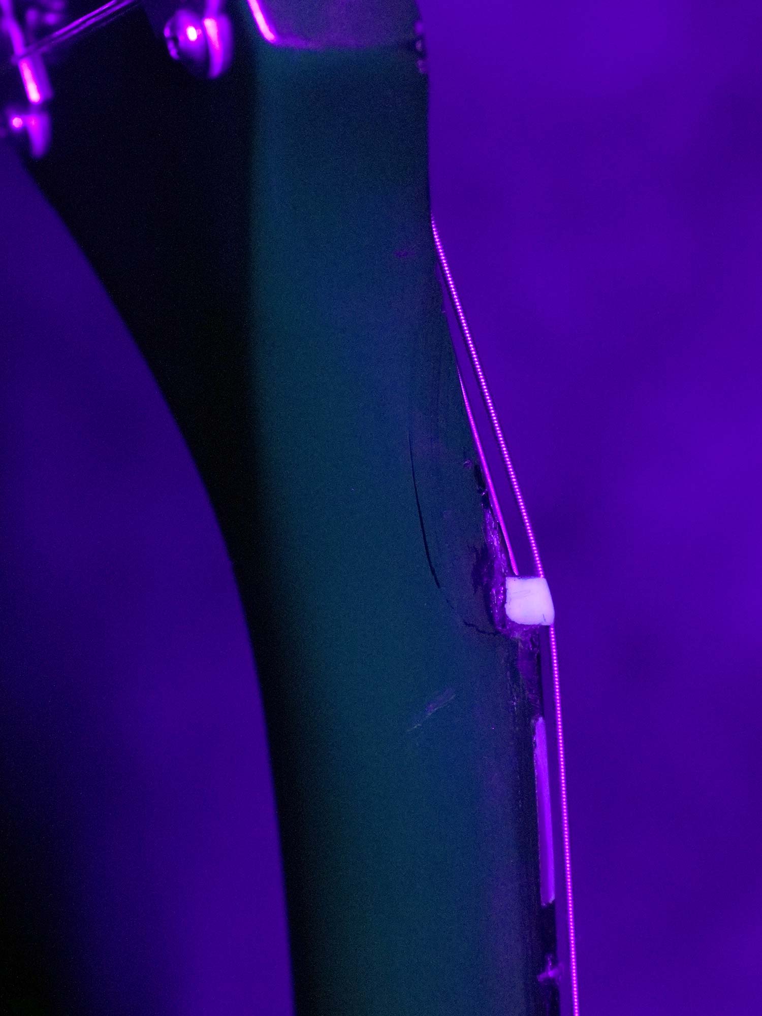 ヘッドストックのナット付近とネックサイドの6弦側ナット付近に木部の割れ補修とタッチアップ跡があるものの大きく割れたような形跡は有りません。ヘッド~ネック~ボディに掛けて全体的にウェザーチェックが入っており、所々塗装剥がれを伴うダメージはあるものの、極端に大きなダメージは無く年式を考えればとても綺麗な状態を保っています。