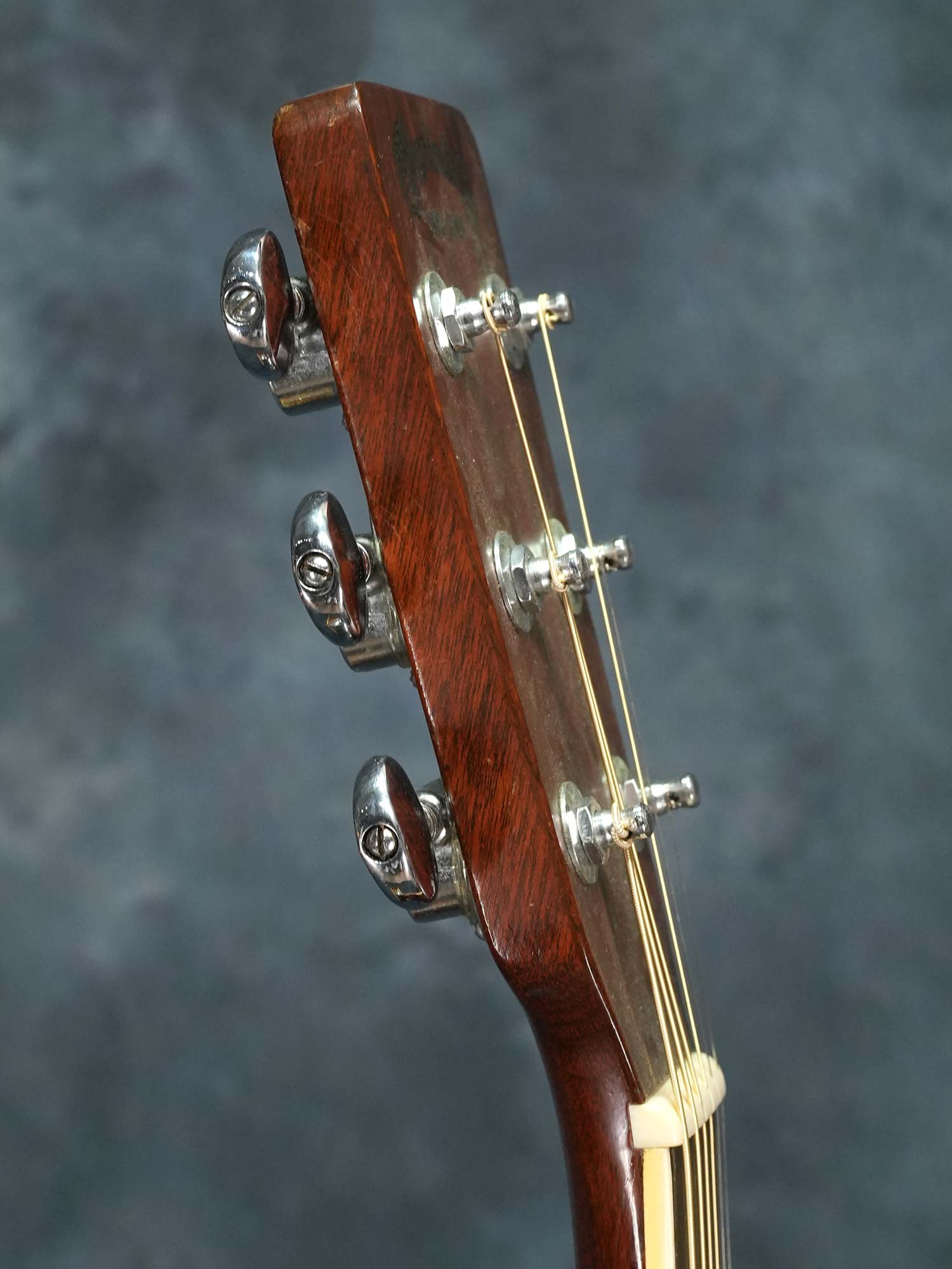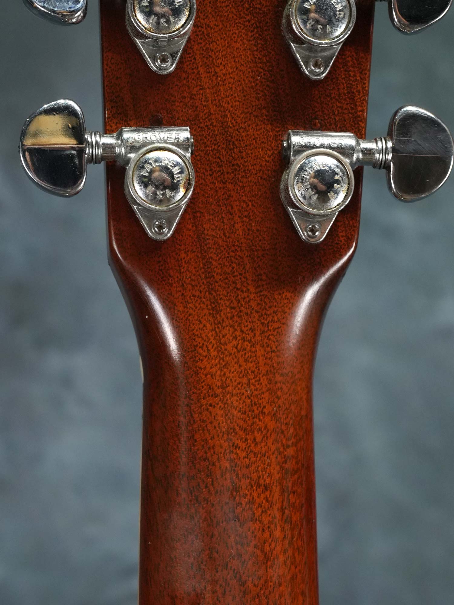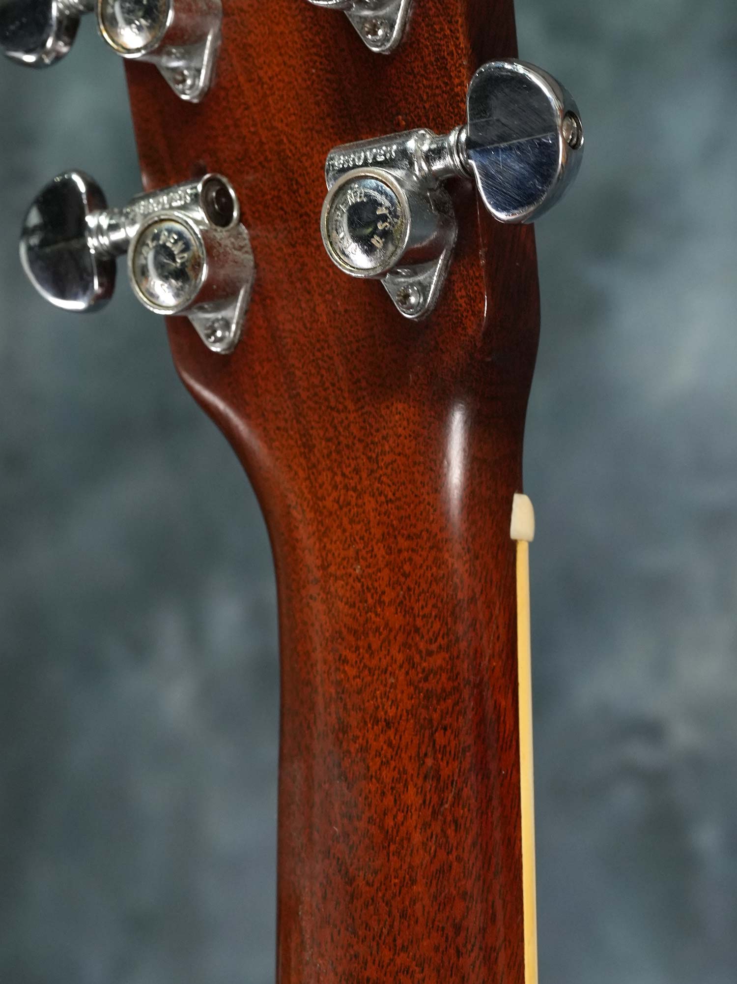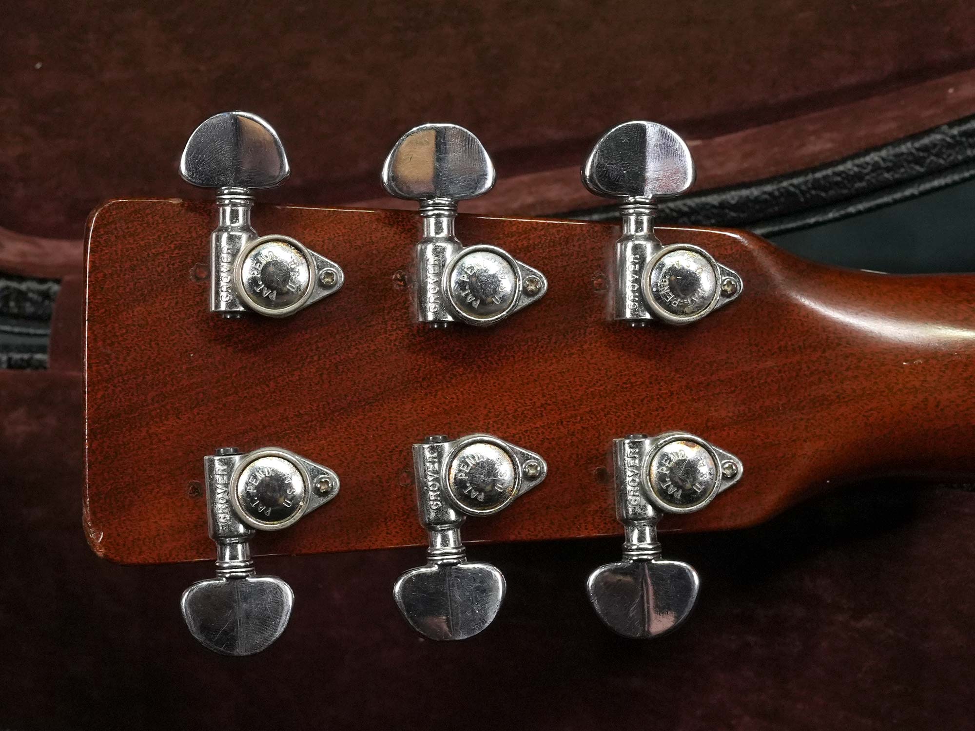 ナット付近から数センチに渡ってネックのヒビが接着補修されておりネック裏1~3フレット付近がタッチアップされています。ピックガード内側のピックガードクラックが裏側から補強を入れてしっかり修理されてピックガードは交換済。ペグは一時期他のタイプが取り付けられていたようで各ペグの上部に別のペグ取り付け穴を埋めた跡が有りますが、現在はオリジナルのPAT PEND Groverに戻されており動作も問題有りません。エレアコとして使われていた時期が有りエンドピンがエンドピンジャックサイズになっています。