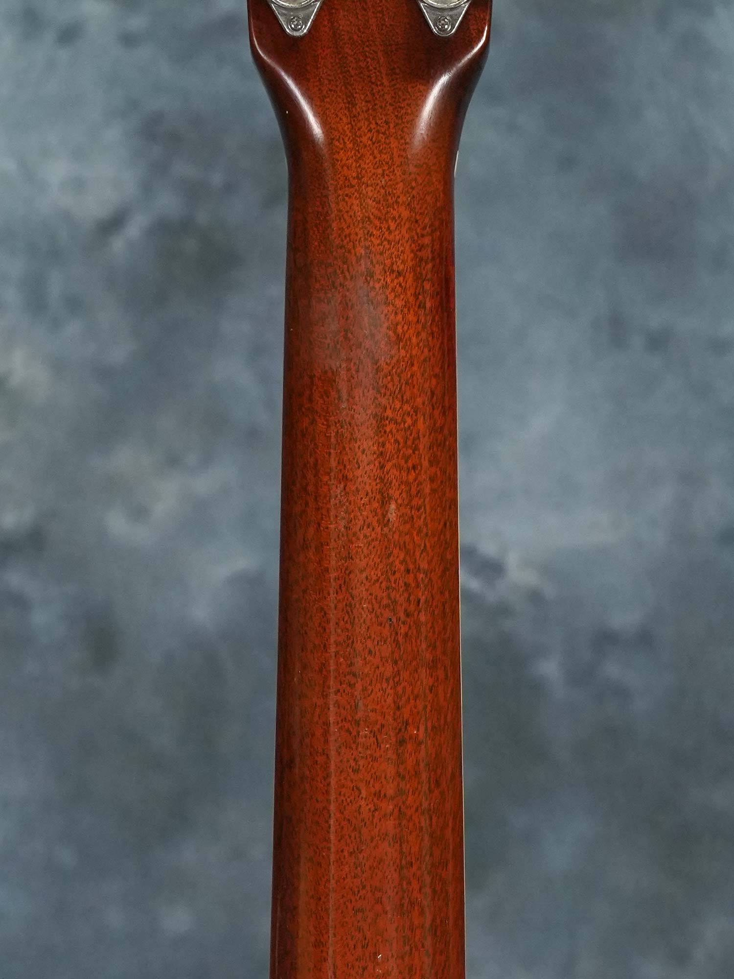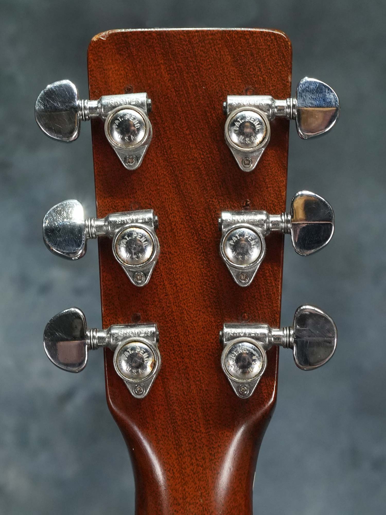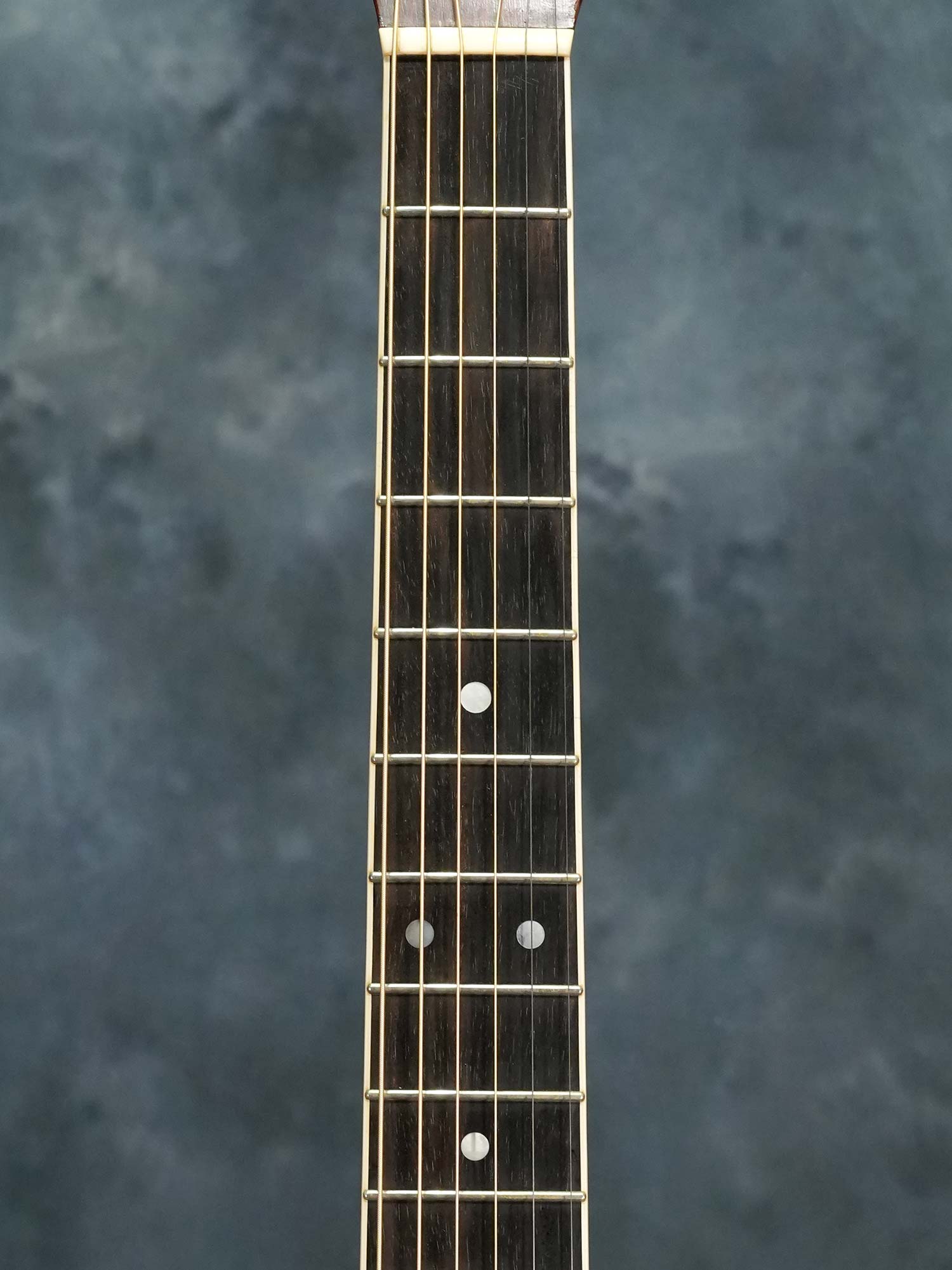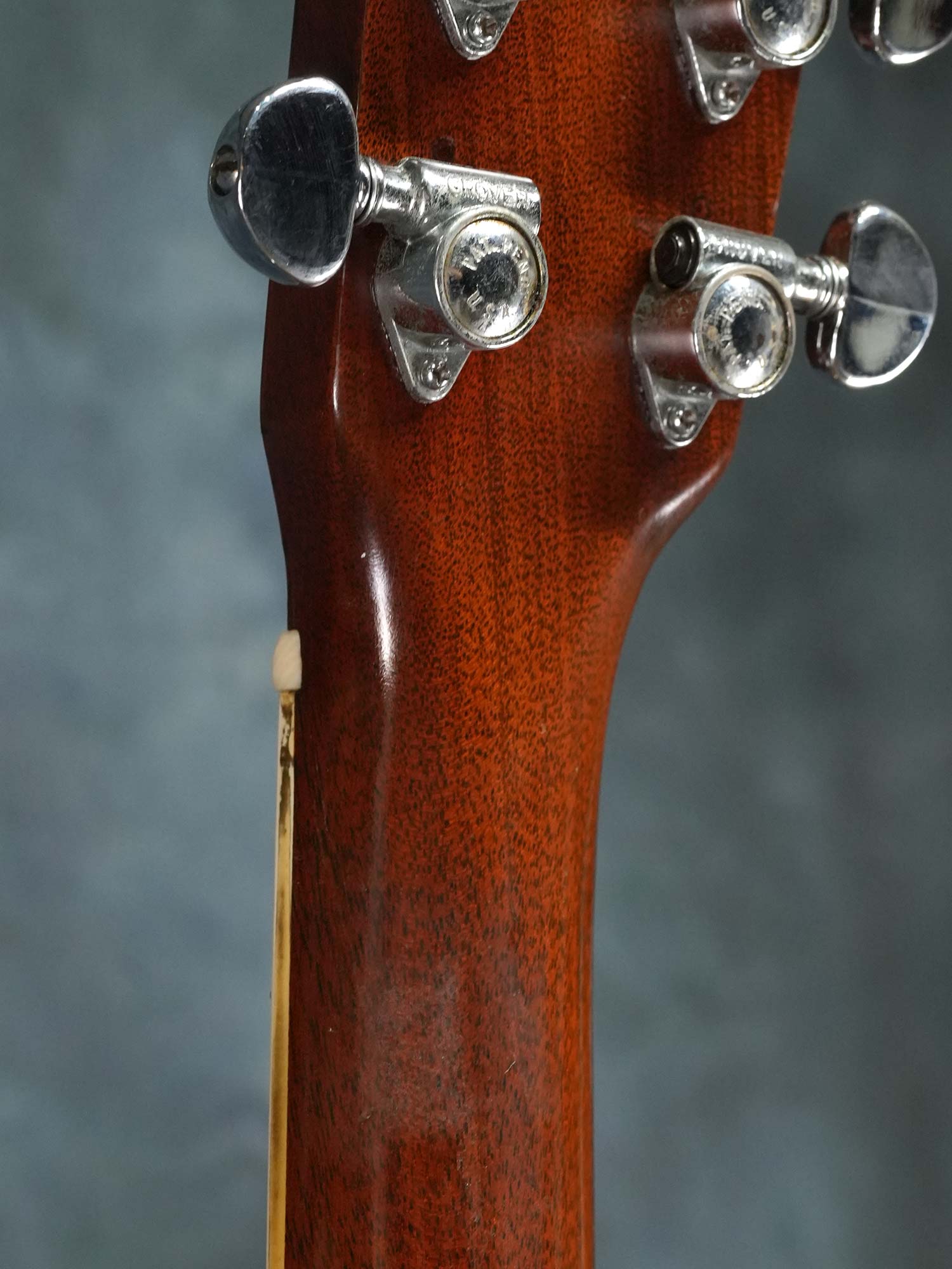 ナット付近から数センチに渡ってネックのヒビが接着補修されておりネック裏1~3フレット付近がタッチアップされています。ピックガード内側のピックガードクラックが裏側から補強を入れてしっかり修理されてピックガードは交換済。ペグは一時期他のタイプが取り付けられていたようで各ペグの上部に別のペグ取り付け穴を埋めた跡が有りますが、現在はオリジナルのPAT PEND Groverに戻されており動作も問題有りません。エレアコとして使われていた時期が有りエンドピンがエンドピンジャックサイズになっています。