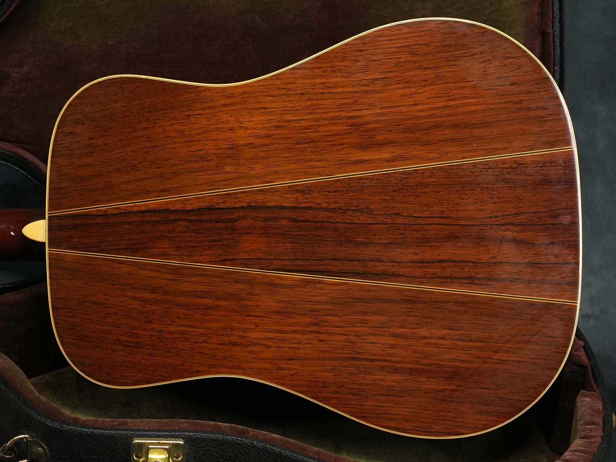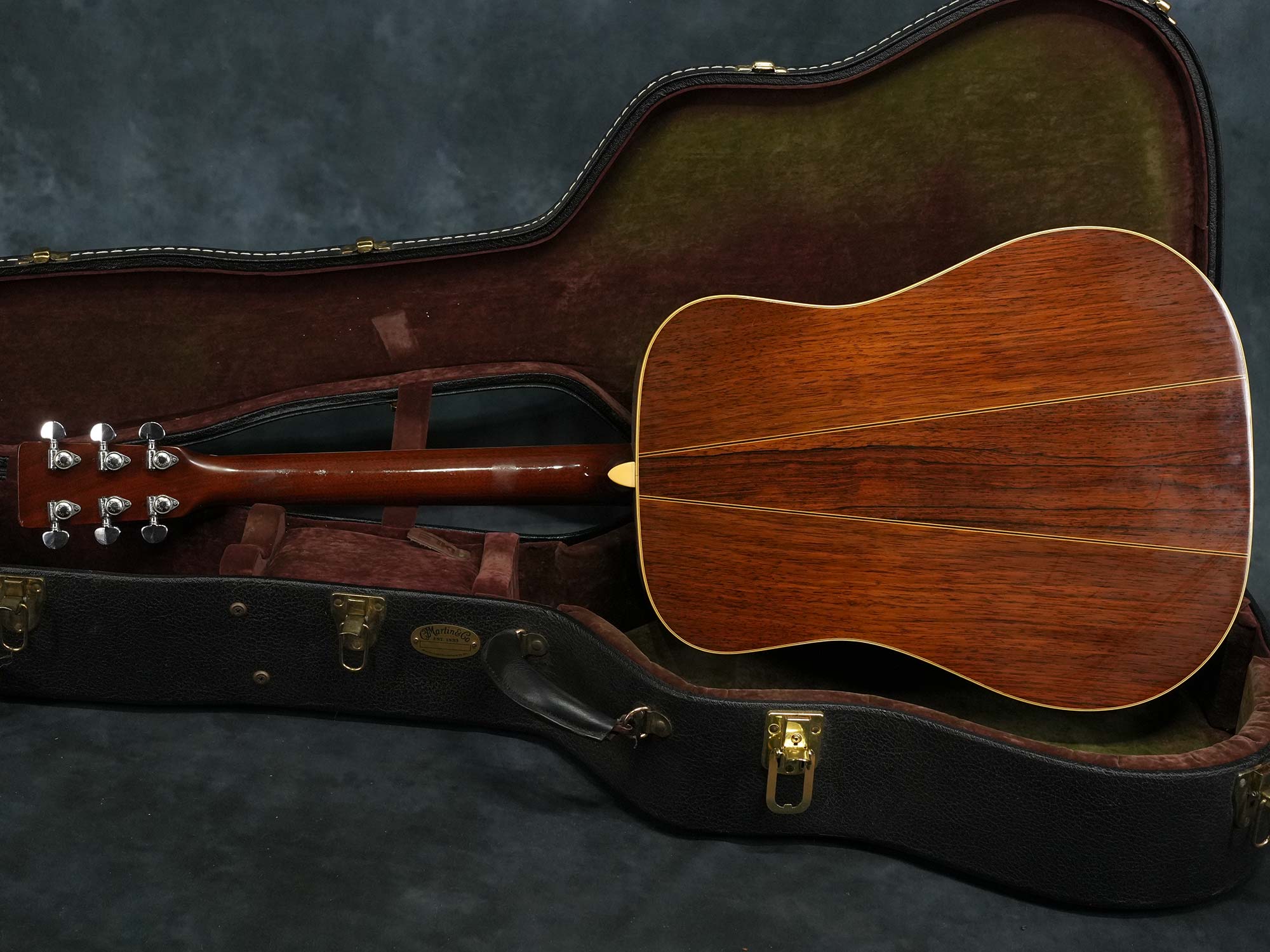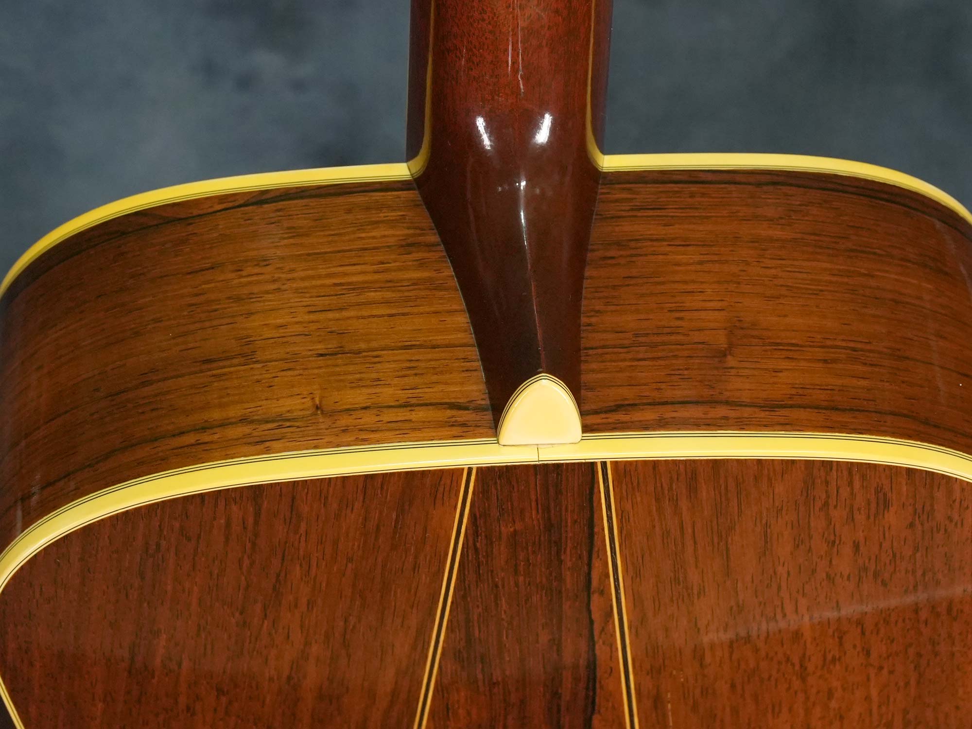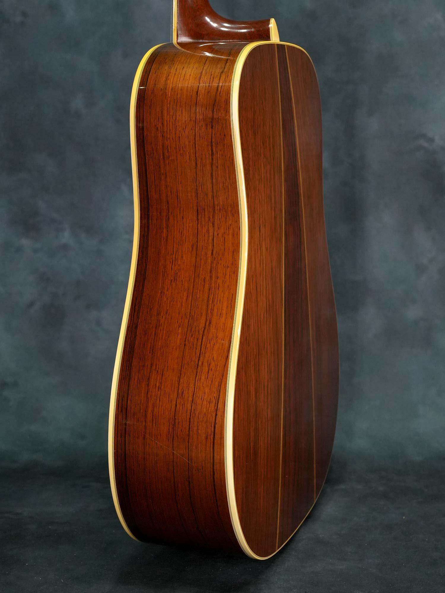 リアシフトしたノンスキャロップブレーシングにローズウッド(ハカランダ)の大きなブリッジプレートを採用する事で重めな音色になりがちな年代ながら、軽く弾いてもしっかり反応するレスポンスの良さとハカランダならではの抜けた芯の太い鳴り、ネックリペアはあるものの良く見なければ分からないような丁寧な修理がされており、心地よい響きでしっかり使えるハカランダのD-35をお探しの方にオススメの1本です。