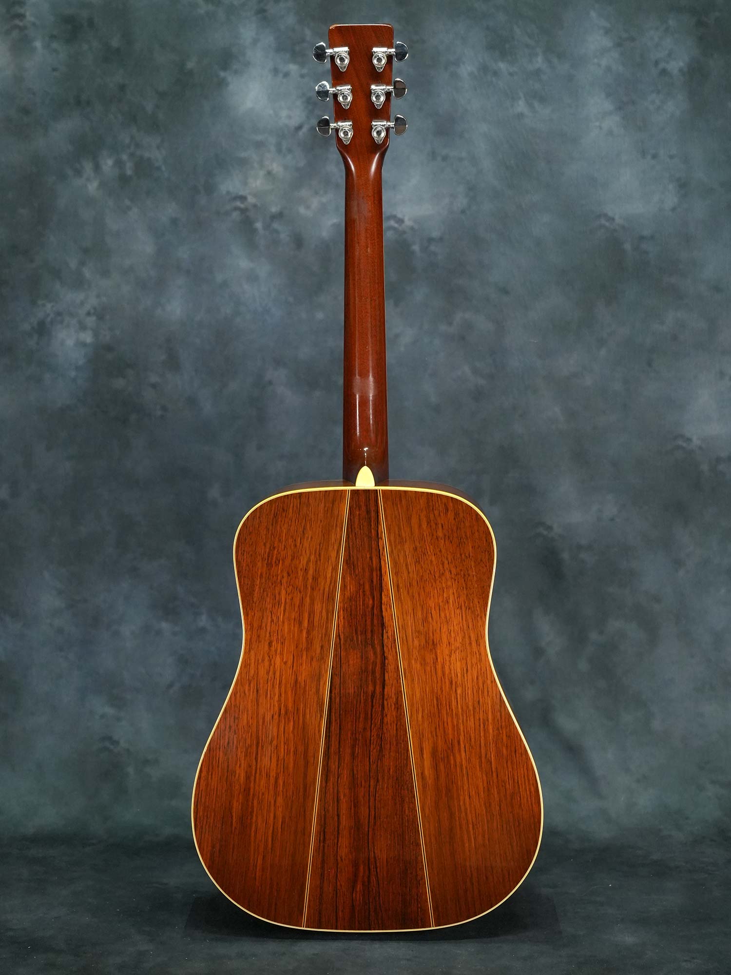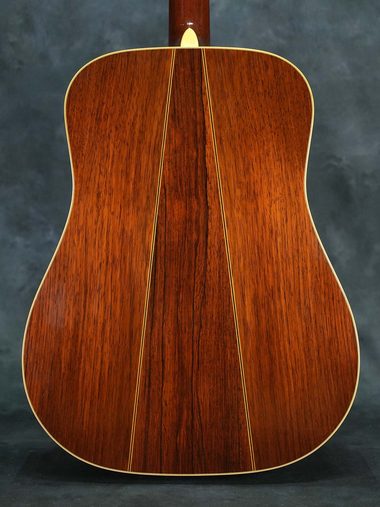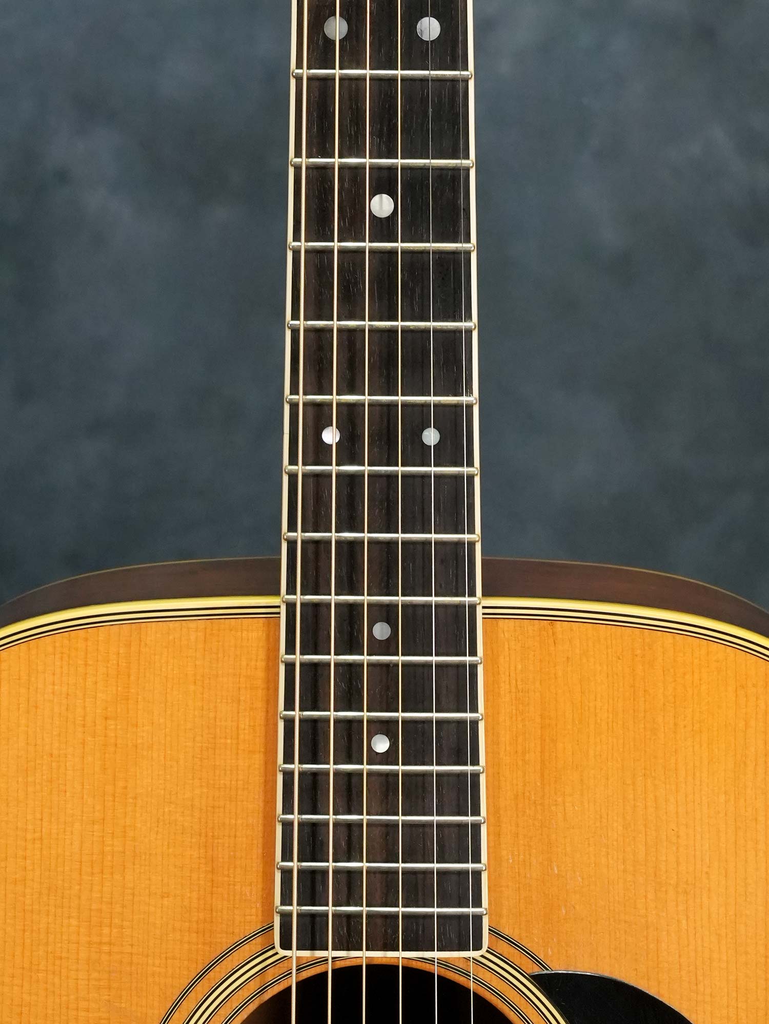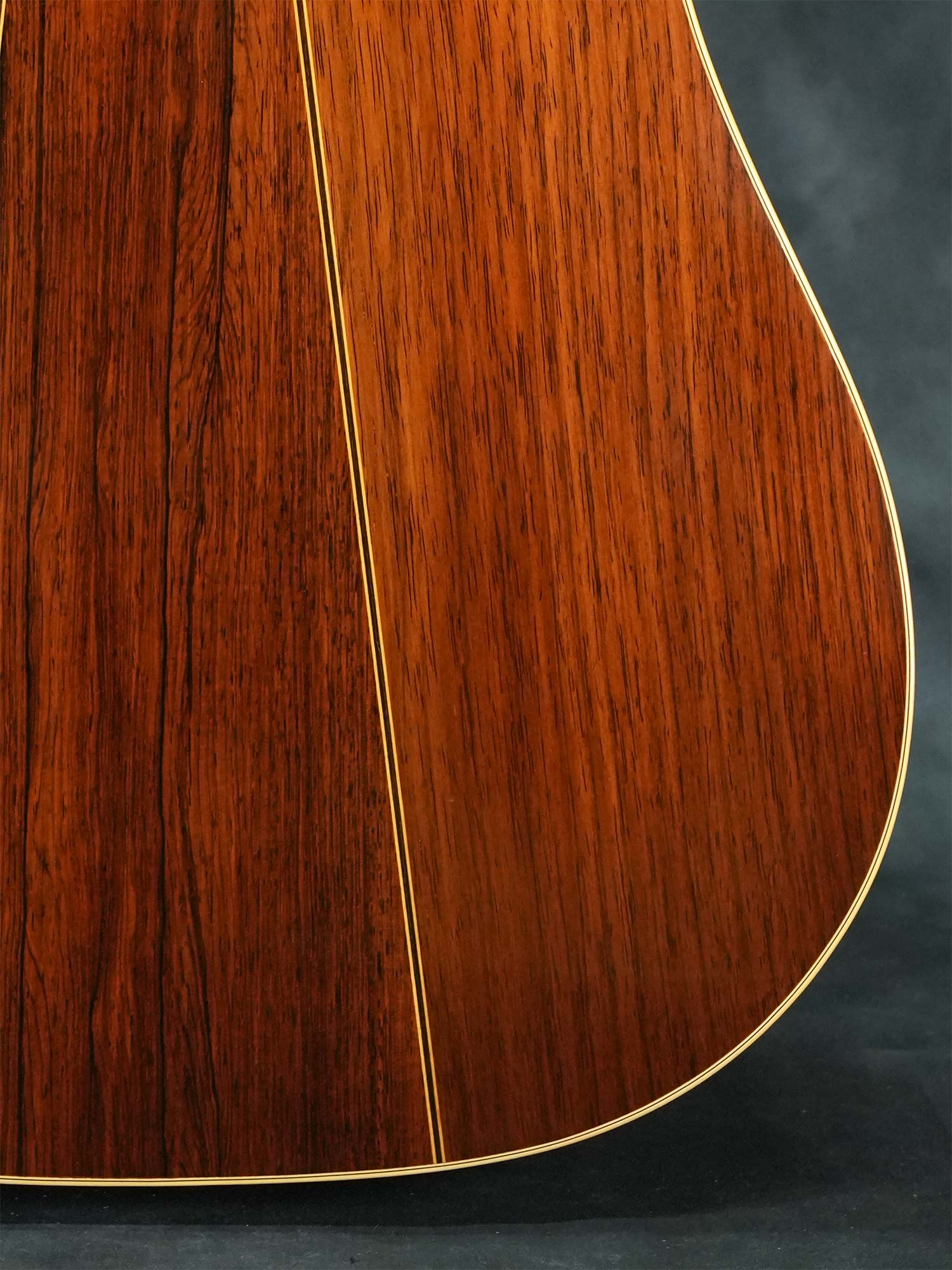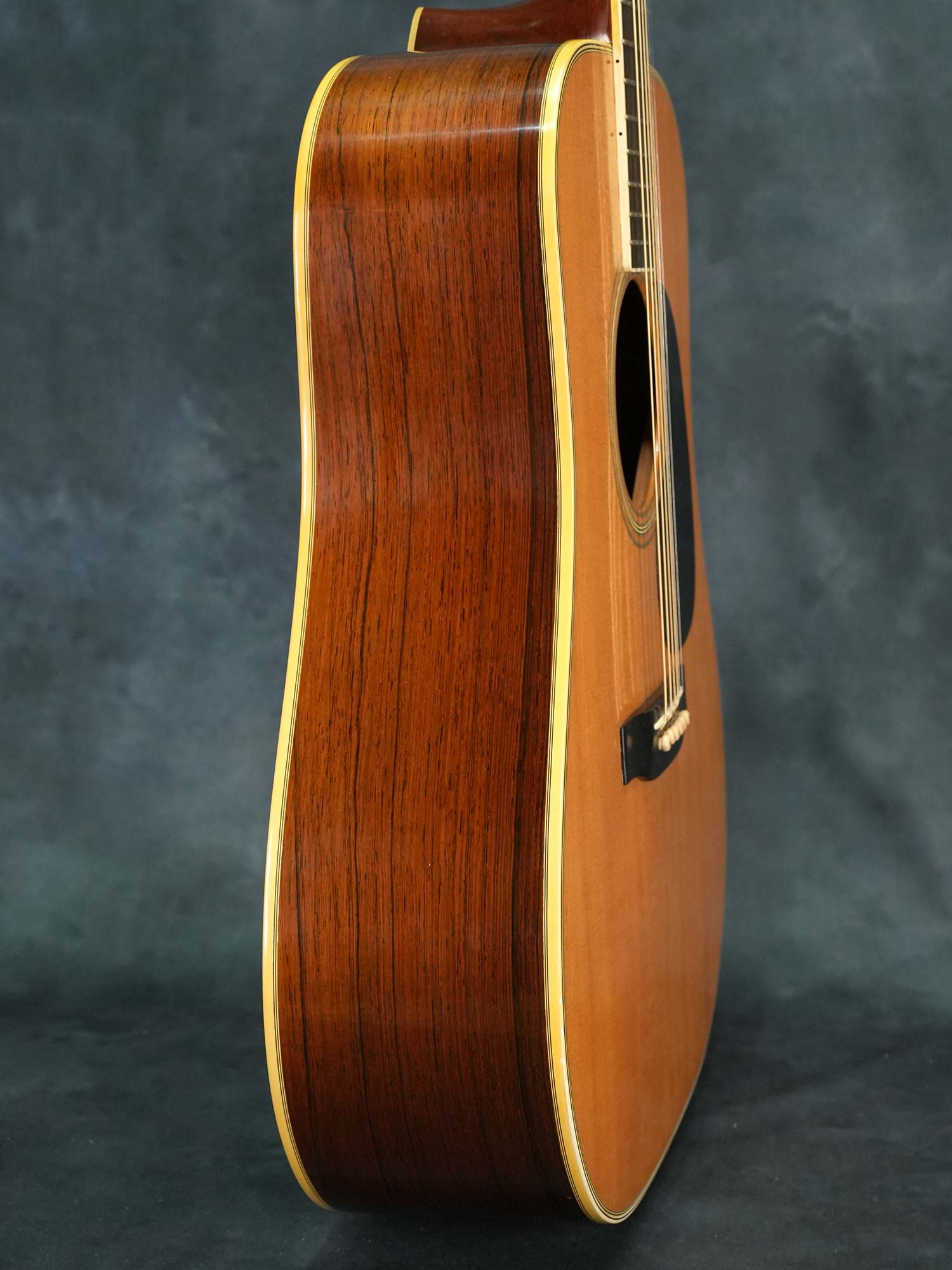 リアシフトしたノンスキャロップブレーシングにローズウッド(ハカランダ)の大きなブリッジプレートを採用する事で重めな音色になりがちな年代ながら、軽く弾いてもしっかり反応するレスポンスの良さとハカランダならではの抜けた芯の太い鳴り、ネックリペアはあるものの良く見なければ分からないような丁寧な修理がされており、心地よい響きでしっかり使えるハカランダのD-35をお探しの方にオススメの1本です。