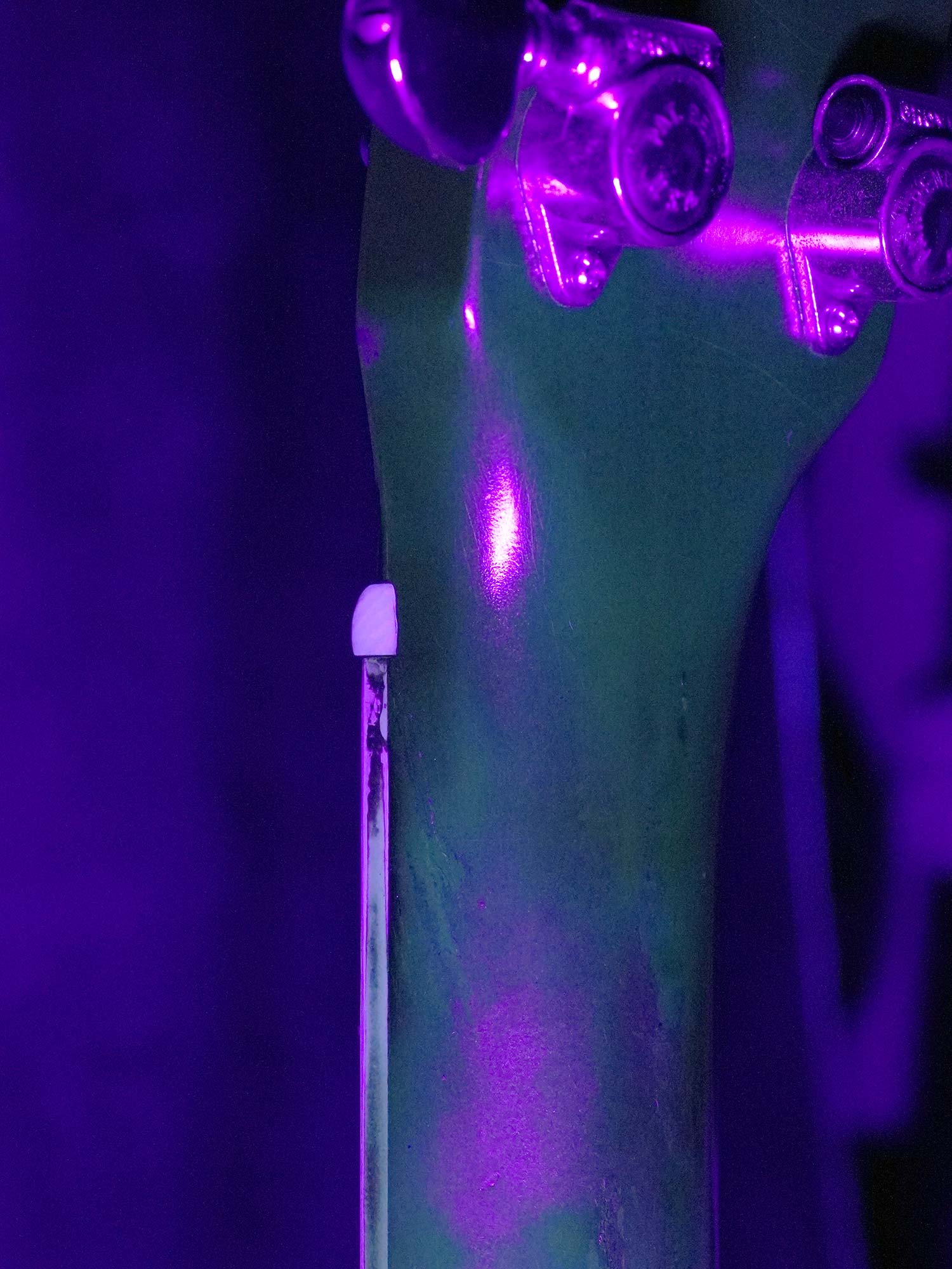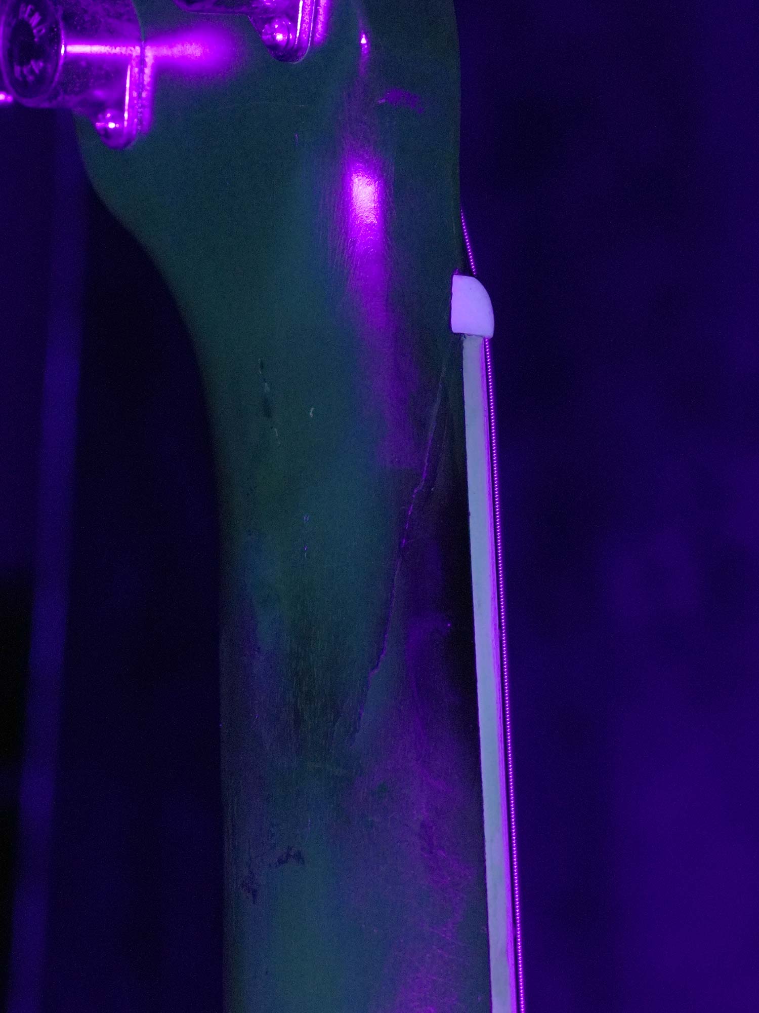 ネックはライトゲージ弦をレギュラーチューニングして軽い順反り程度で、交換されたフレットは高音弦側ローポジションを中心に減っており最も低い箇所で残り6割程度ですが、気になるようなビビりや音詰まりは無く演奏性は良好。弦高調整のため上部を削られてブリッジは少し薄くなっていますが、弦高は適正な範囲でサドルの高さも1弦側&6弦側共に僅かに余裕が有ります。
