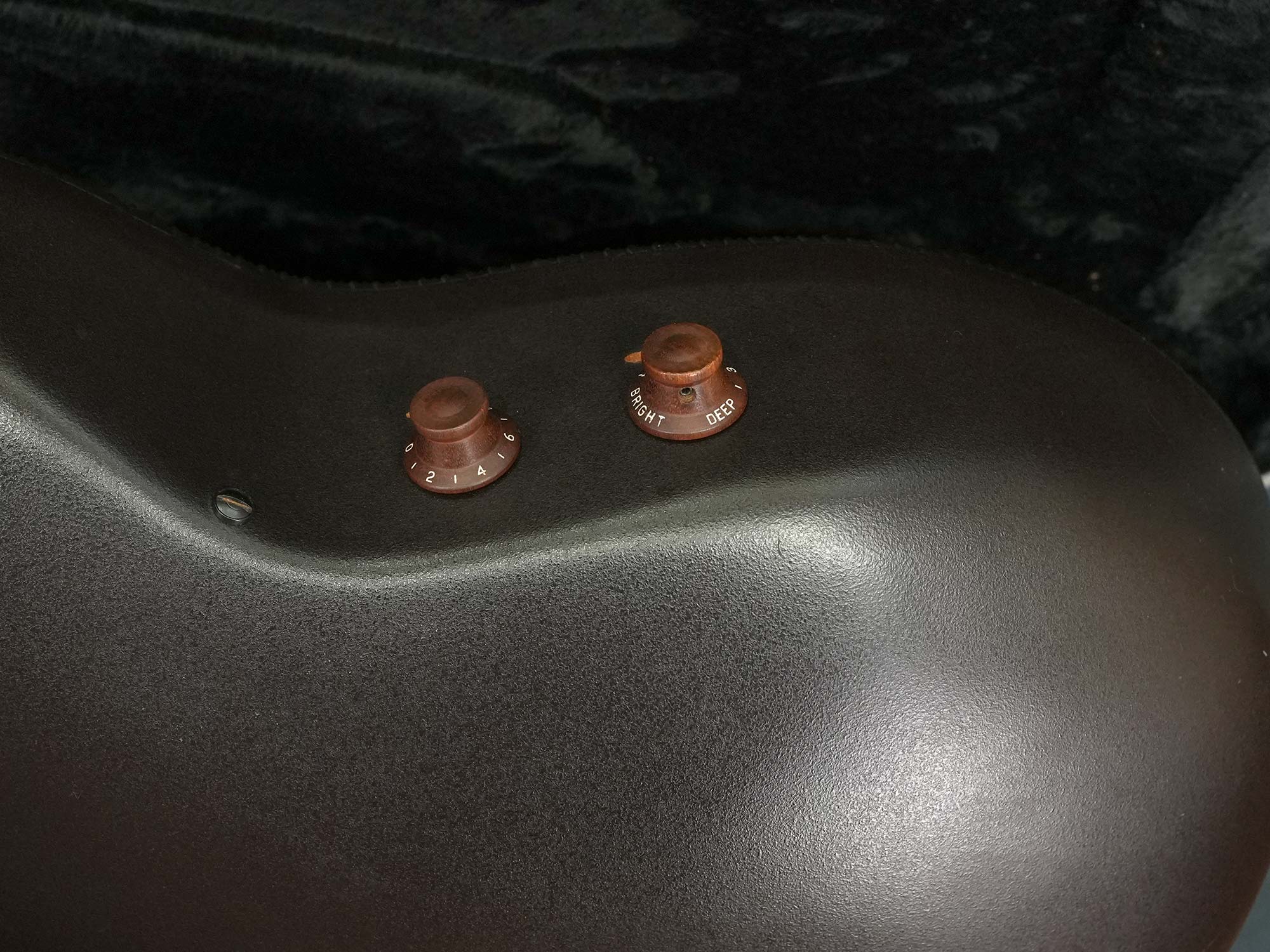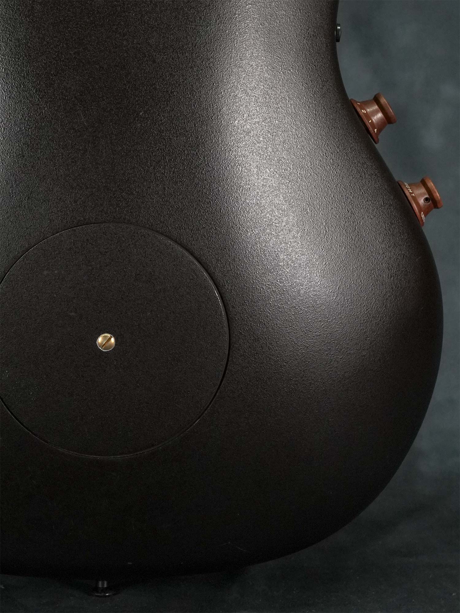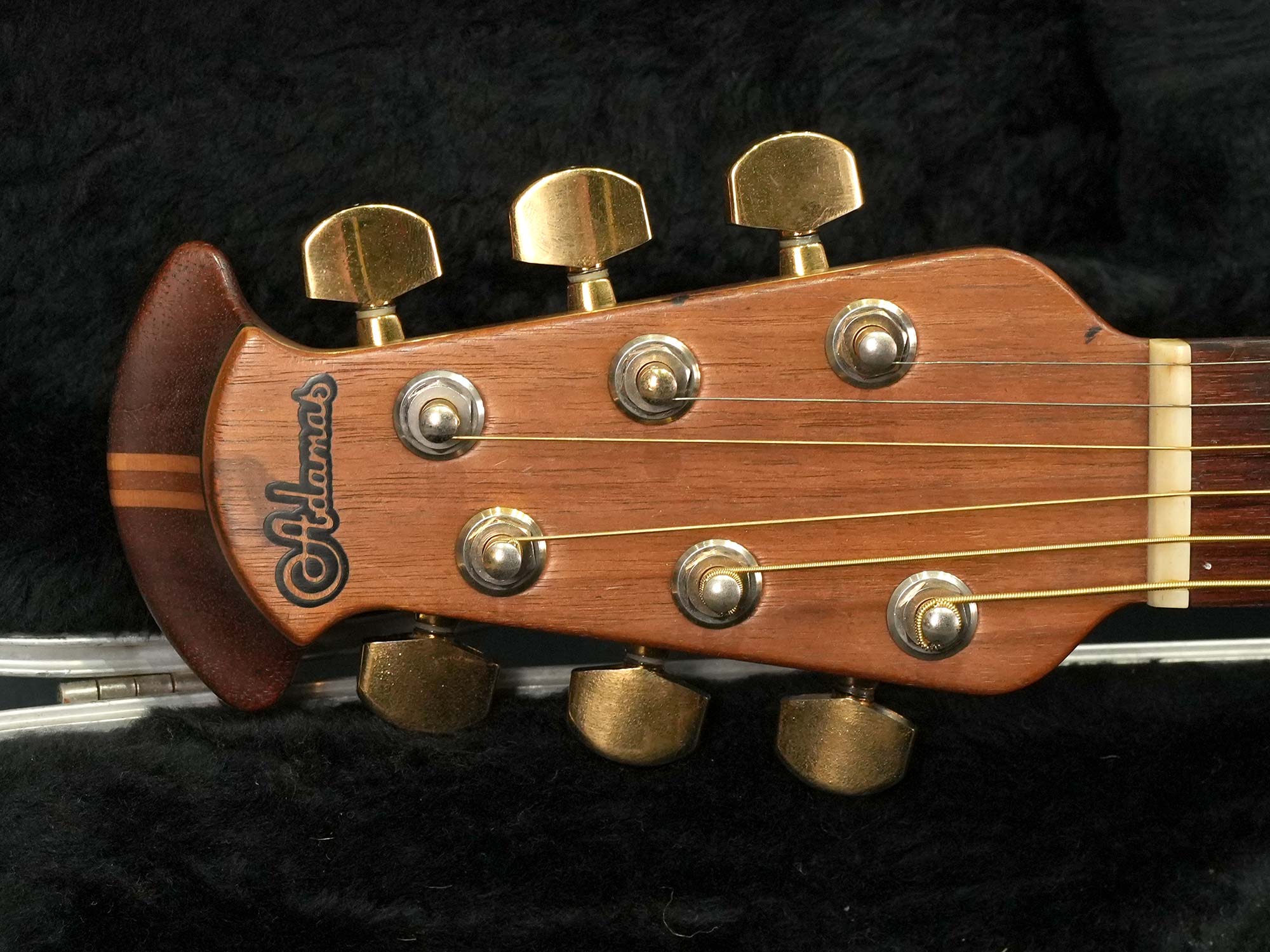 1980年代中期までの初期モデルに採用されていたウッドノブ&ステレオアウトを備えたOvation Adamas II、1995年製の中古品です。カーボングラファイトのトップに「リラコード」と呼ばれる樹脂製のディープボウルボディ、ダブルエポーレットのマルチサウンドホール、メイプルを挟んだマホガニーネック、ウォルナットの指板&ブリッジ、W.GERMANY刻印のSCHALLERペグ。本来はVolume+イコライザーの付いた「OP24」もしくはチューナーの付いた「Optima」プリアンプが搭載されている年代ながら、初期に採用されていた木製ノブでVolume&Toneのみのシンプルな通称「ウッドノブ」仕様で、一般的なモノラルアウトに加えて奇数弦と偶数弦を別々に出力するステレオアウトプットも備えています。